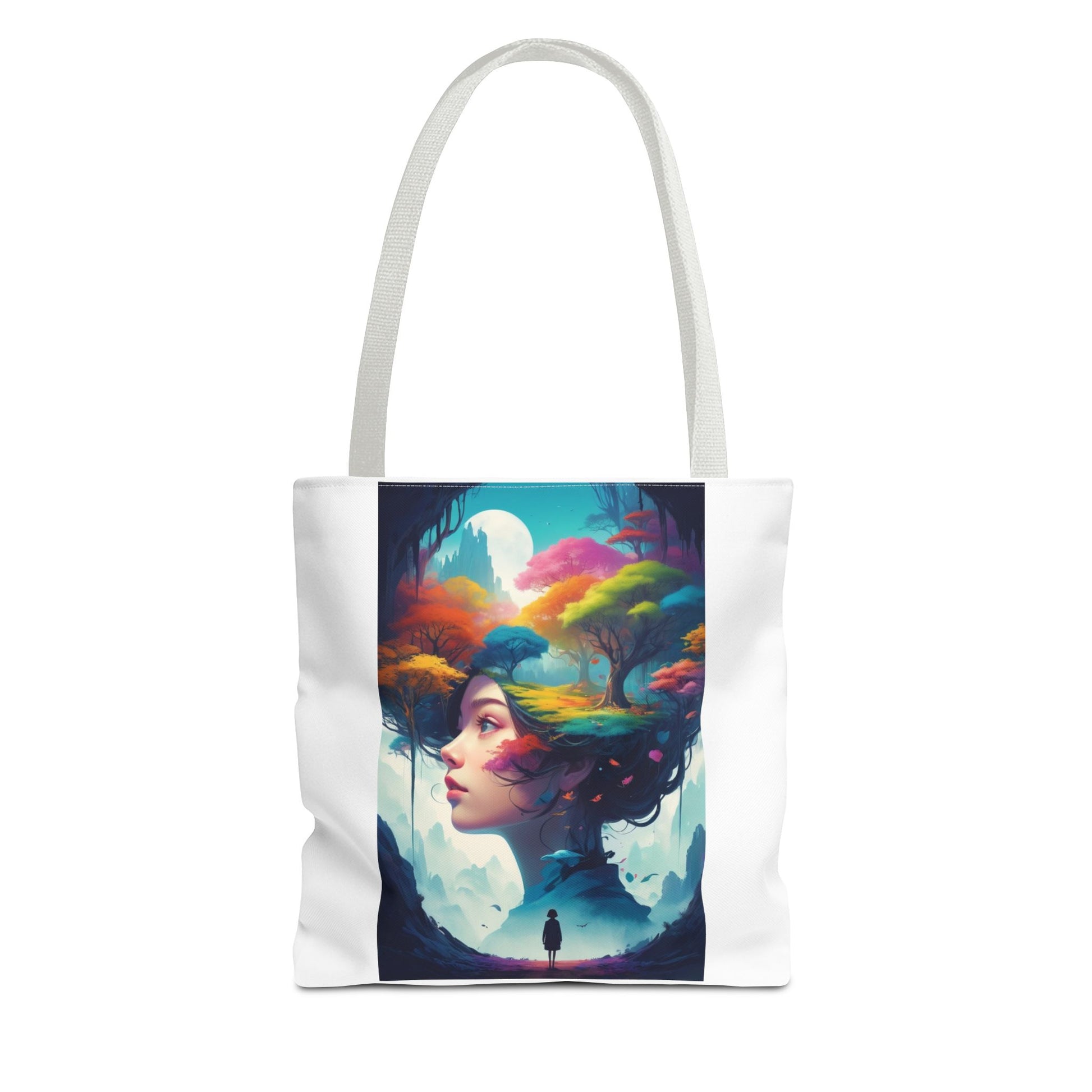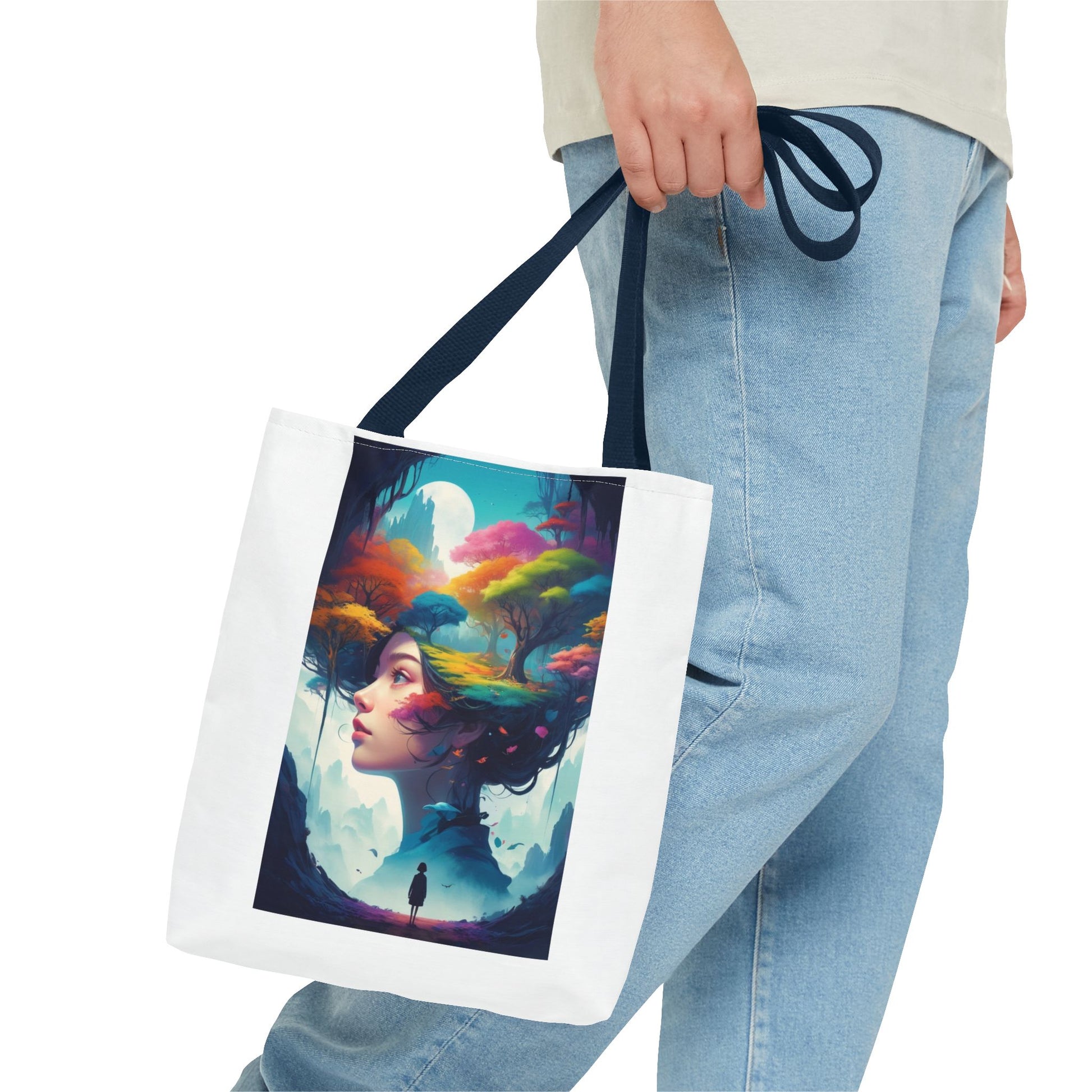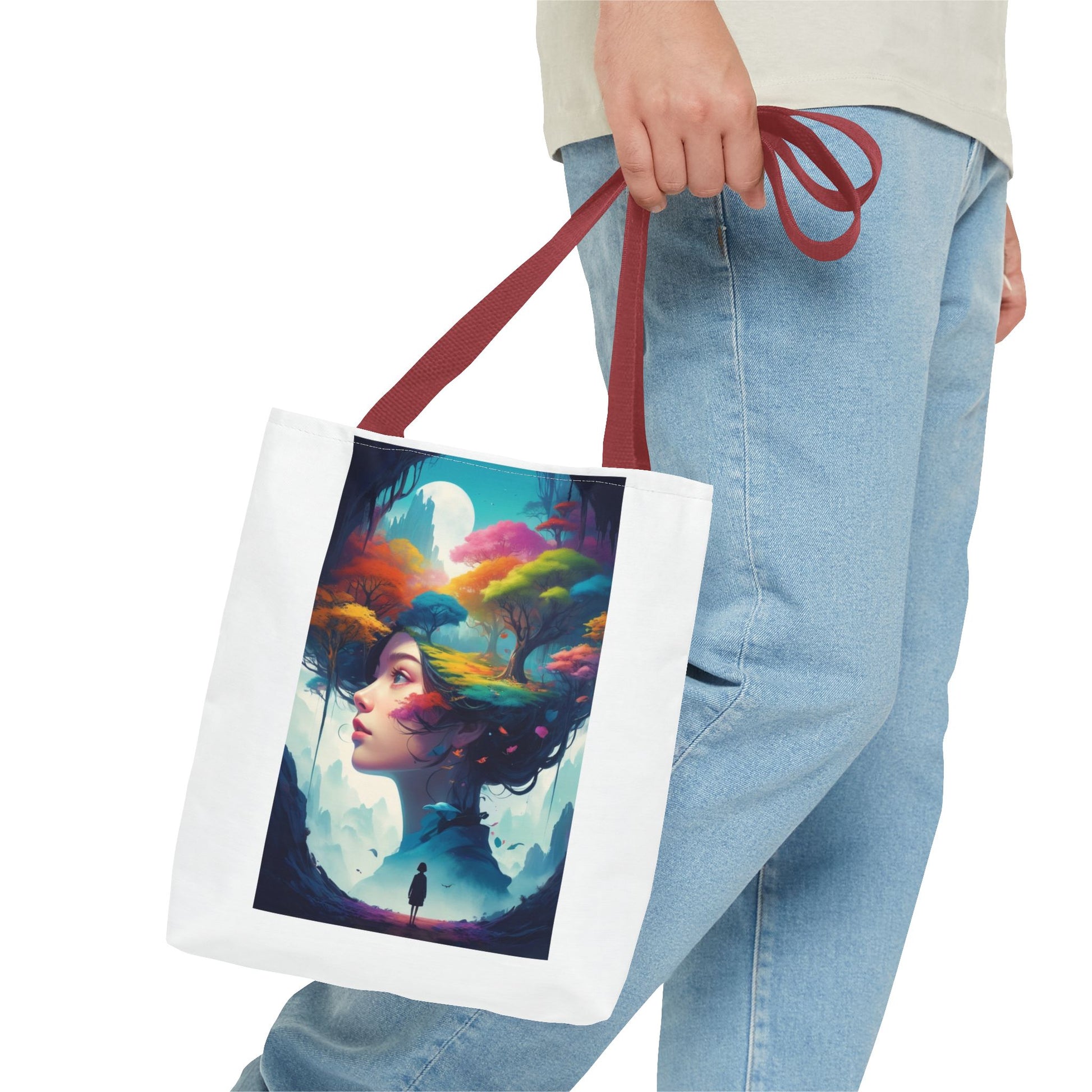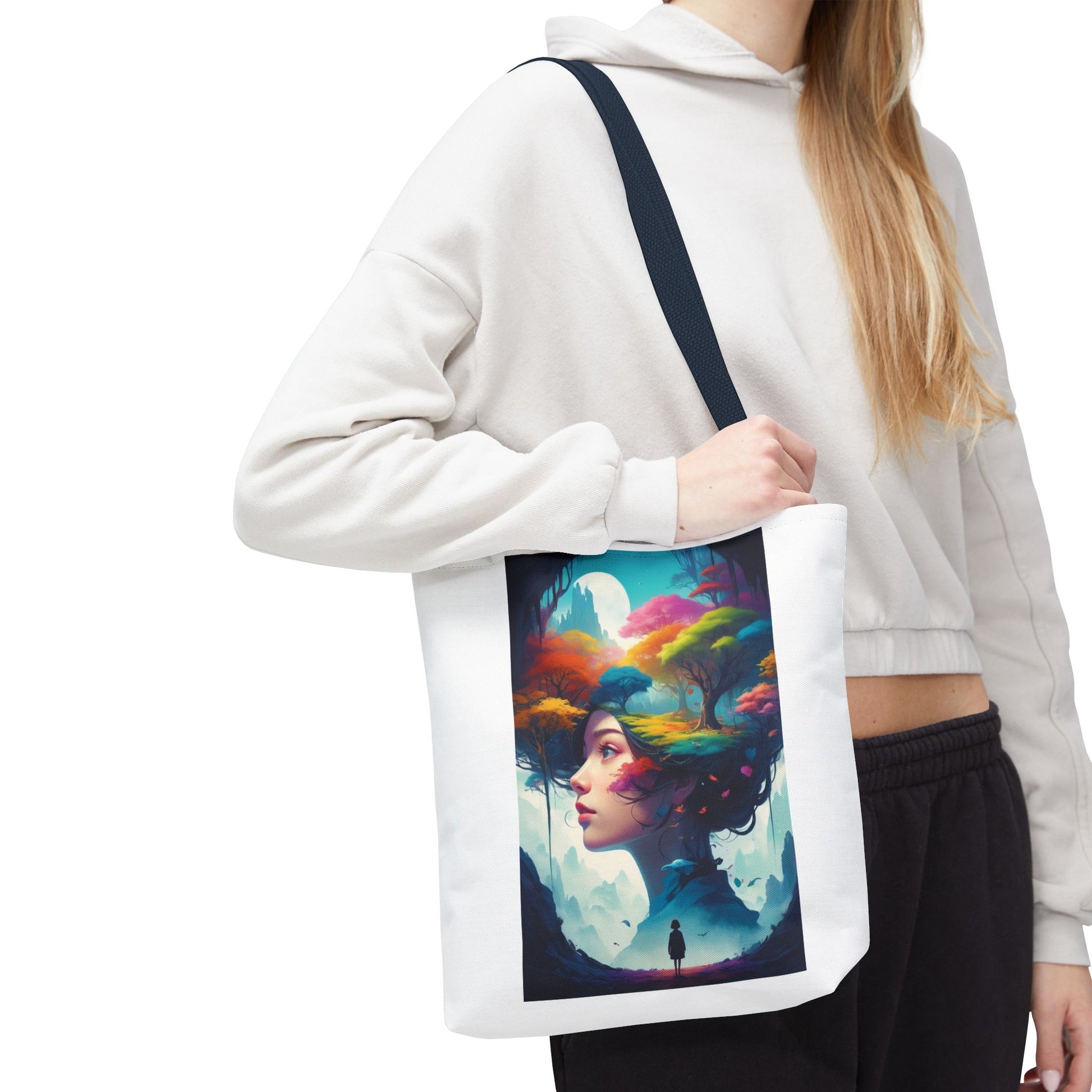 Surreale Traumlandschaft-Tragetasche – Bunte Frau & Waldmotiv