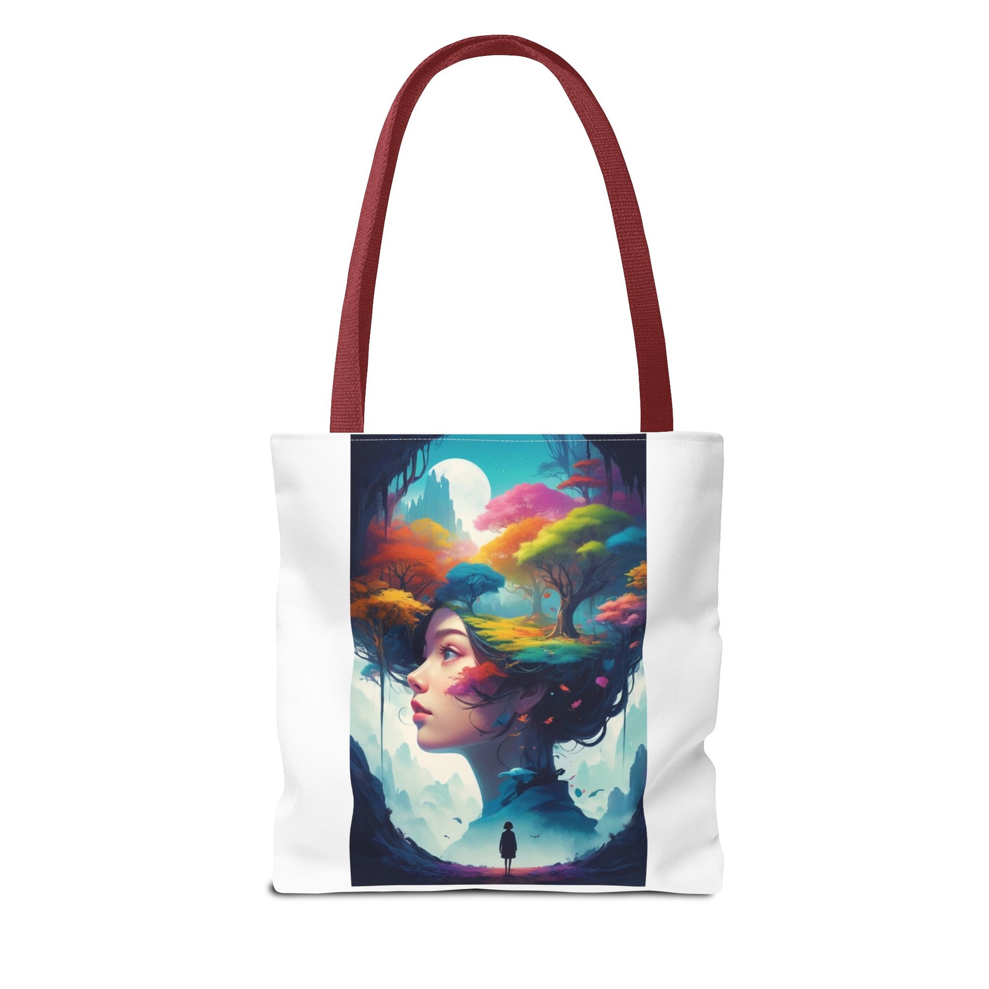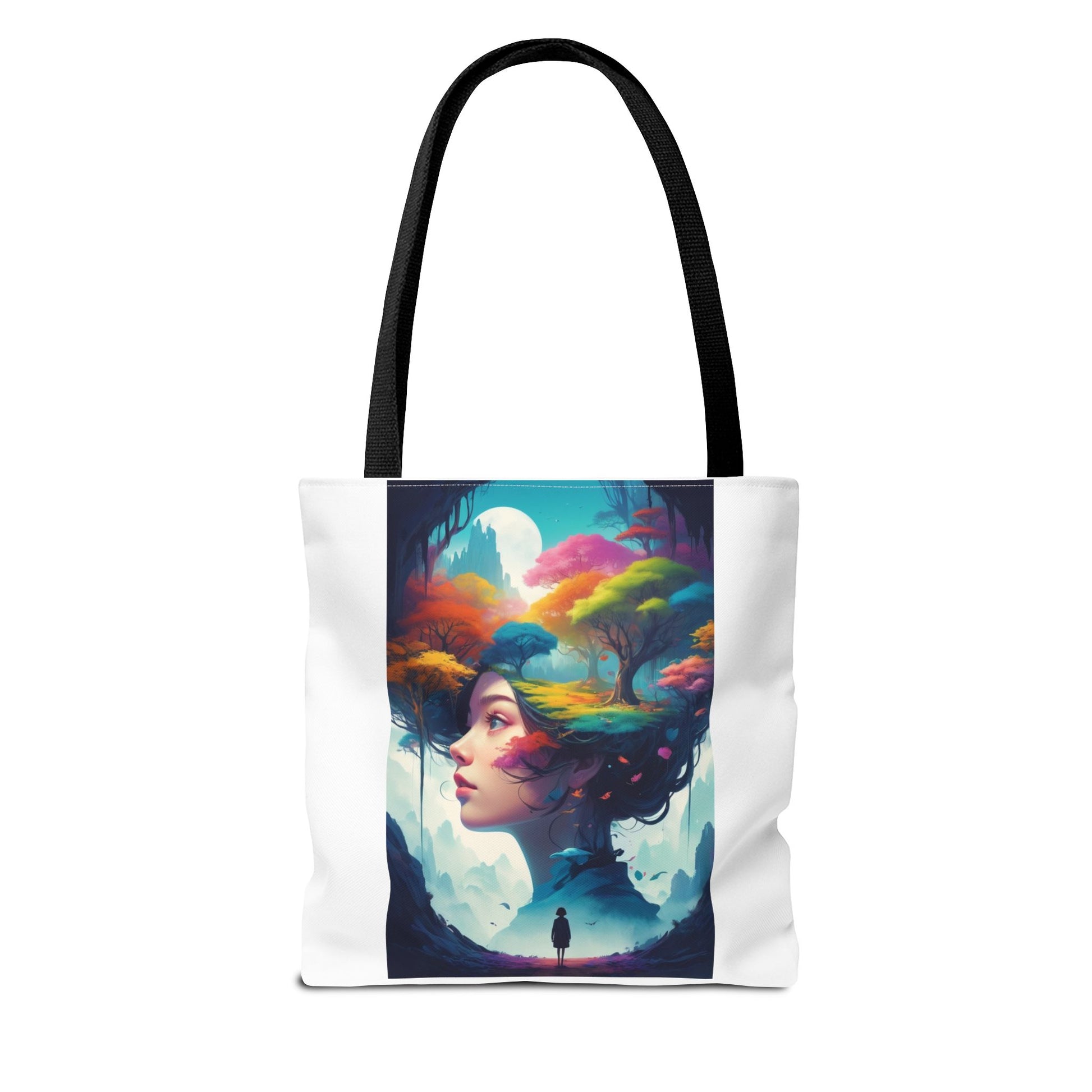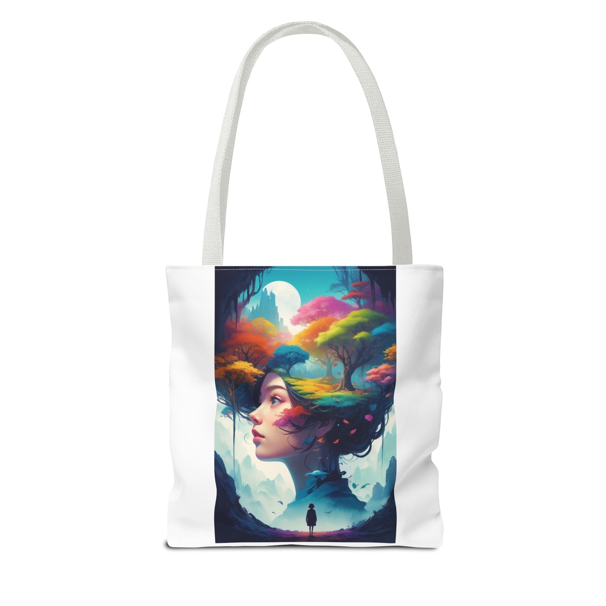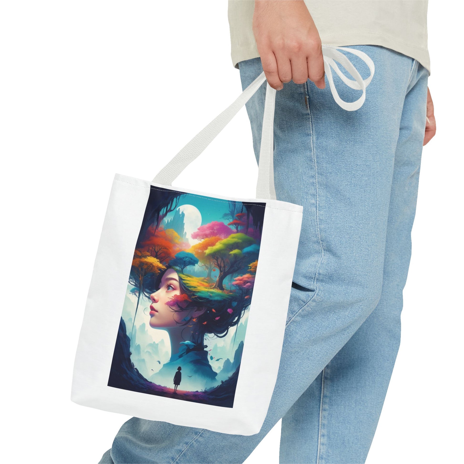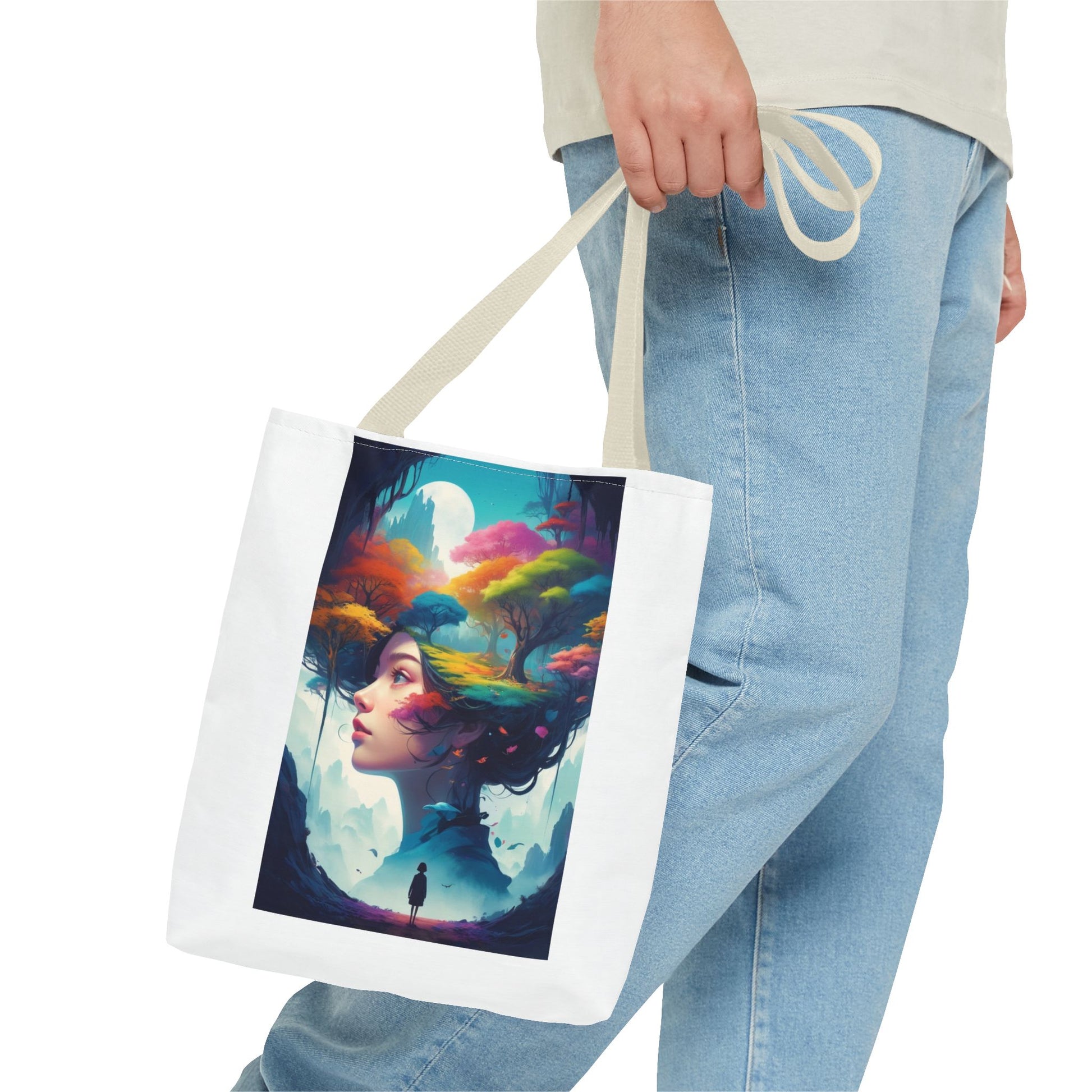 Surreale Traumlandschaft-Tragetasche – Bunte Frau & Waldmotiv