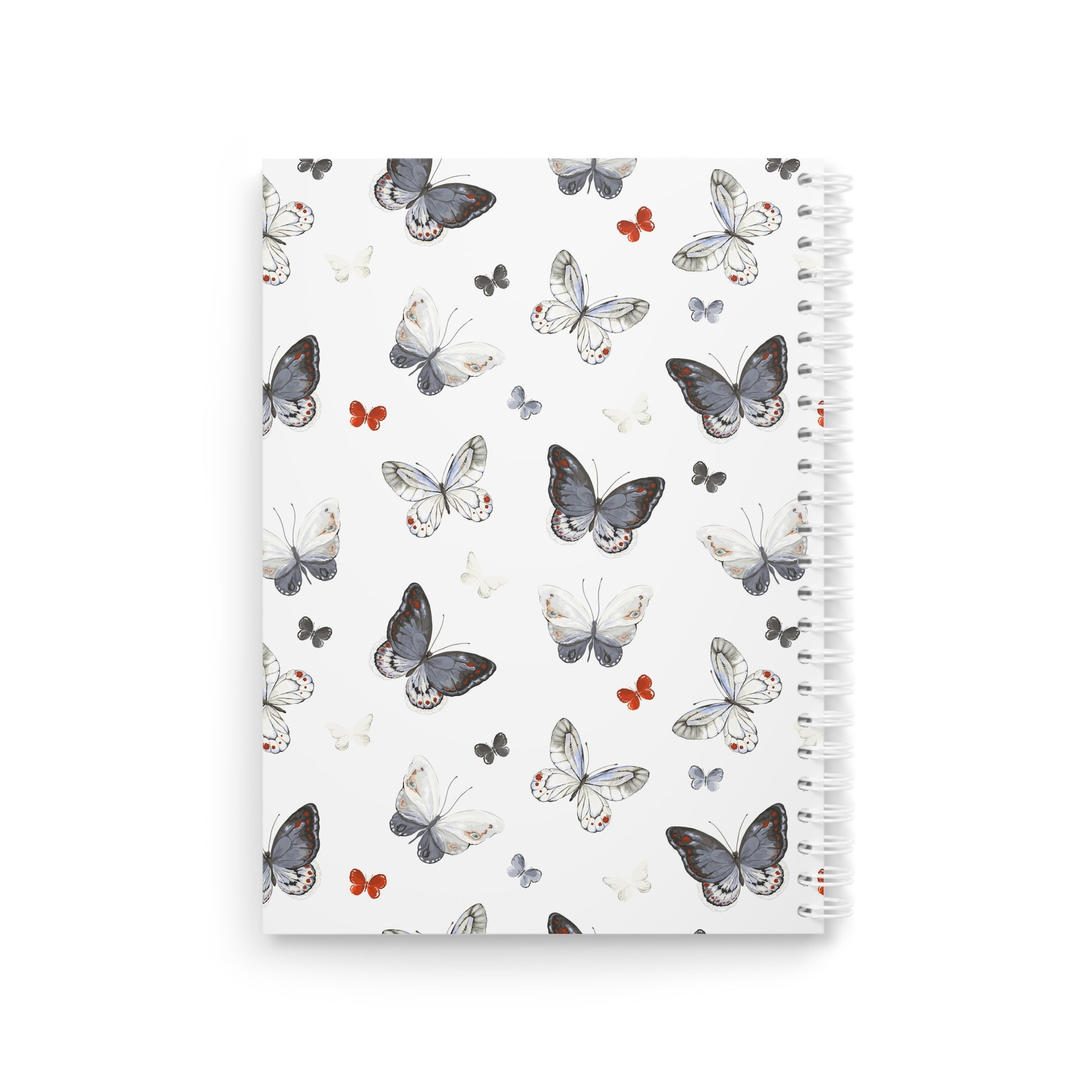 Convierte momentos cotidianos en rituales tranquilos y hermosos con este cuaderno espiral con estampado de mariposas. Cada página te invita a escribir, dibujar o planificar con serenidad y concentración. La suave cubierta blanca, salpicada de delicadas mariposas en grises apagados y un toque de cálido óxido, aporta un toque ligero y natural a tu escritorio o bolso. El suave papel rayado de 90 g/m² se siente firme al tacto, mientras que la espiral metálica blanca permite que las páginas queden planas o se puedan extraer fácilmente. Mantén tus pensamientos, listas e ideas organizados en 128 páginas rayadas, enmarcadas por una cubierta semibrillante y duradera, impresa por ambas caras.