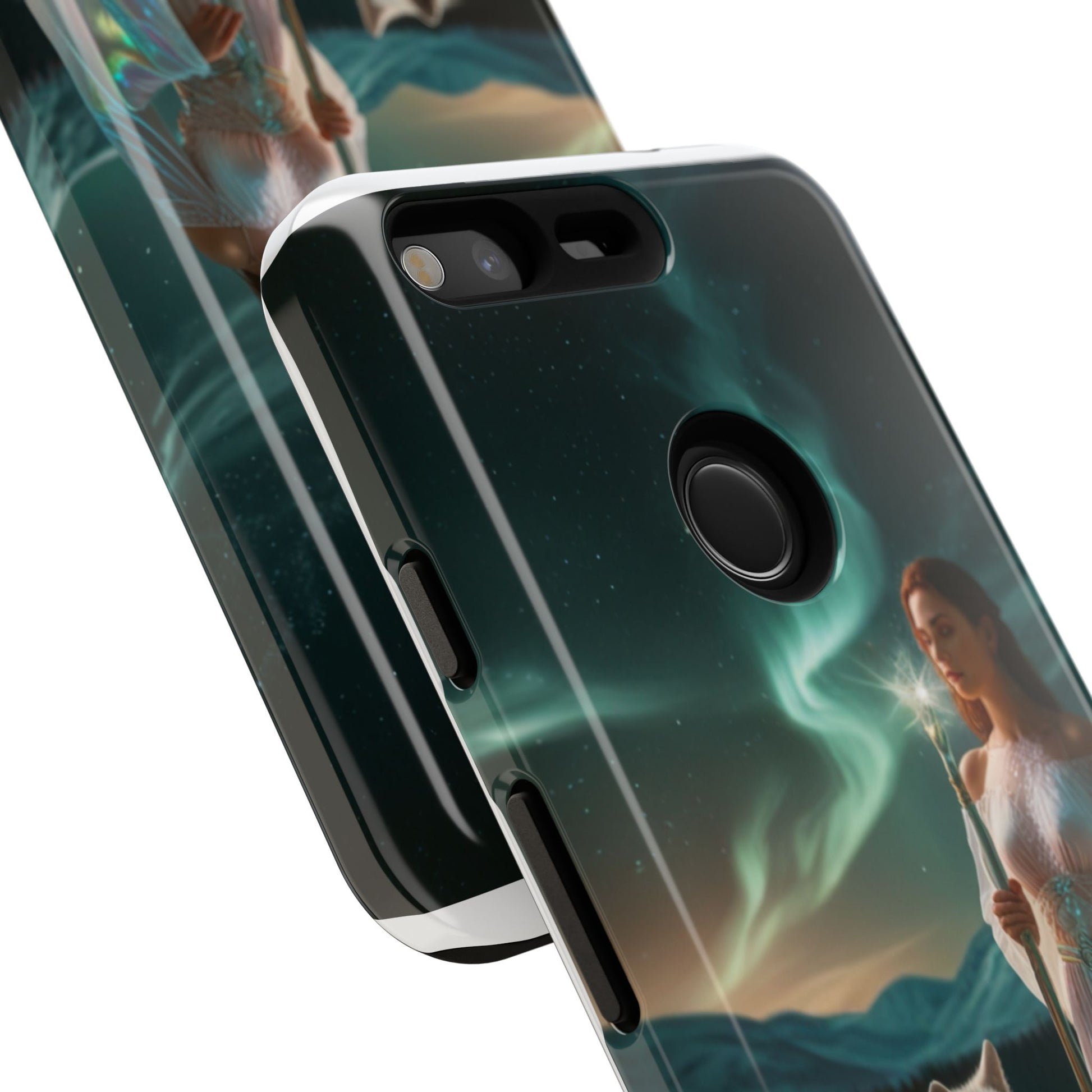 Una funda para teléfono resistente y elegante que se siente como un pequeño talismán para las noches bajo la aurora. La funda envuelve una luminosa escena de fantasía —una mujer serena con túnicas ondulantes y un lobo guardián bajo la brillante aurora boreal— sobre una carcasa brillante o mate. Su construcción de doble capa (carcasa exterior de policarbonato + revestimiento de silicona TPU) absorbe los golpes y resiste las caídas, a la vez que mantiene los puertos despejados y la carga inalámbrica en funcionamiento. La protección UV preserva esos intensos tonos verde azulado y aurora en exteriores, y la impresión 3D envolvente le da a la imagen profundidad y continuidad en los bordes. Se lleva como una protección práctica, pero se lee como una historia: fuerza silenciosa, largas caminatas bajo cielos fríos y la compañía constante de un compañero fiel.