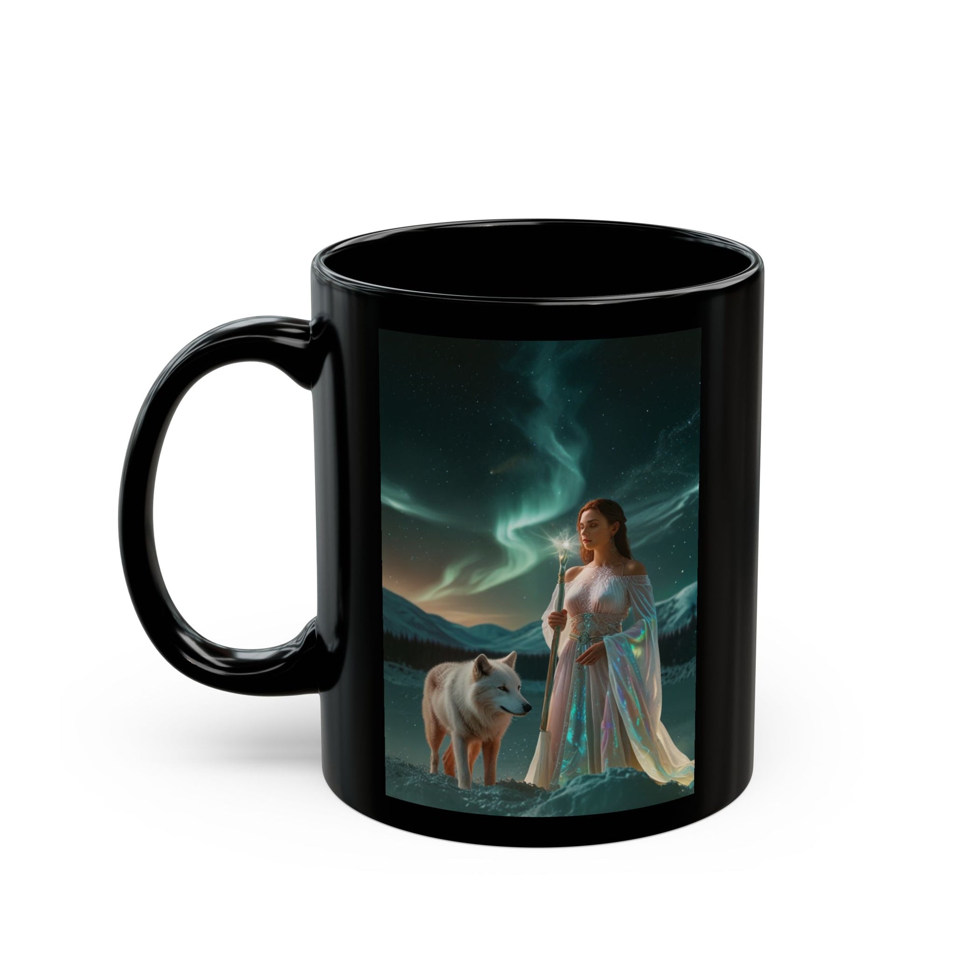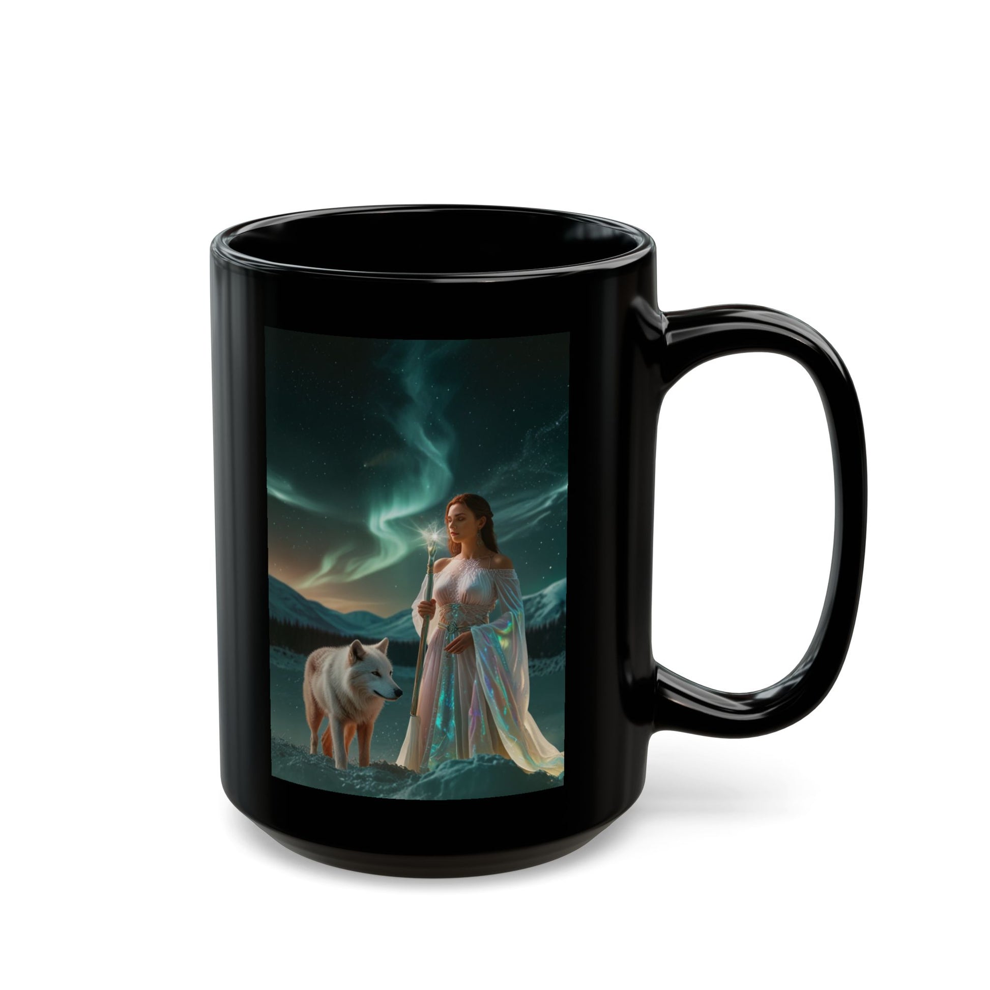 Una taza de cerámica negra brillante que transmite una energía serena y narrativa. Tonos de medianoche envuelven una escena serena: una mujer con túnicas ondulantes se encuentra junto a un lobo blanco vigilante bajo una aurora boreal. Un café caliente o un té refrescante se convierten en parte de ese momento: una pausa suave antes del amanecer. El fondo negro intenso crea una ventana a un paisaje nocturno, mientras que el robusto asa en forma de C mantiene el ritual confortable. Esta taza es ideal para mañanas tranquilas, sesiones de escritura nocturnas o conversaciones a la luz de las velas donde la imaginación es bienvenida.