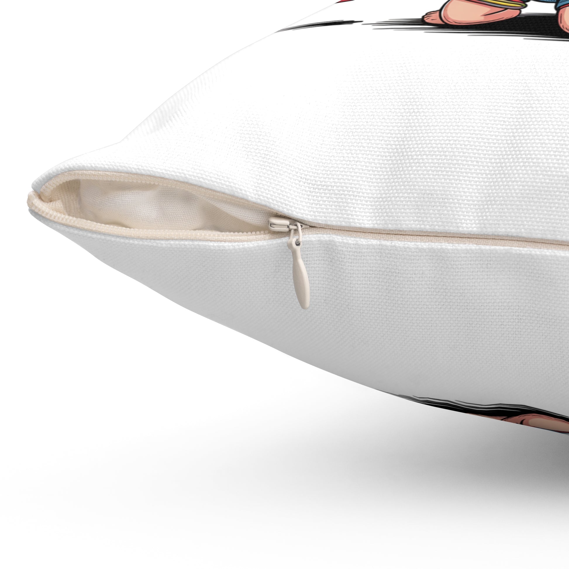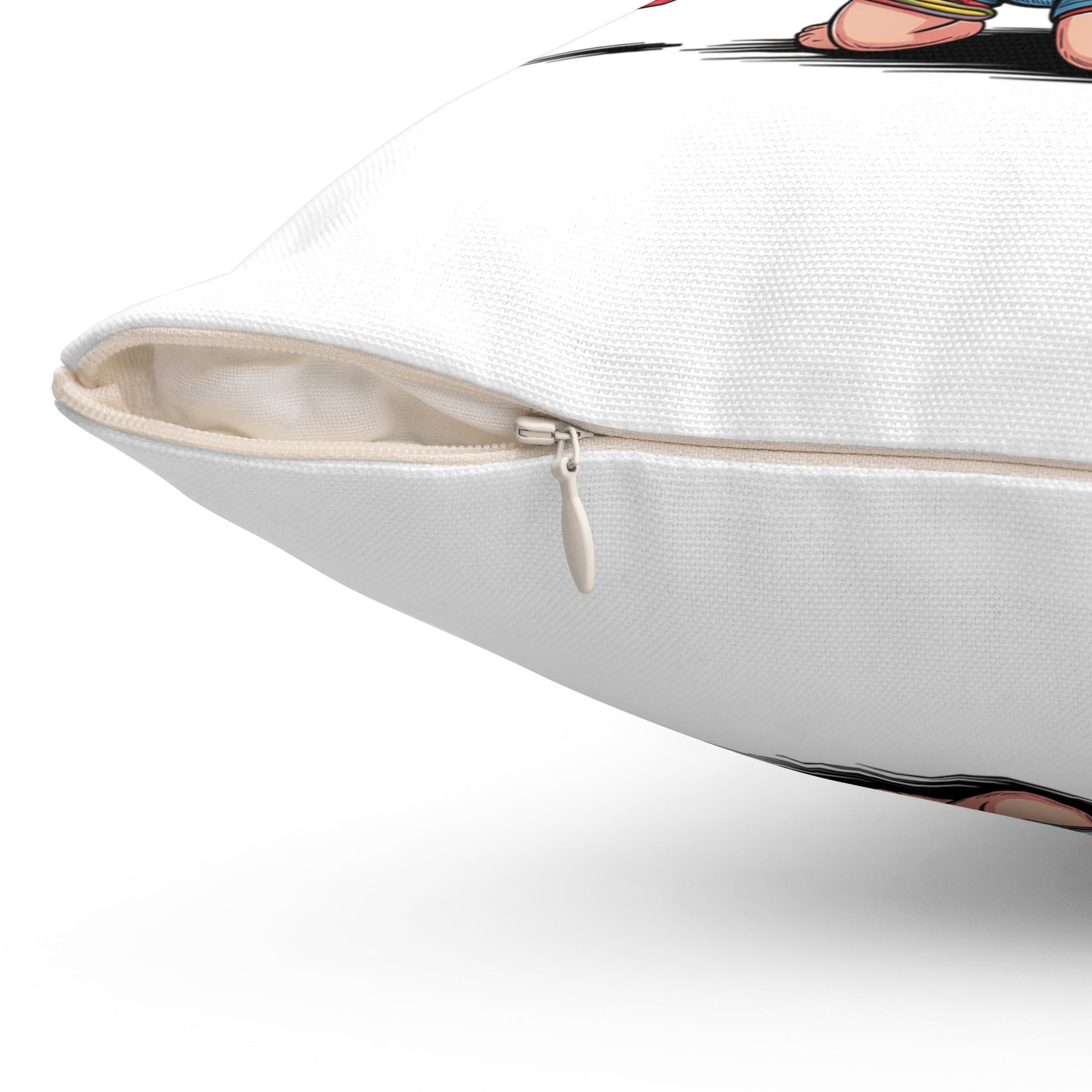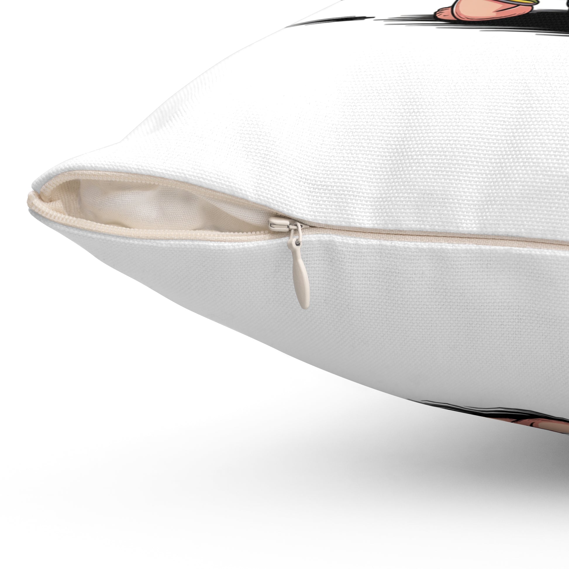 Materials are durable and low-maintenance. The spun-polyester cover resists wrinkles and stays bright after everyday use. A concealed beige zipper keeps the silhouette clean while making the insert easy to remove. The overall look is fun, irreverent, and made to last through many movie nights and sarcastic smirks.