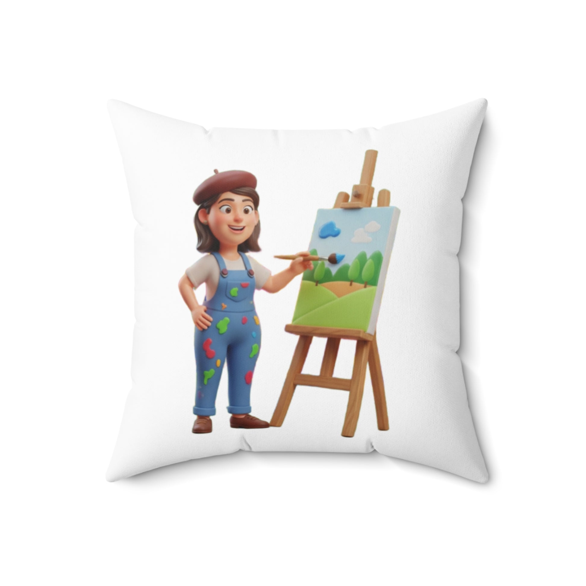 Soft, square throw pillow that brings a cheerful, artsy accent to any creative nook. The double-sided print showcases a friendly painter character at an easel—bright, whimsical, and full of color—so the cushion reads like a small piece of illustration art. The spun polyester cover holds its shape and resists wrinkles, while the recycled polyester insert is slightly larger than the cover to give a lively, plump finish once assembled. A discreet beige zipper keeps the look clean and lets the image sit uninterrupted. Tuck it on a studio chair, a reading corner, or a couch to add a playful, handmade-studio vibe that welcomes long sketching sessions and relaxed afternoons.