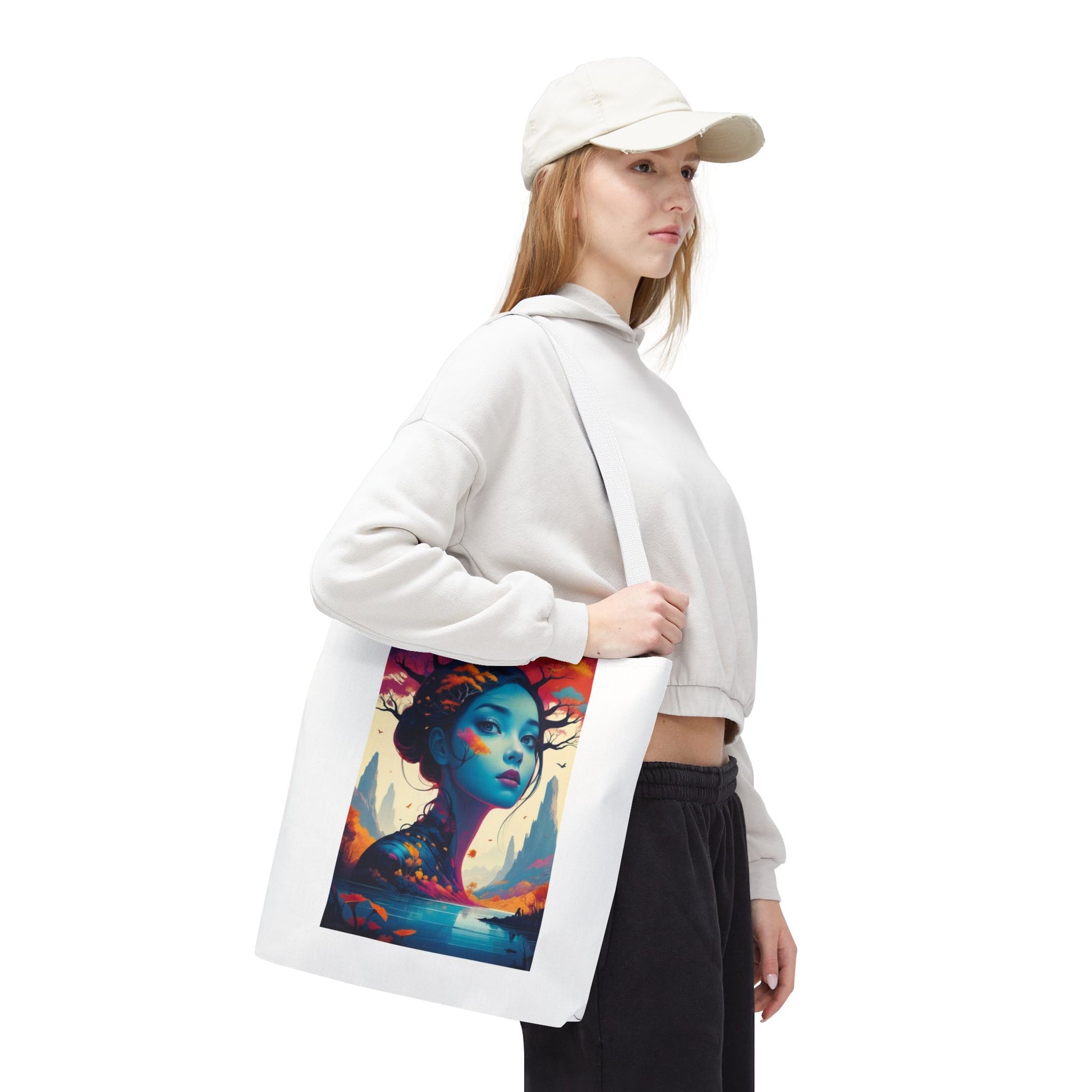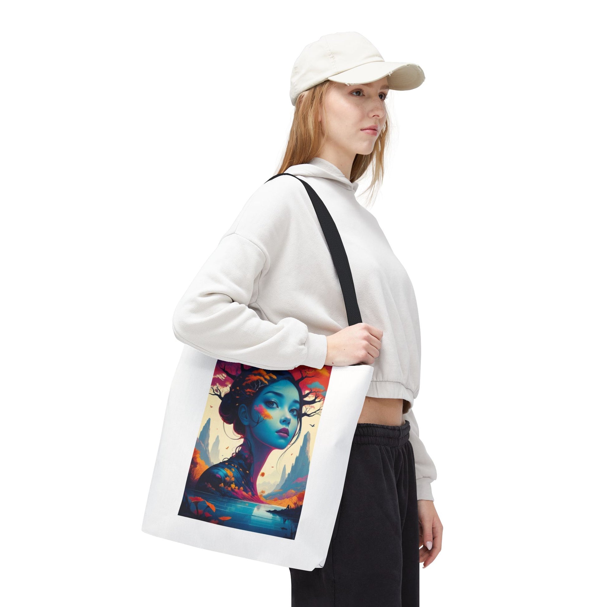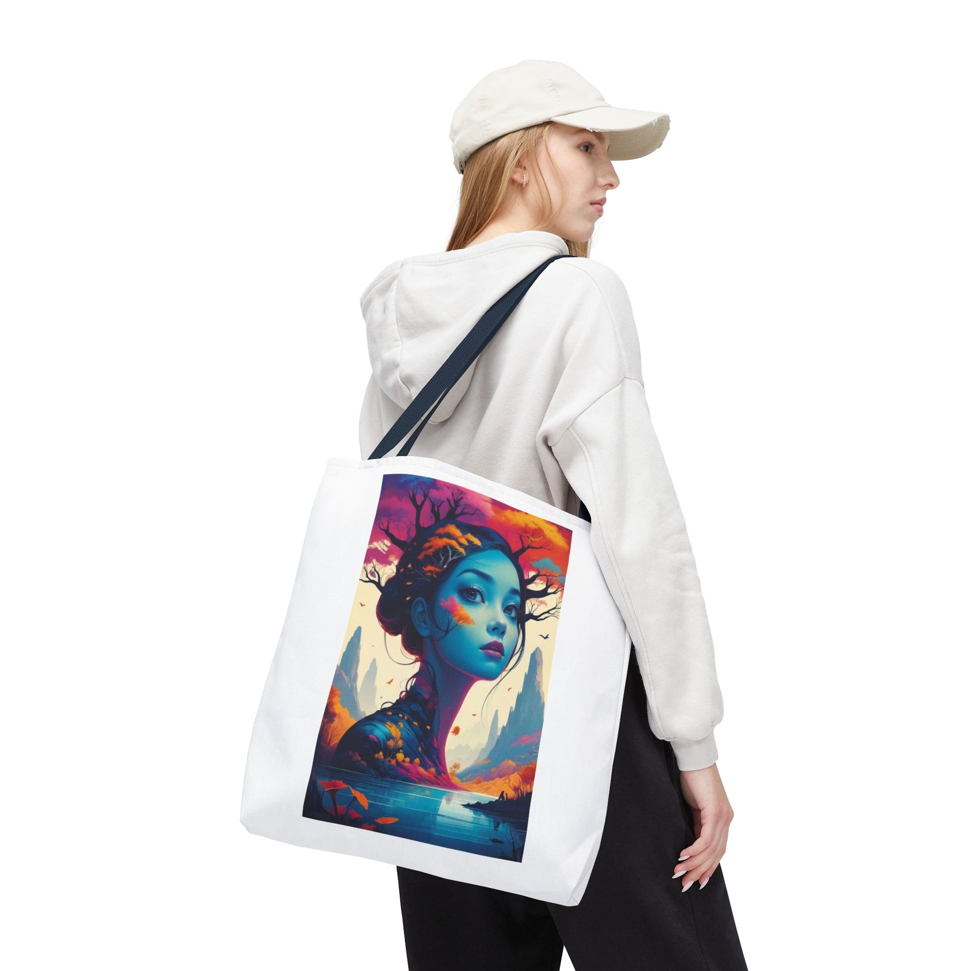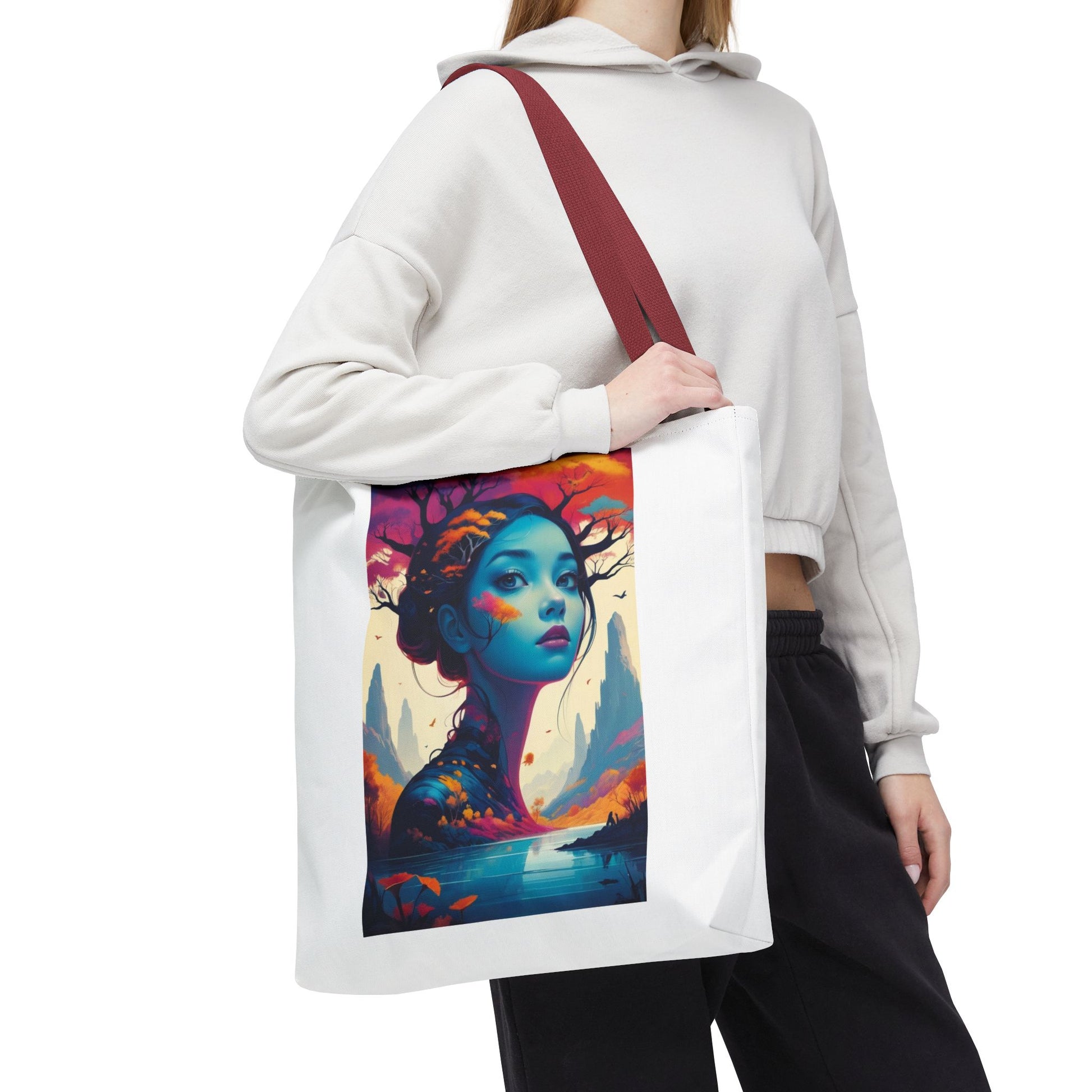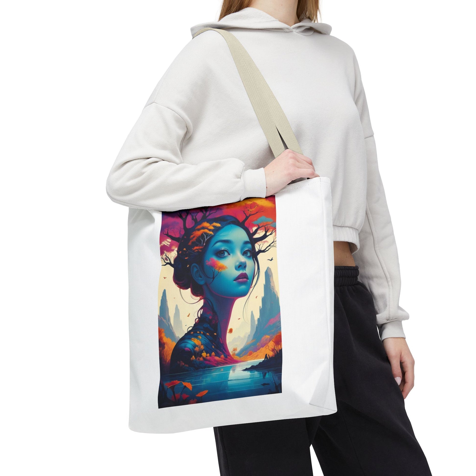 Carry a small world on your shoulder. This sturdy tote blends bold, dreamlike art with everyday practicality: a blue-skinned, tree-crowned figure rises from a lake beneath a sunset sky, turning routine errands into moments of quiet wonder. Lightweight yet durable polyester holds its shape through commutes, market runs, or museum days. Boxed corners and reinforced handles give extra room and strength so the bag stays graceful even when it’s full. The artwork-centered front keeps the image vivid and centered, while the black-stitched lining and handle options add a refined, finished look. Bring a touch of surreal, nature-infused portraiture into daily life — a subtle way to carry creativity and calm wherever you go.