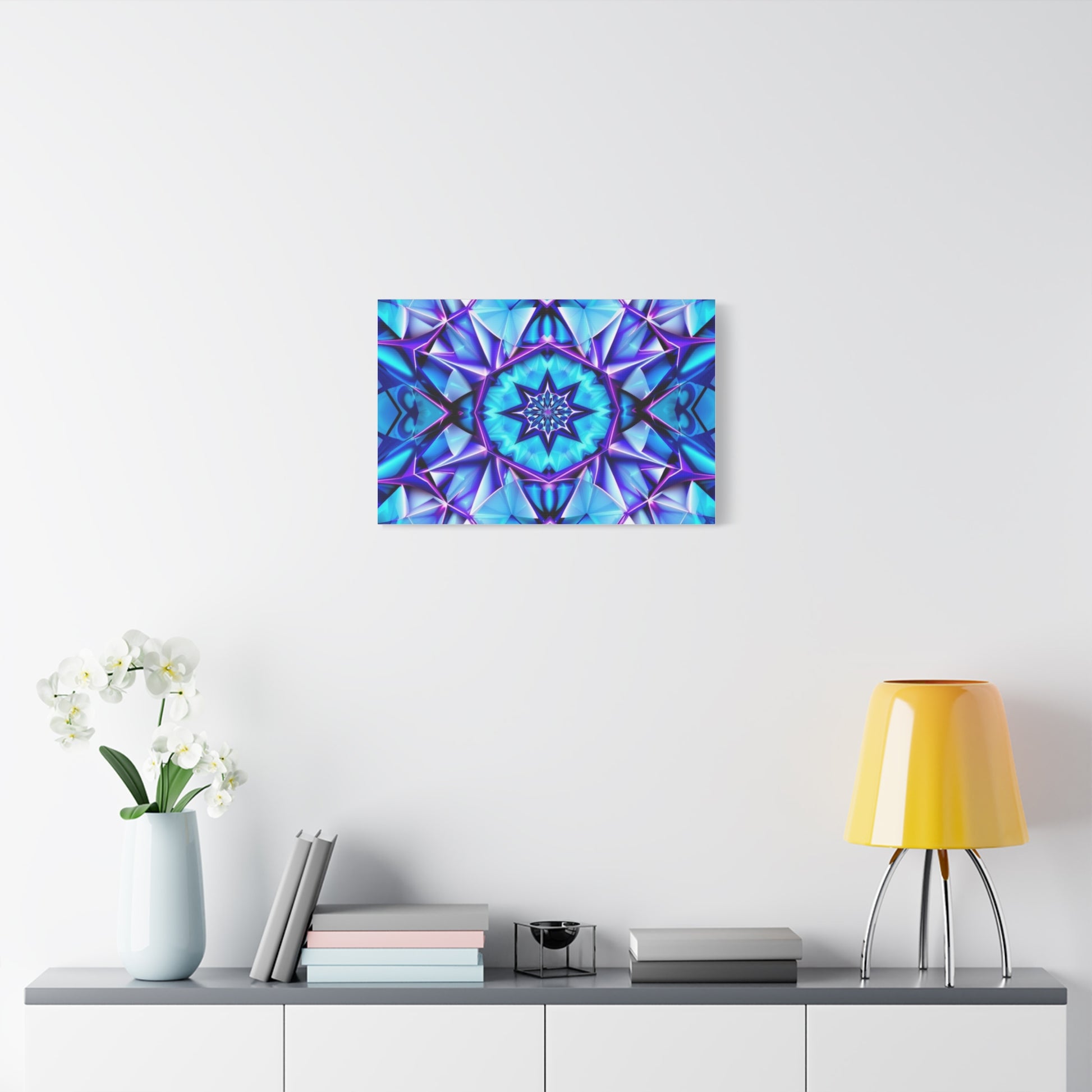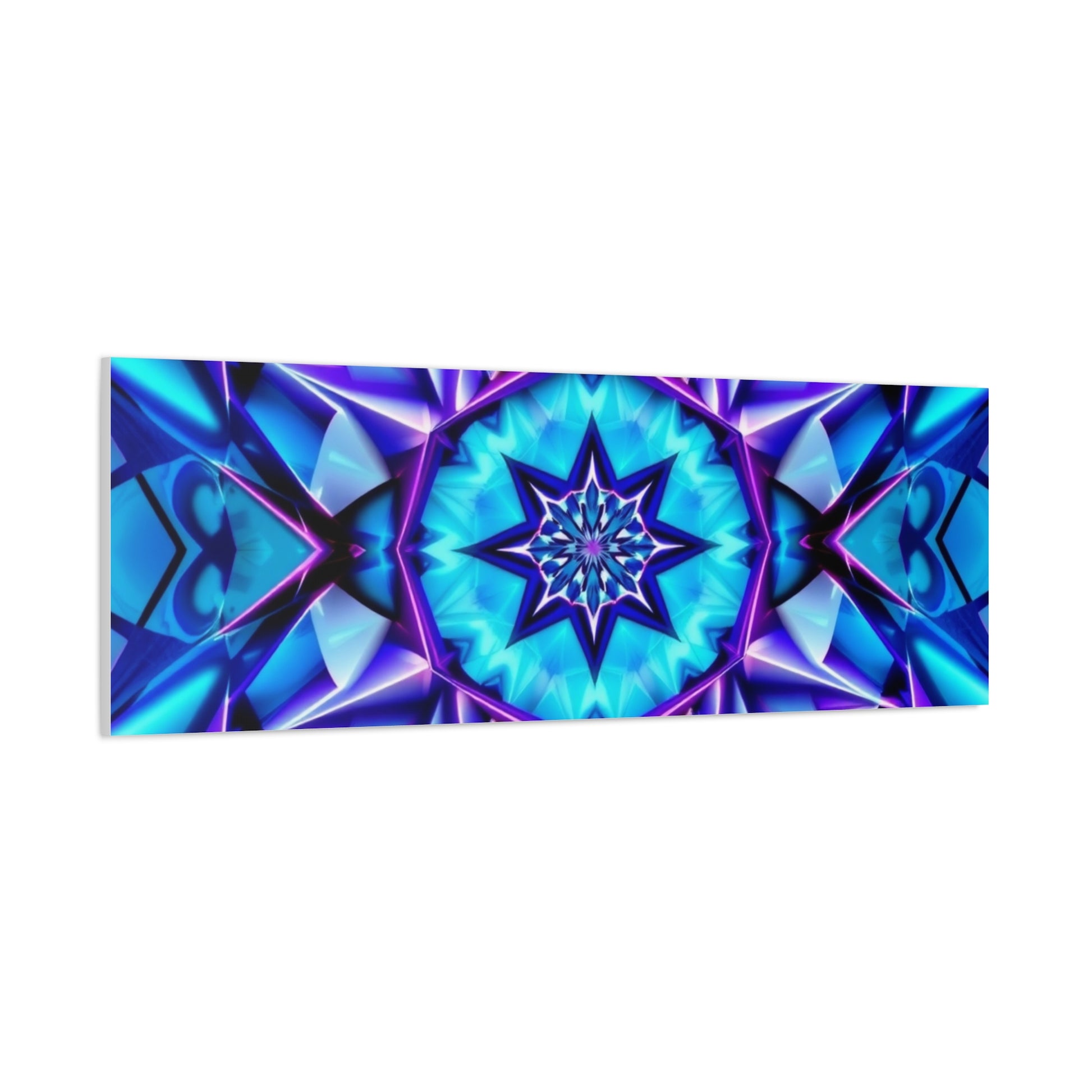A vibrant stretched canvas that brings geometric energy and deep blues into any room. The kaleidoscopic starburst pattern radiates from the center in layered shades of turquoise, cobalt and violet, drawing the eye and anchoring a space with both movement and calm. Lightweight yet sturdy, the 1.25" profile sits slightly proud from the wall so the image feels like a floating portal of color. It hangs easily and stays put thanks to soft rubber dots and an included back-hanging system. Crafted with archival latex inks on a cotton-poly canvas and mounted on sustainably sourced pine, this piece balances bold visual impact with responsible materials — a jewel-toned statement that fits living rooms, studios, or meditation corners seeking a focused pop of pattern and depth.