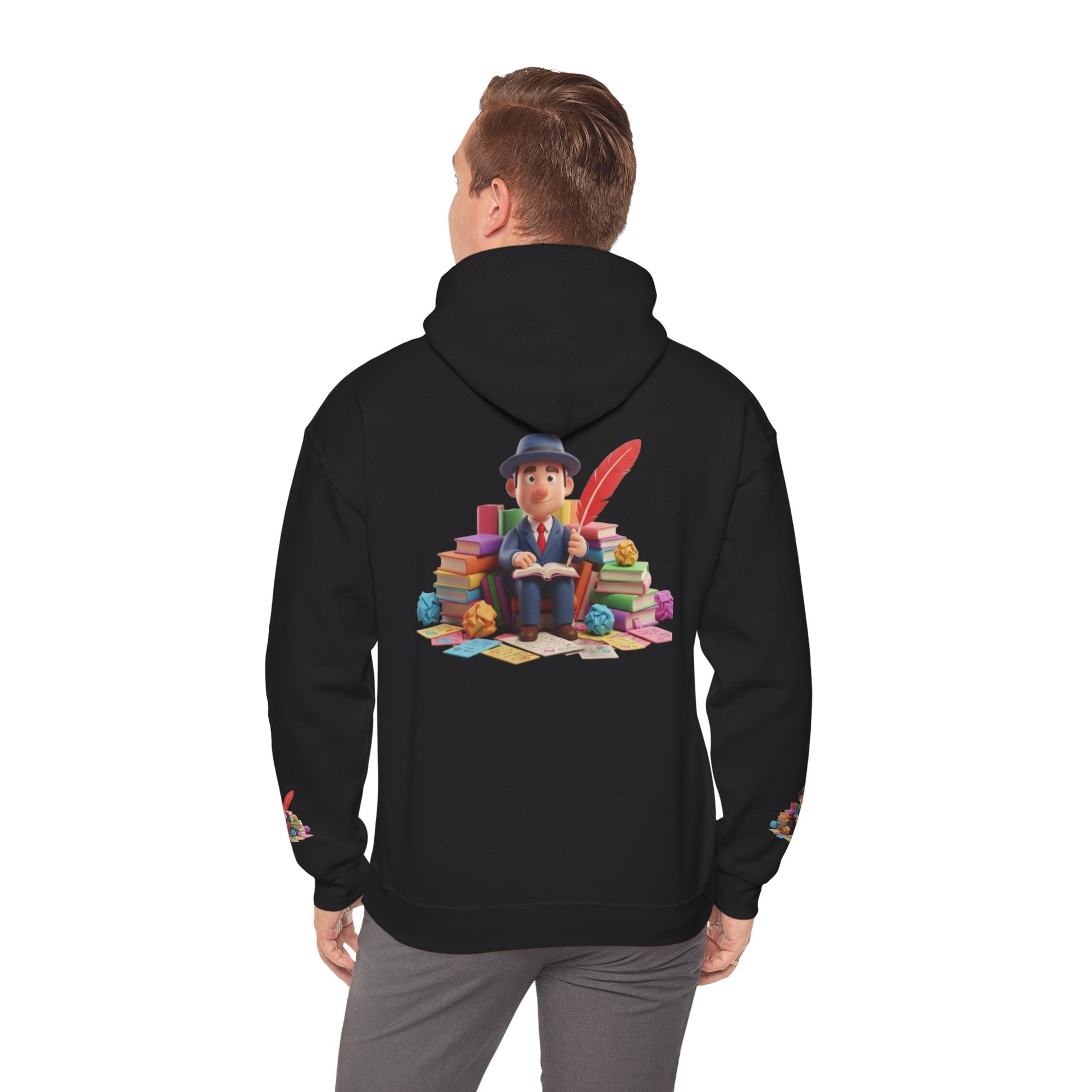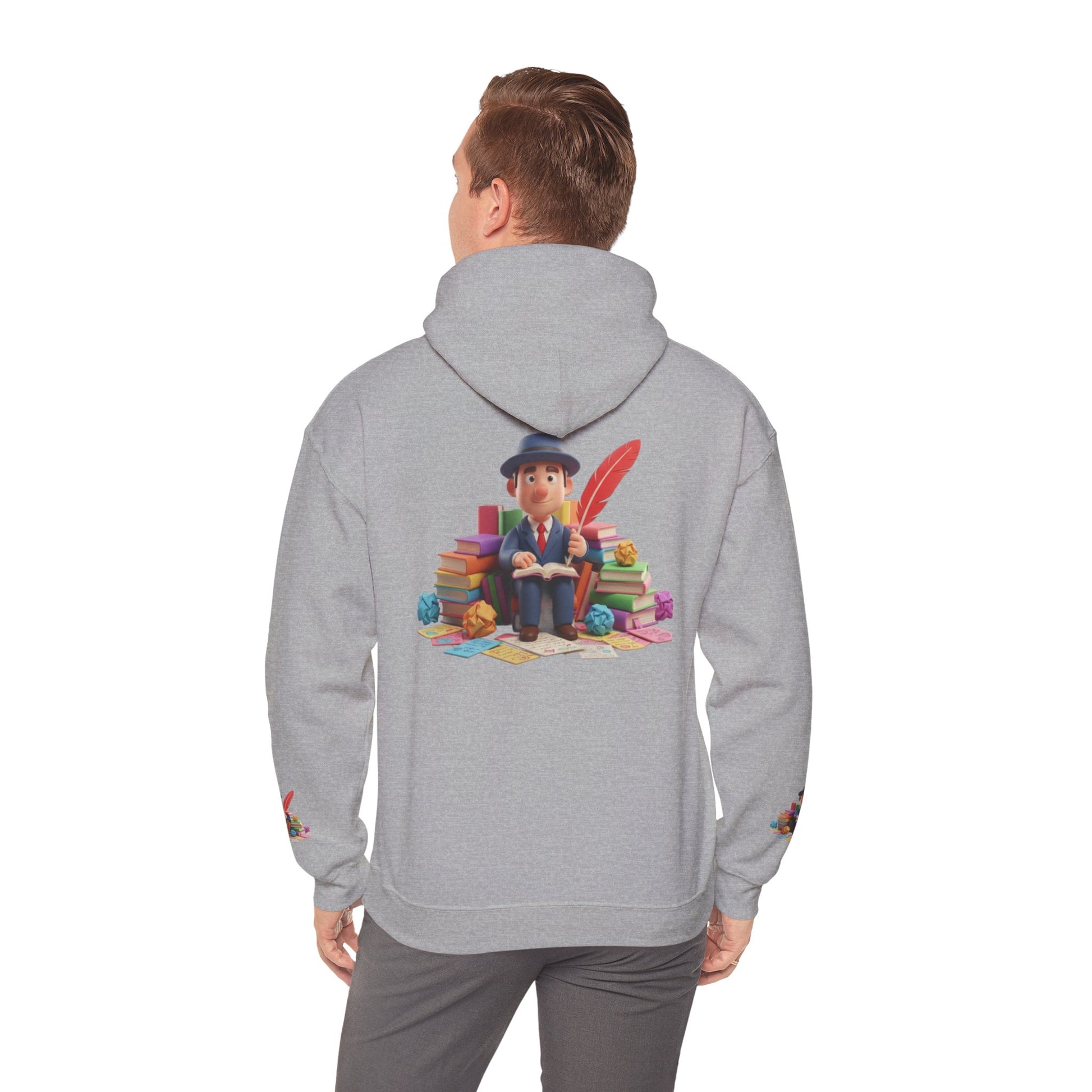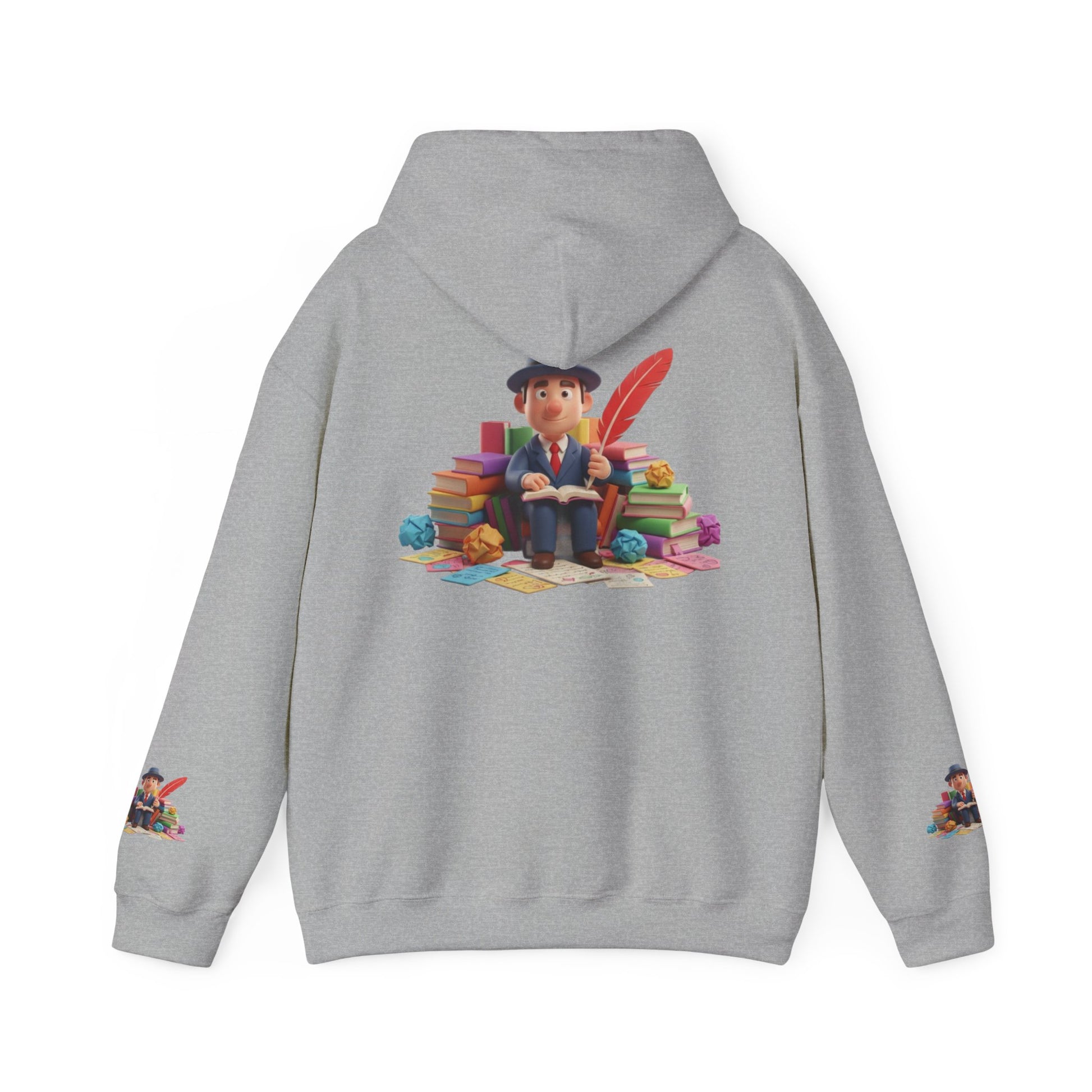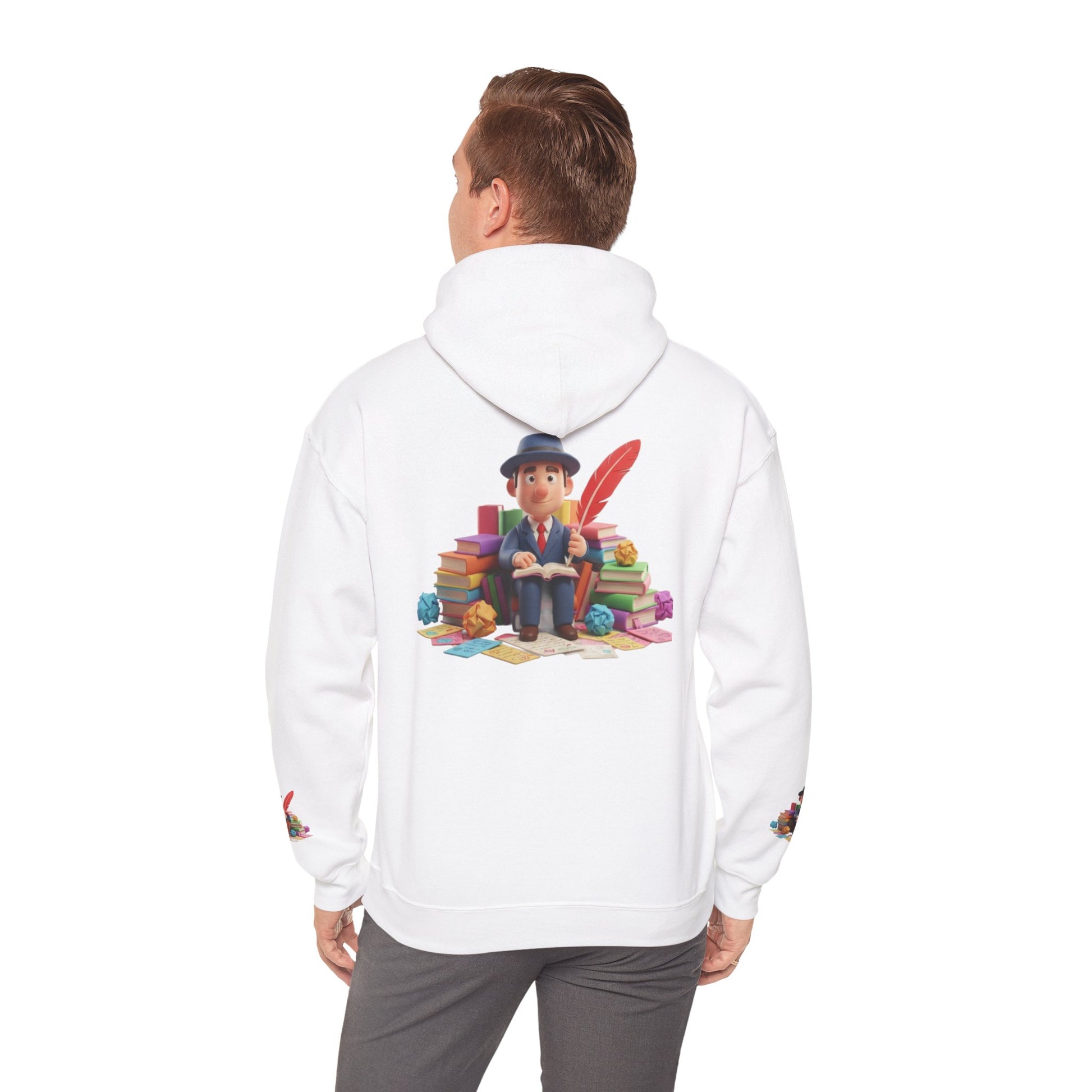 A cozy, soft midweight hoodie designed for readers, writers, and anyone who carries stories with them. The clean white canvas showcases a warm, whimsical illustration of a young writer surrounded by books and a feather quill across the back, with matching smaller art on each sleeve — a subtle nod to quiet creativity. Wear it on slow mornings with a mug and notebook, at library study sessions, or out on a rainy walk when ideas need breathing room. The roomy kangaroo pocket keeps hands warm and a phone close. The color-matched drawcord and double-lined hood add a finished, durable feel that lasts through many cozy seasons.