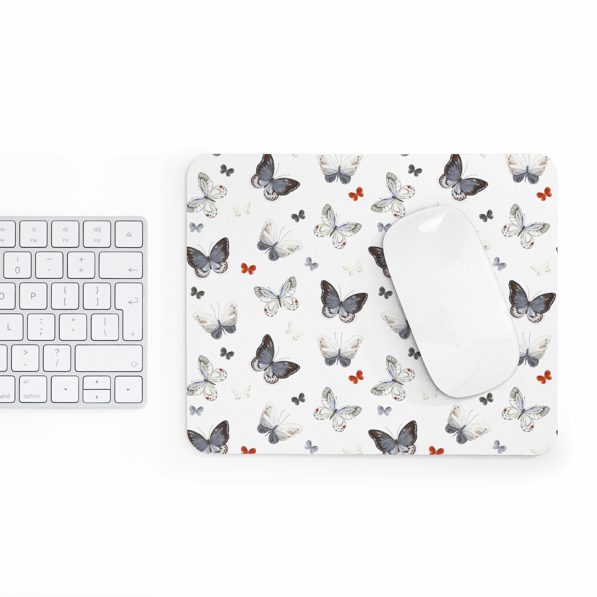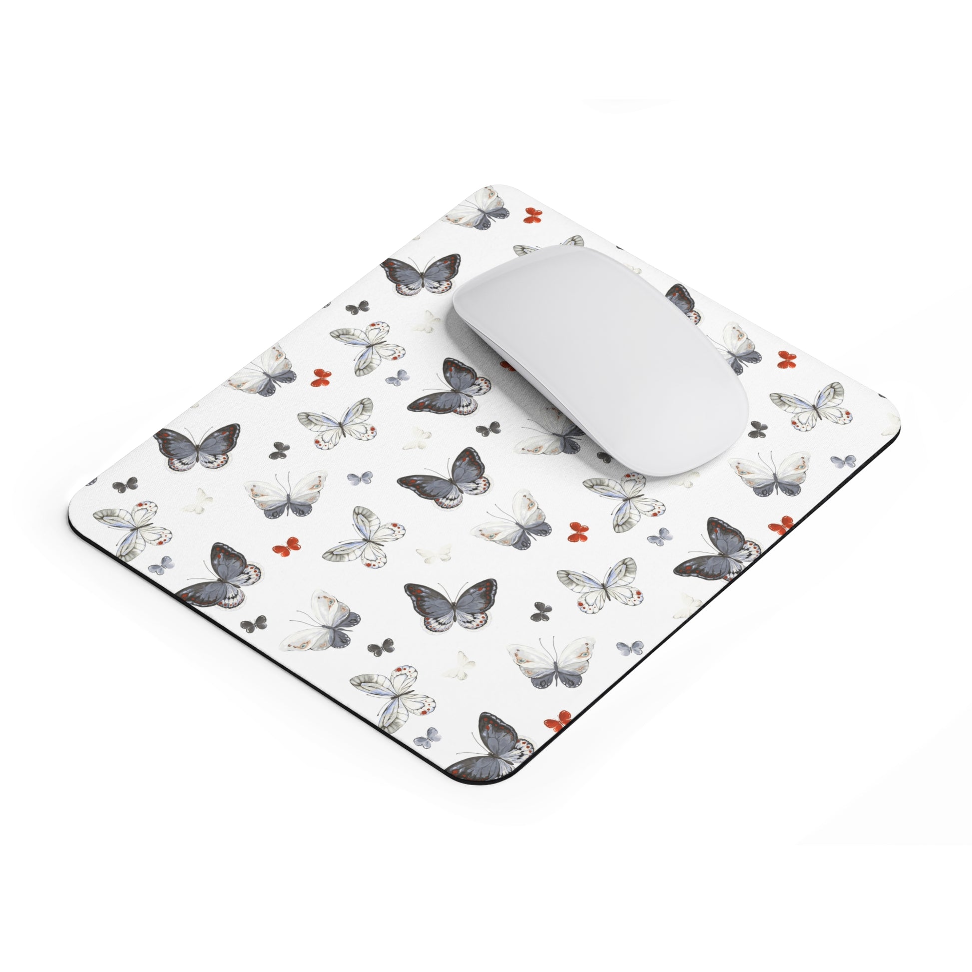 A soft, artful mouse pad printed edge-to-edge with delicate butterfly illustrations. The white background keeps your desk light and airy while clusters of grey, cream, and subtle rust butterflies drift across the surface. The 4 mm neoprene gives a gentle, spongey feel that cushions your wrist during long browsing or work sessions, and the textured black rubber underside stays firmly in place on wood or metal desks. This mouse pad brings a quiet, natural touch to a home office, craft table, or study — a small everyday object that makes routine moments feel a little calmer and more considered.