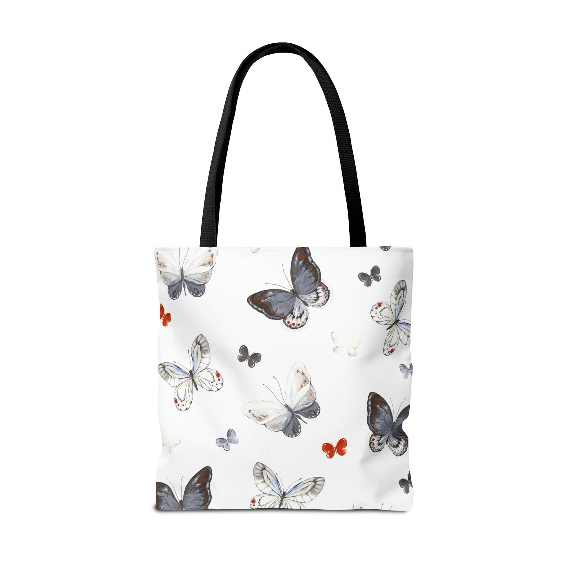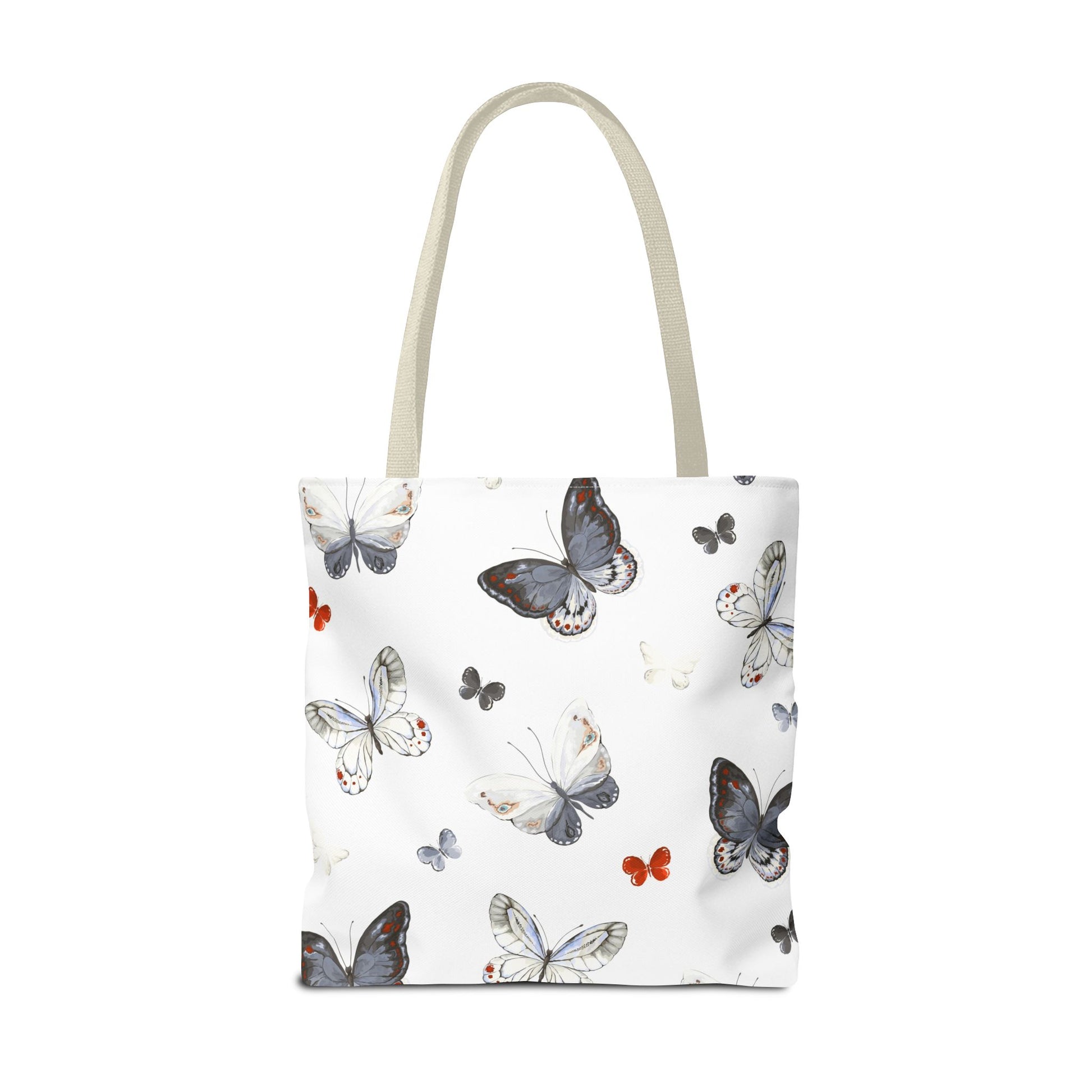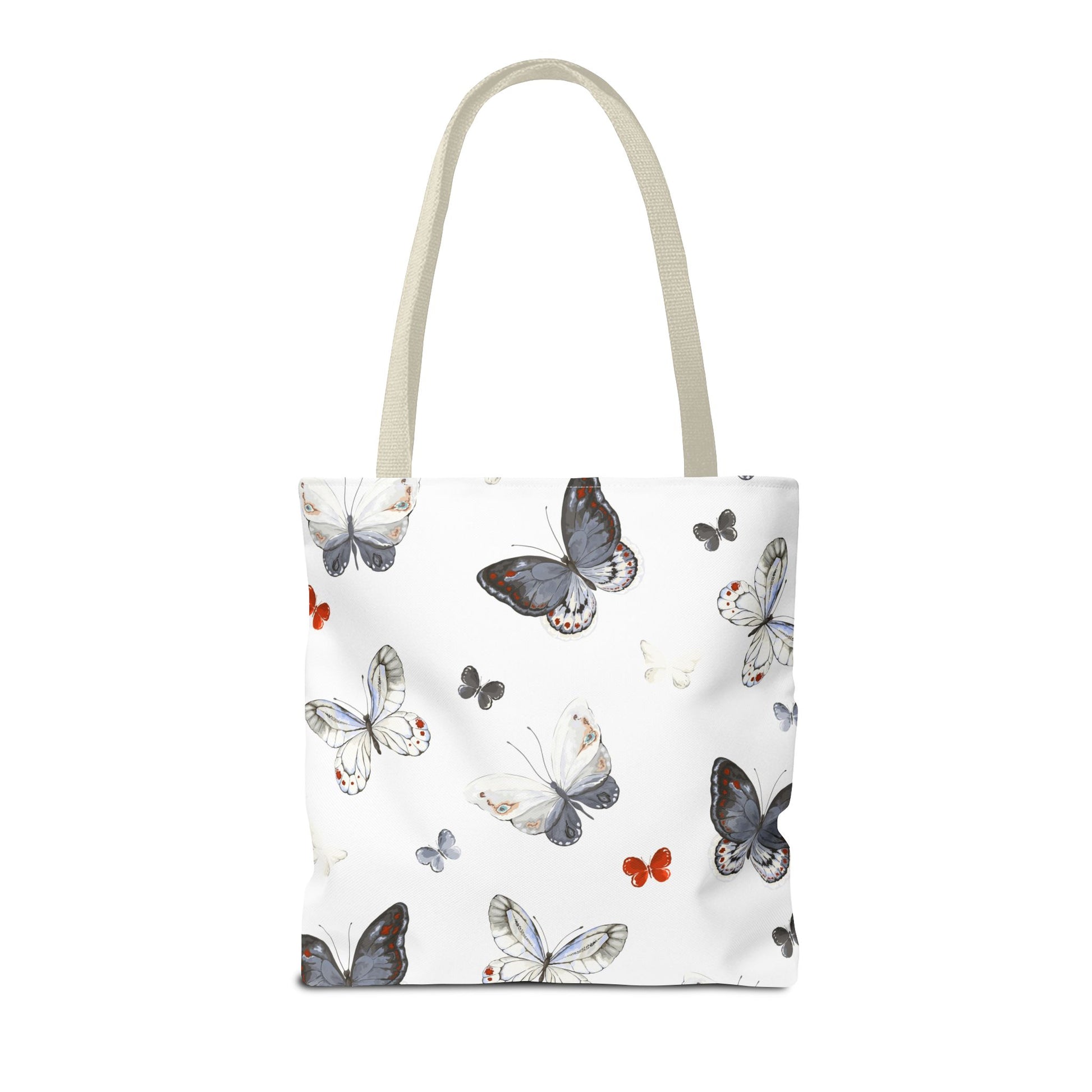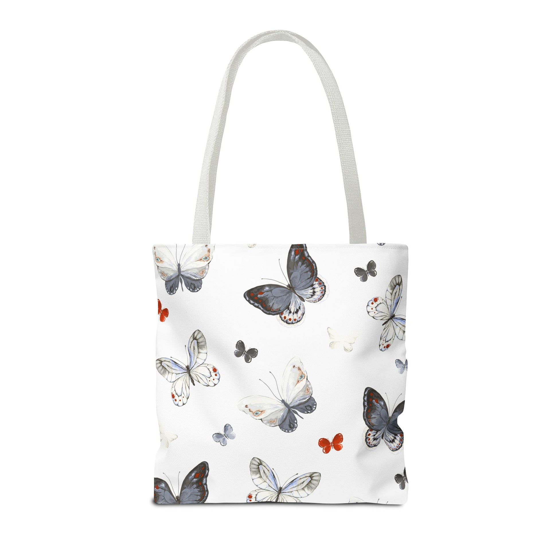 Light and airy, this butterfly-print tote brings a quiet, joyful note to everyday outings. The delicate watercolor wings flutter across a clean white field, while the black handles add contrast and carry comfort. It’s the kind of bag you reach for when you want your essentials to feel a little more thoughtful — groceries, a paperback, sketch tools, or market finds. The roomy boxed corners give extra carrying space without adding bulk, and the durable polyester body stands up to daily use and quick drying when life gets messy. Whether drifting between cafés, farmers’ stalls, or neighborhood walks, this tote adds a soft, natural touch to your routine.