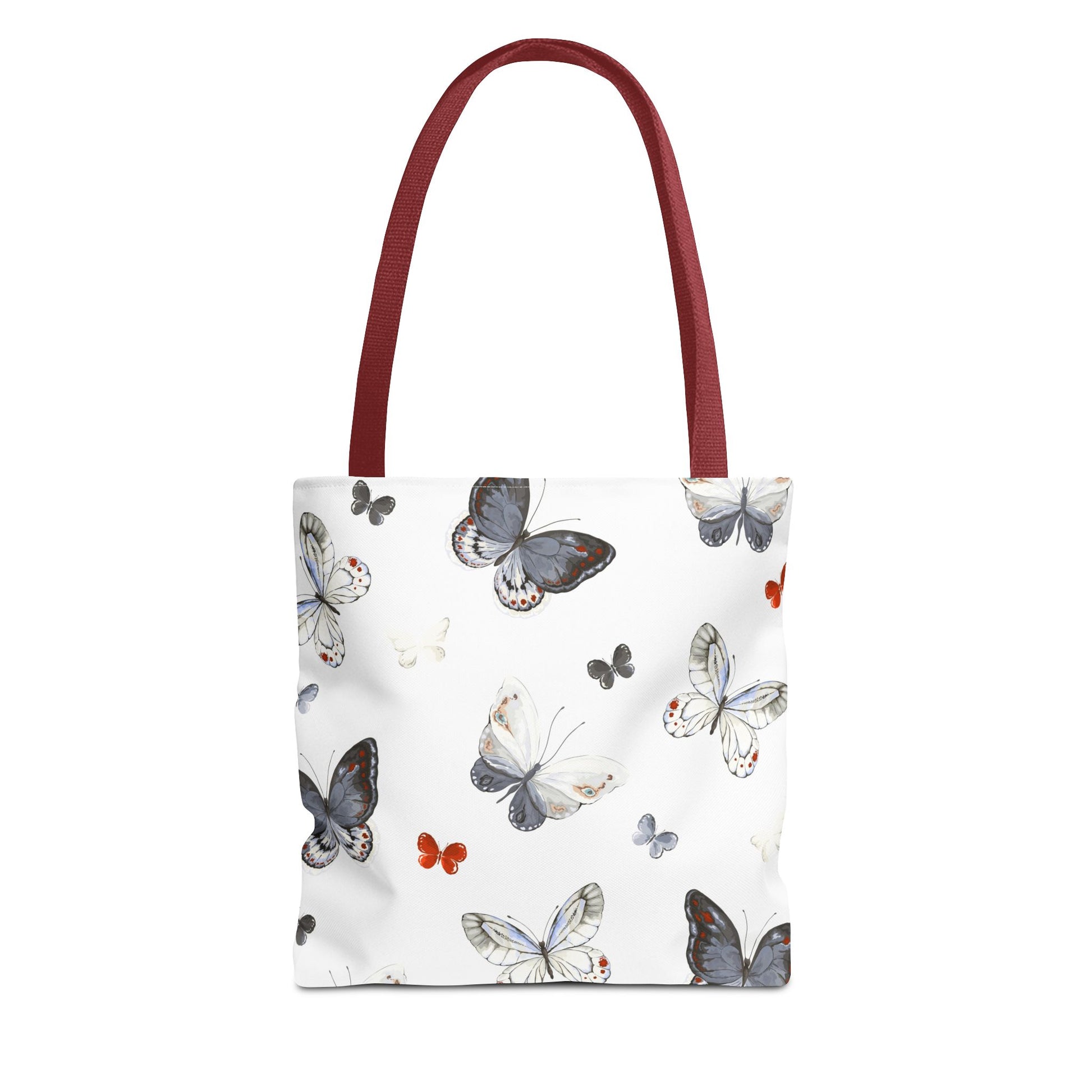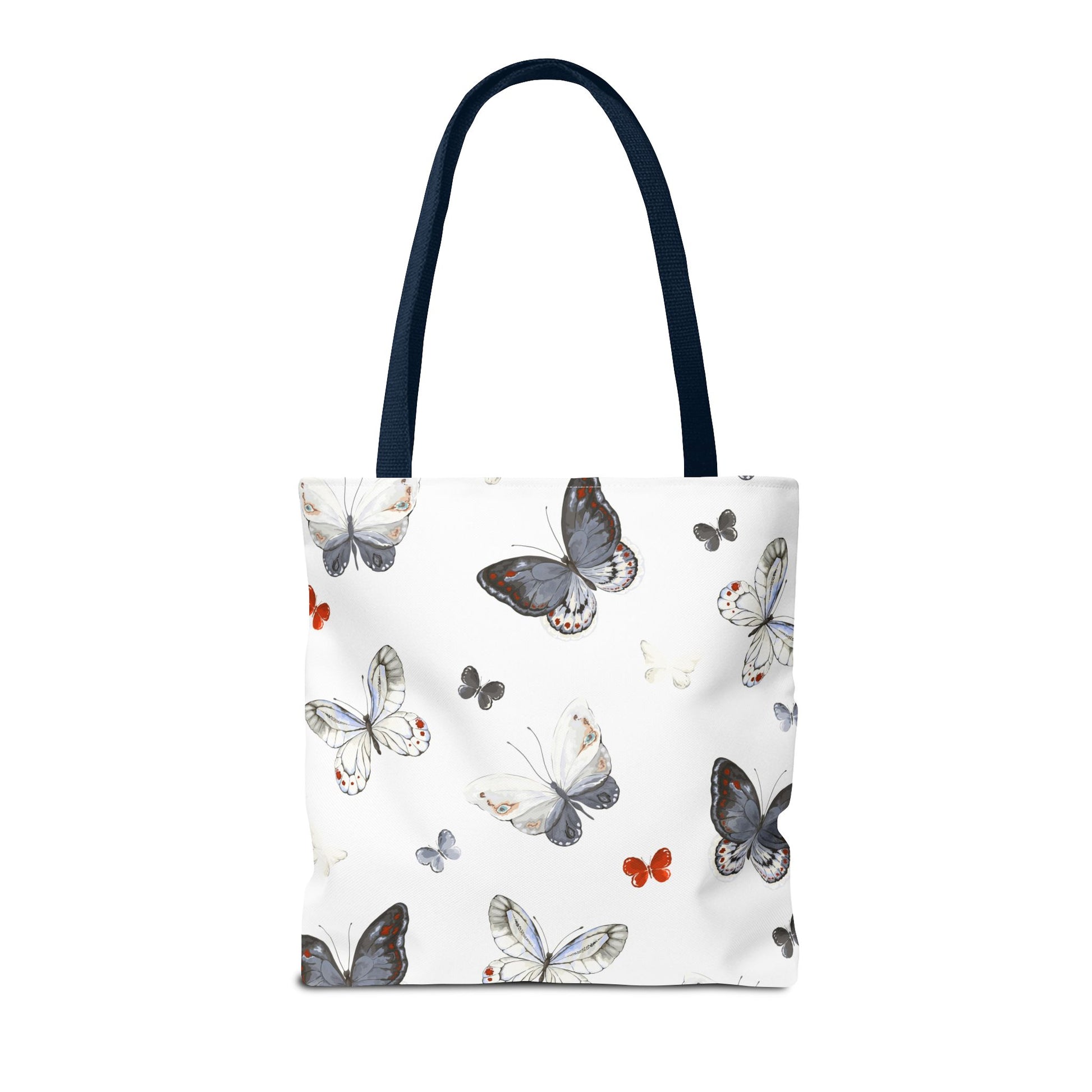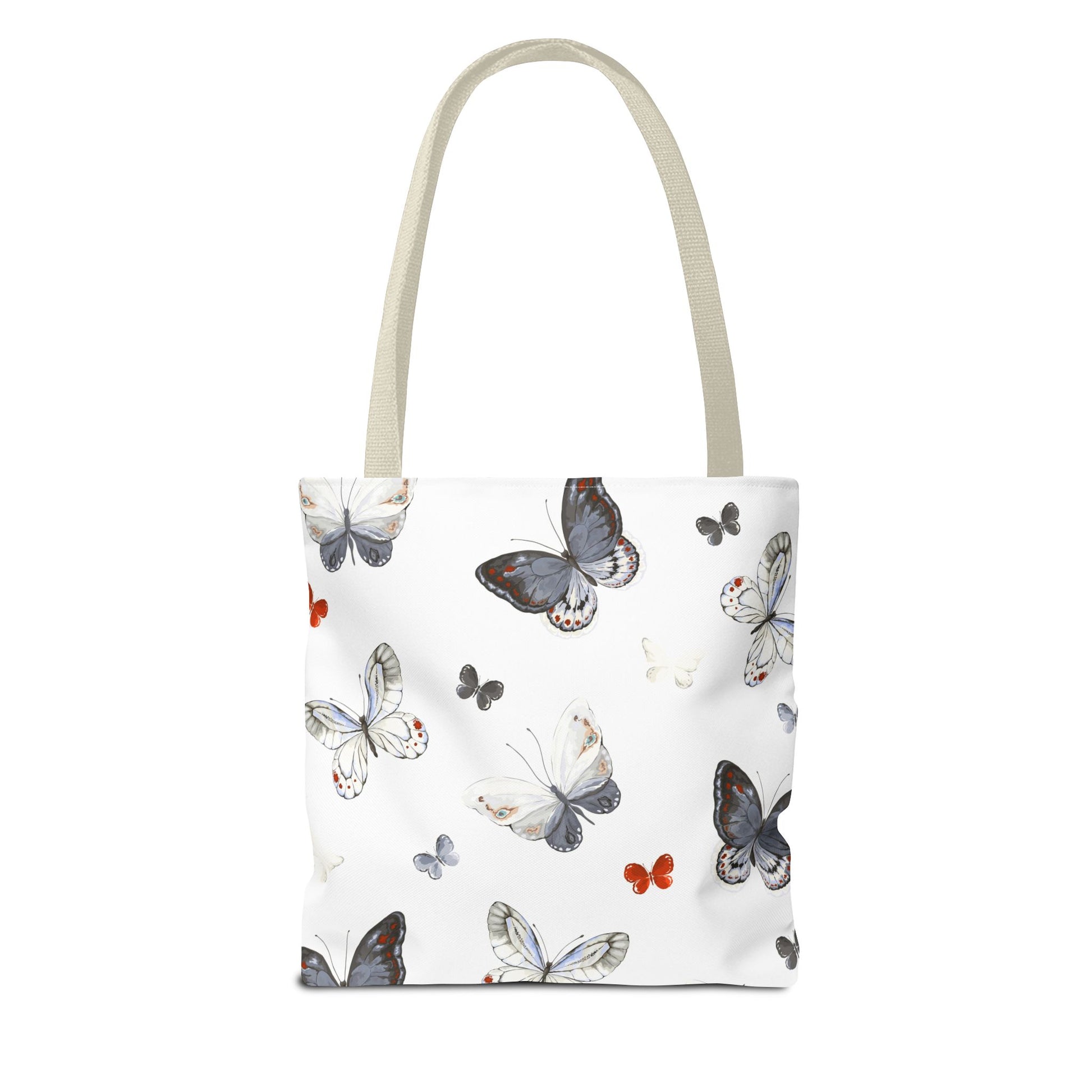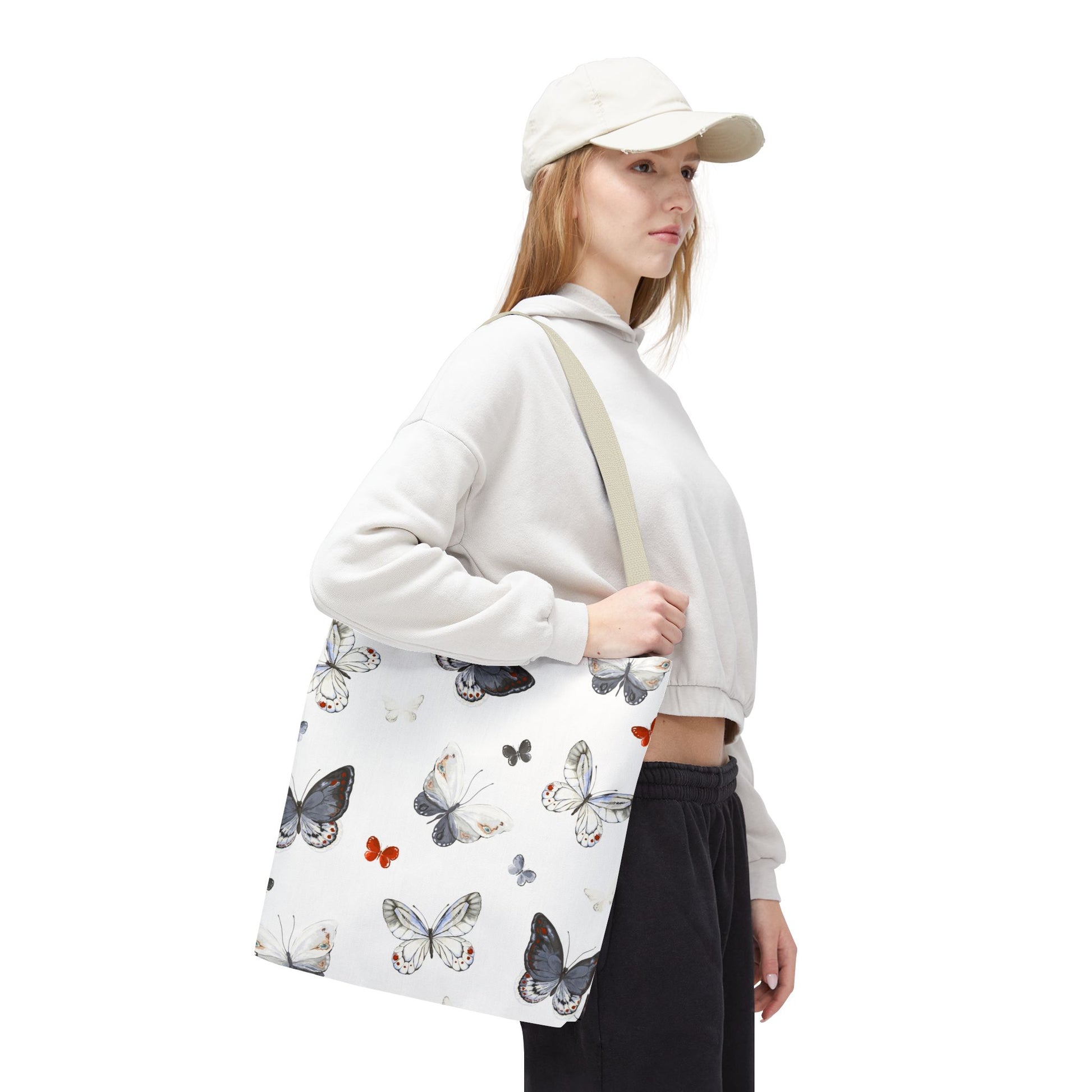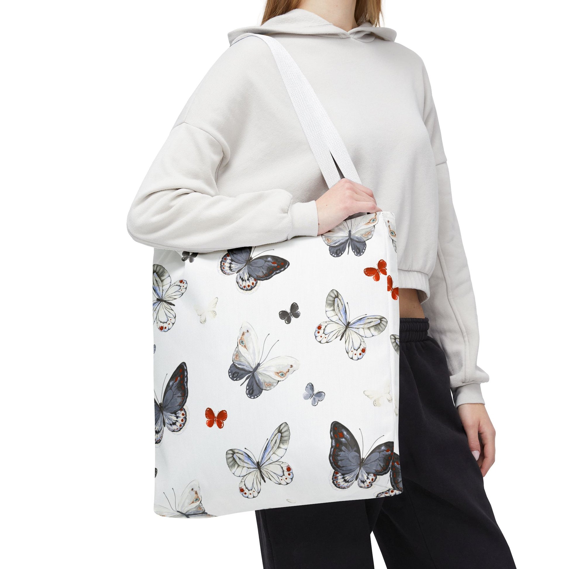 Light and airy, this butterfly-print tote brings a quiet, joyful note to everyday outings. The delicate watercolor wings flutter across a clean white field, while the black handles add contrast and carry comfort. It’s the kind of bag you reach for when you want your essentials to feel a little more thoughtful — groceries, a paperback, sketch tools, or market finds. The roomy boxed corners give extra carrying space without adding bulk, and the durable polyester body stands up to daily use and quick drying when life gets messy. Whether drifting between cafés, farmers’ stalls, or neighborhood walks, this tote adds a soft, natural touch to your routine.