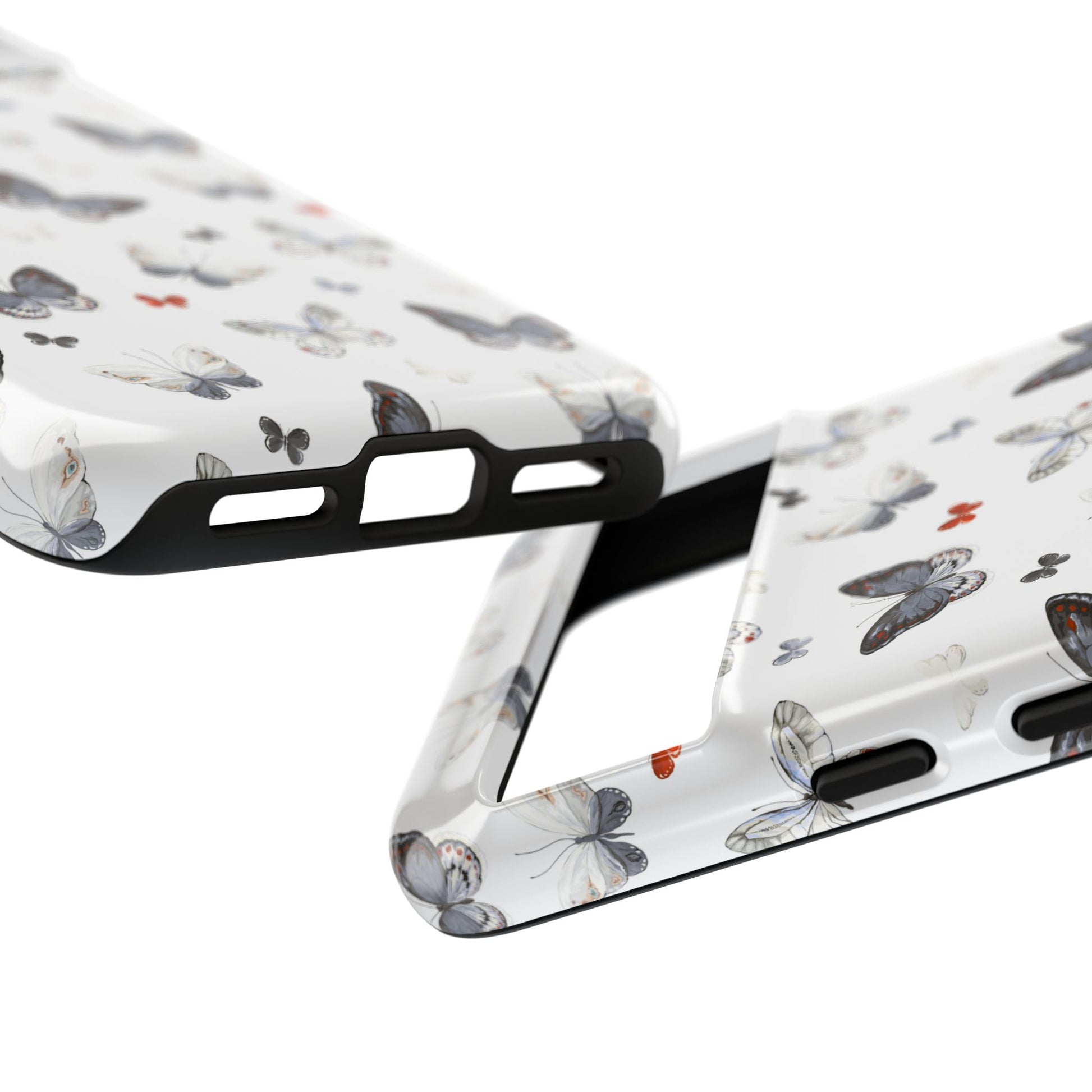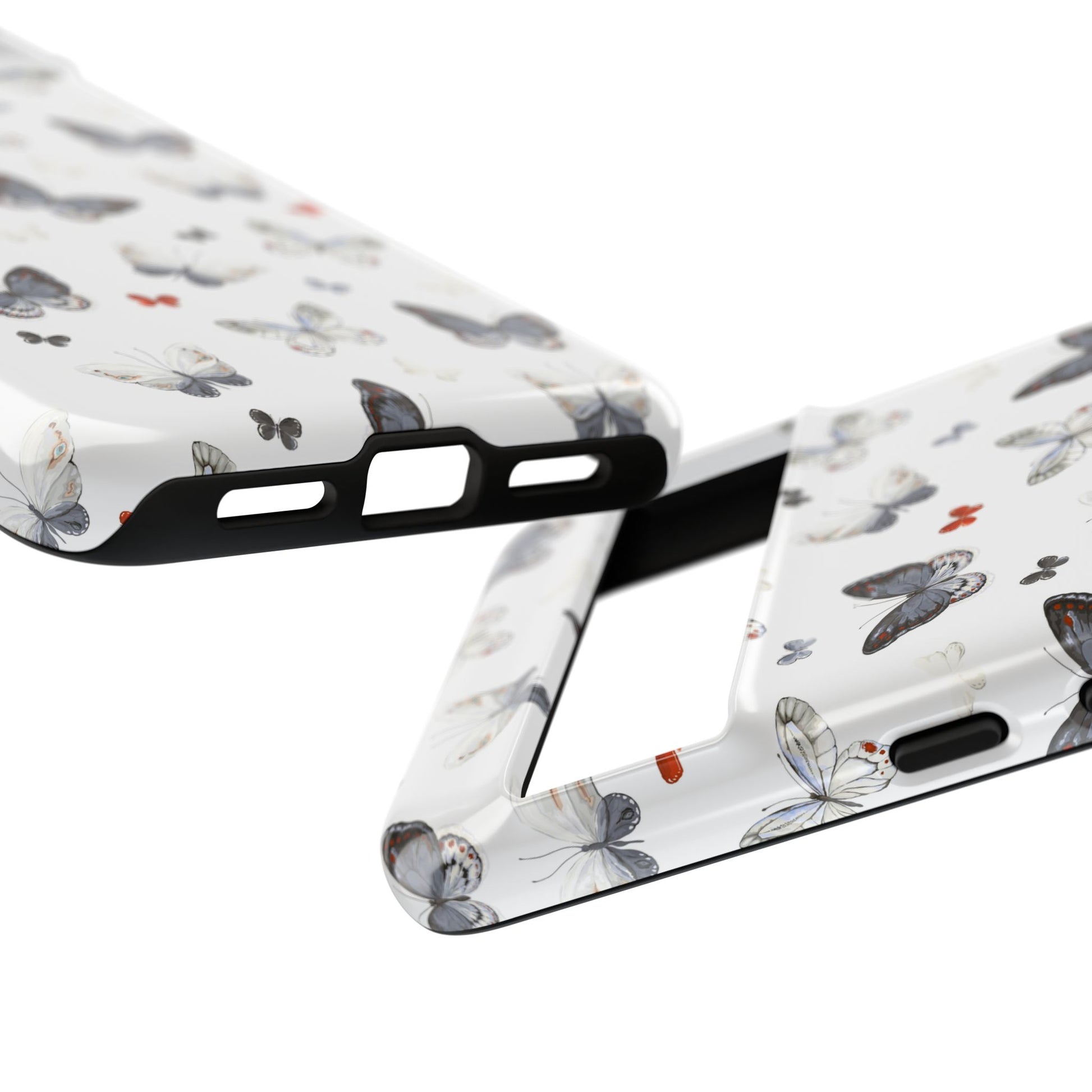This slim, dual-layer protective phone case wraps your device in a delicate dance of butterflies—soft grayscale wings with tiny pops of rust-orange scattered across a clean white background. The 3D wrap print gives depth to each wing, while the glossy or matte finish lets you choose the exact look you want. Inside, a premium TPU silicone liner cushions against drops and absorbs shock; the polycarbonate shell resists impact and keeps the design crisp. Weather-resistant inks and UV protection help maintain color outdoors, and the case supports wireless charging with clear port access for everyday use. Thoughtful compliance testing and South Korea sourcing add peace of mind for buyers who care about quality and safety.