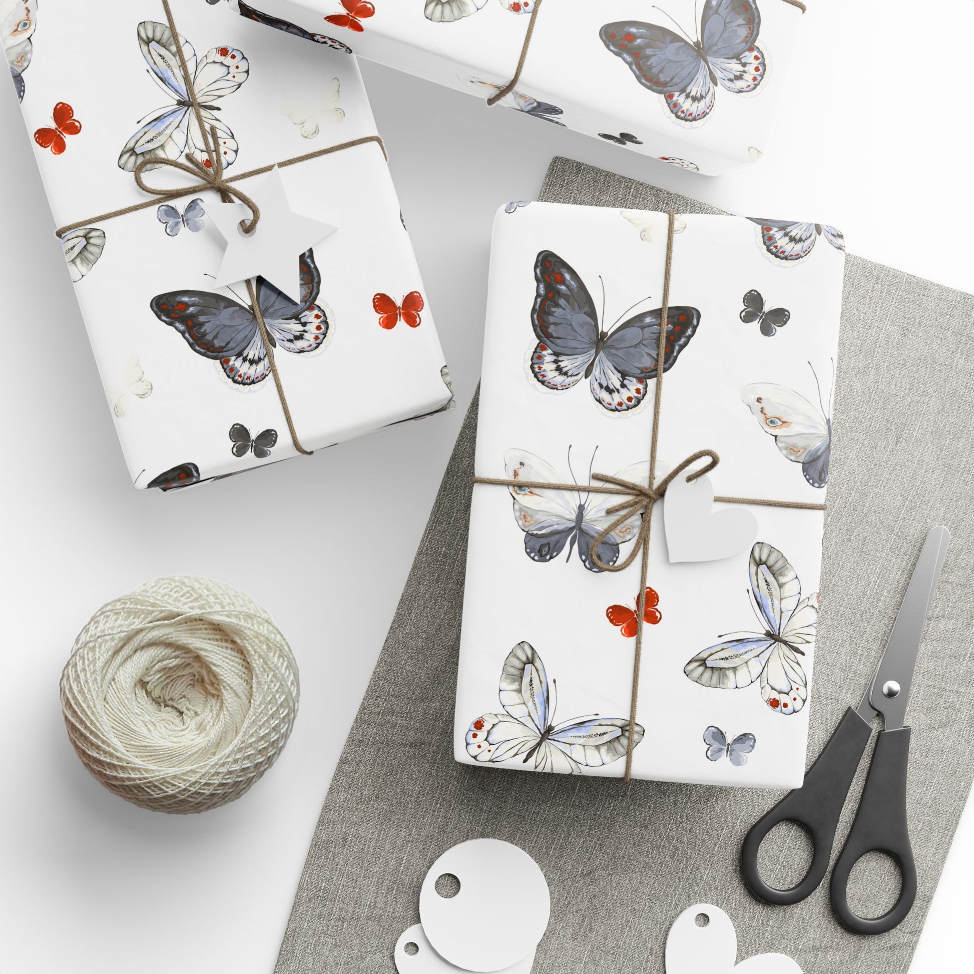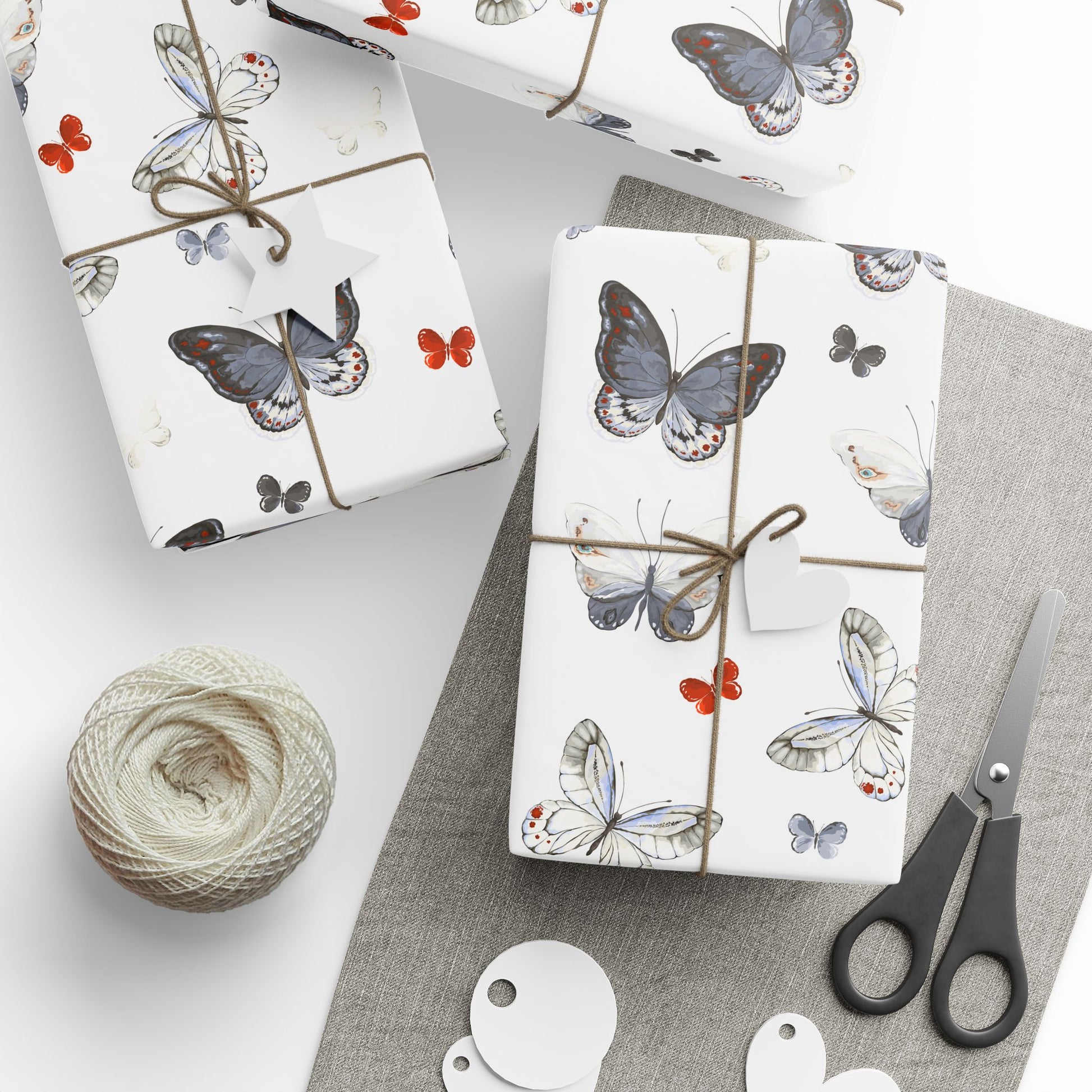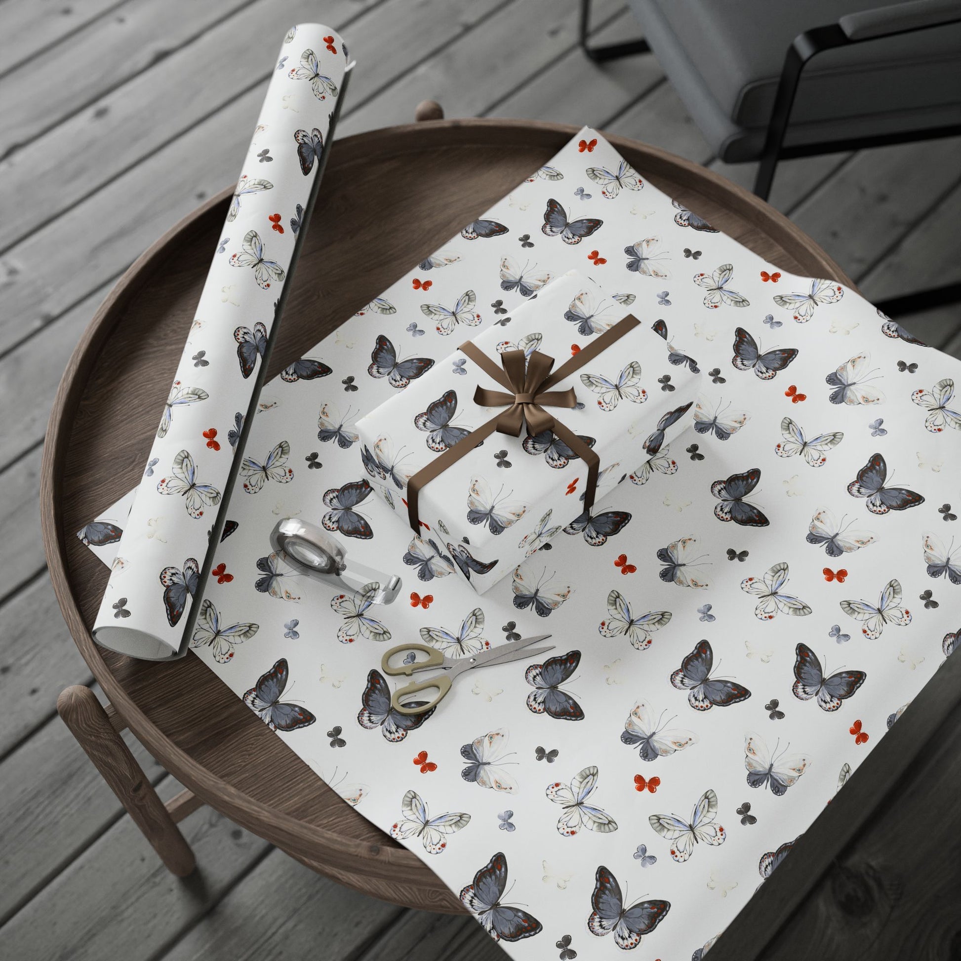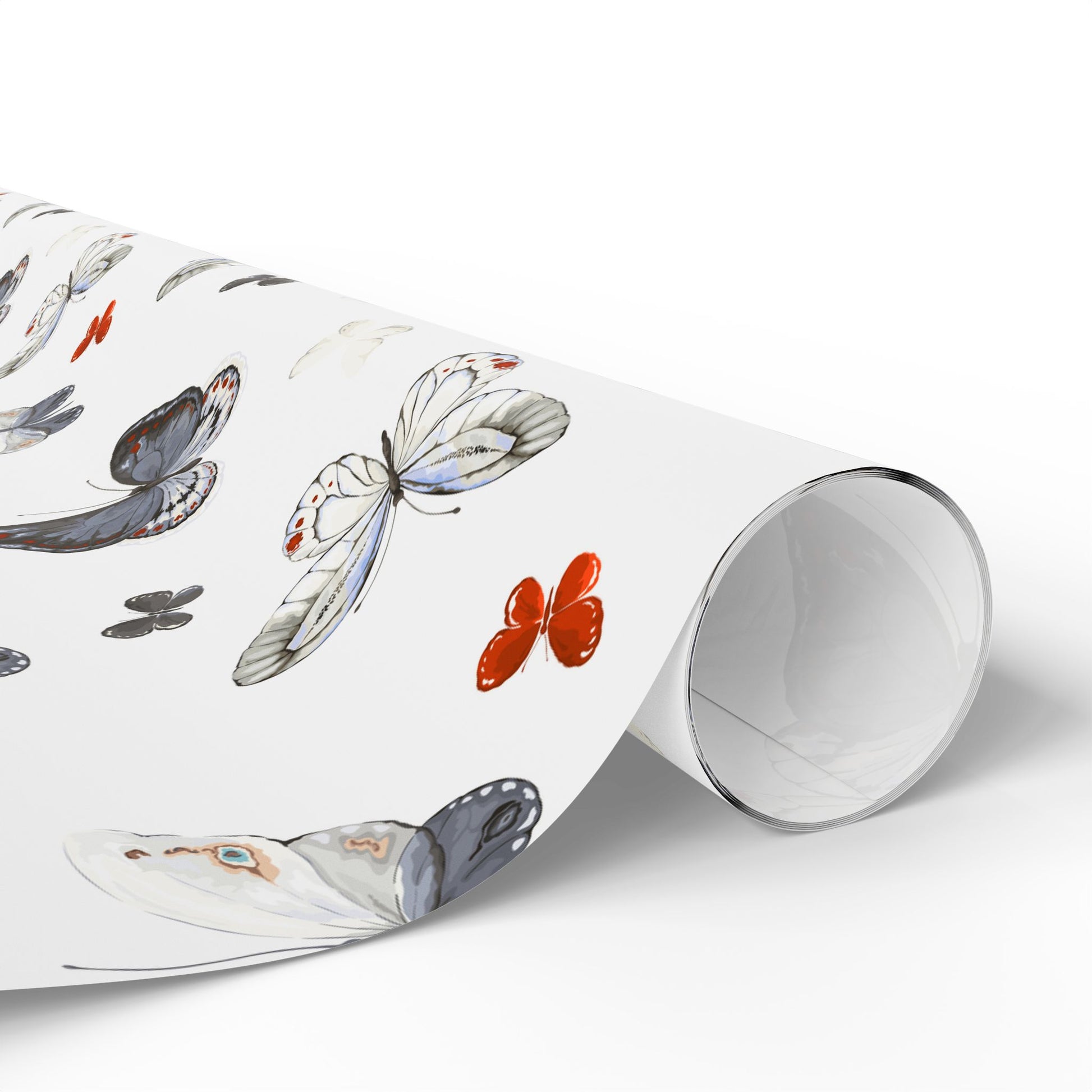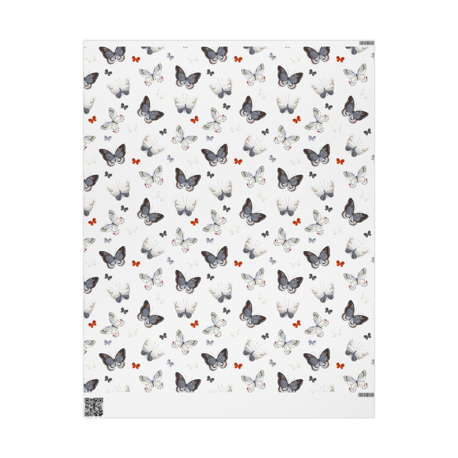 Light, airy wrapping paper patterned with soft watercolor butterflies in charcoal, dove gray, and small pops of warm coral. The repeat design leaves plenty of white space so ribbons and gift tags stand out. Each sheet feels substantial yet easy to fold — the subtle matte or high-gloss finish gives finished packages a refined, handcrafted look. Use it to add a quiet, natural elegance to birthday presents, bridal showers, or thoughtful notes tucked into care packages.