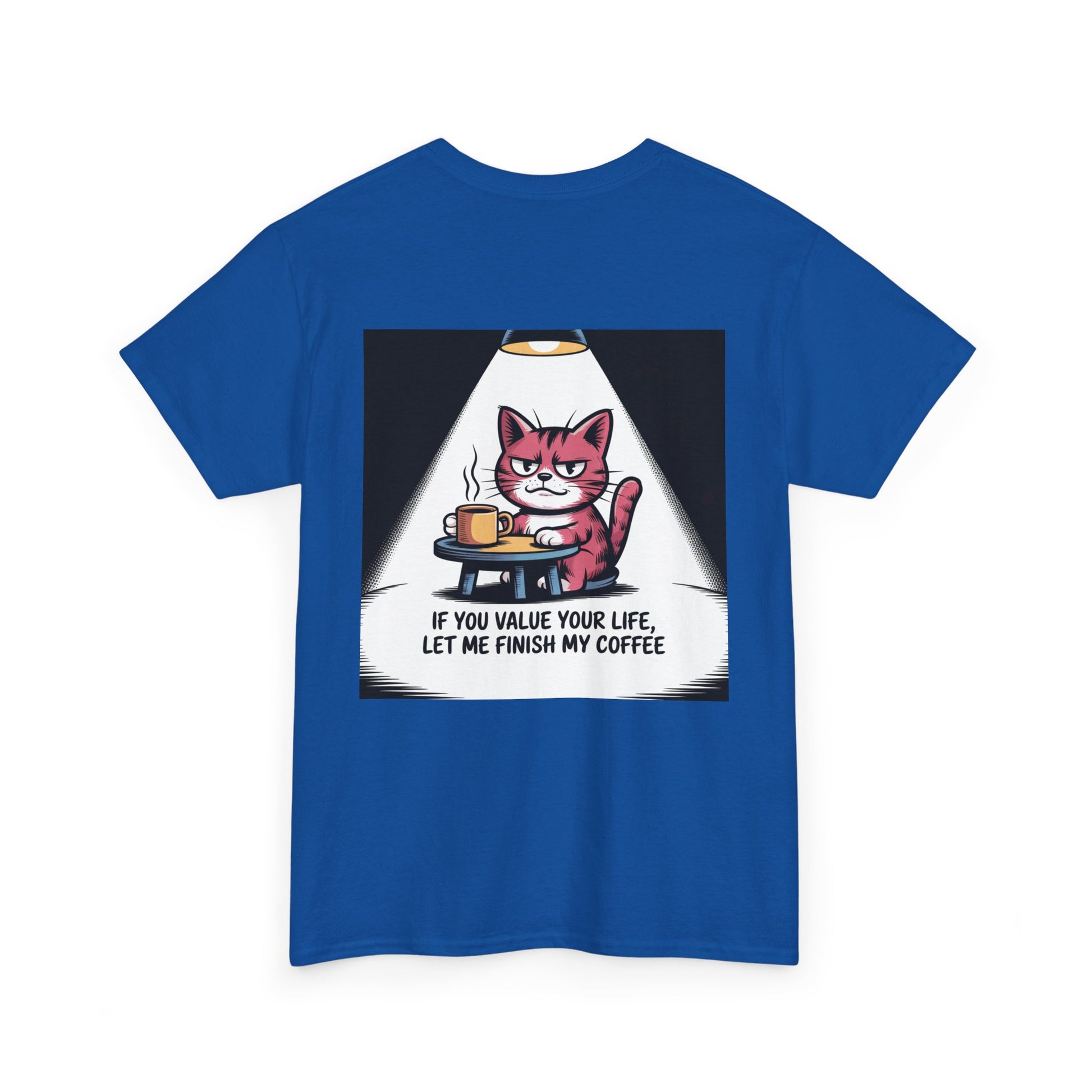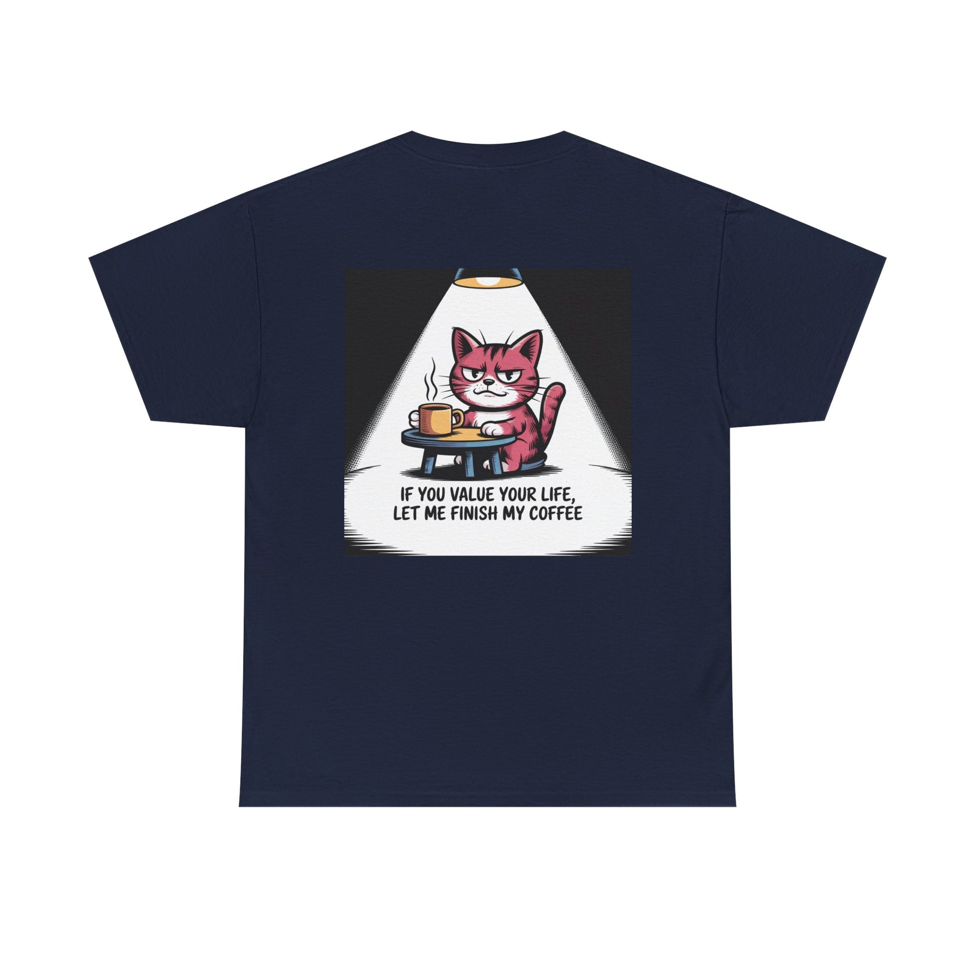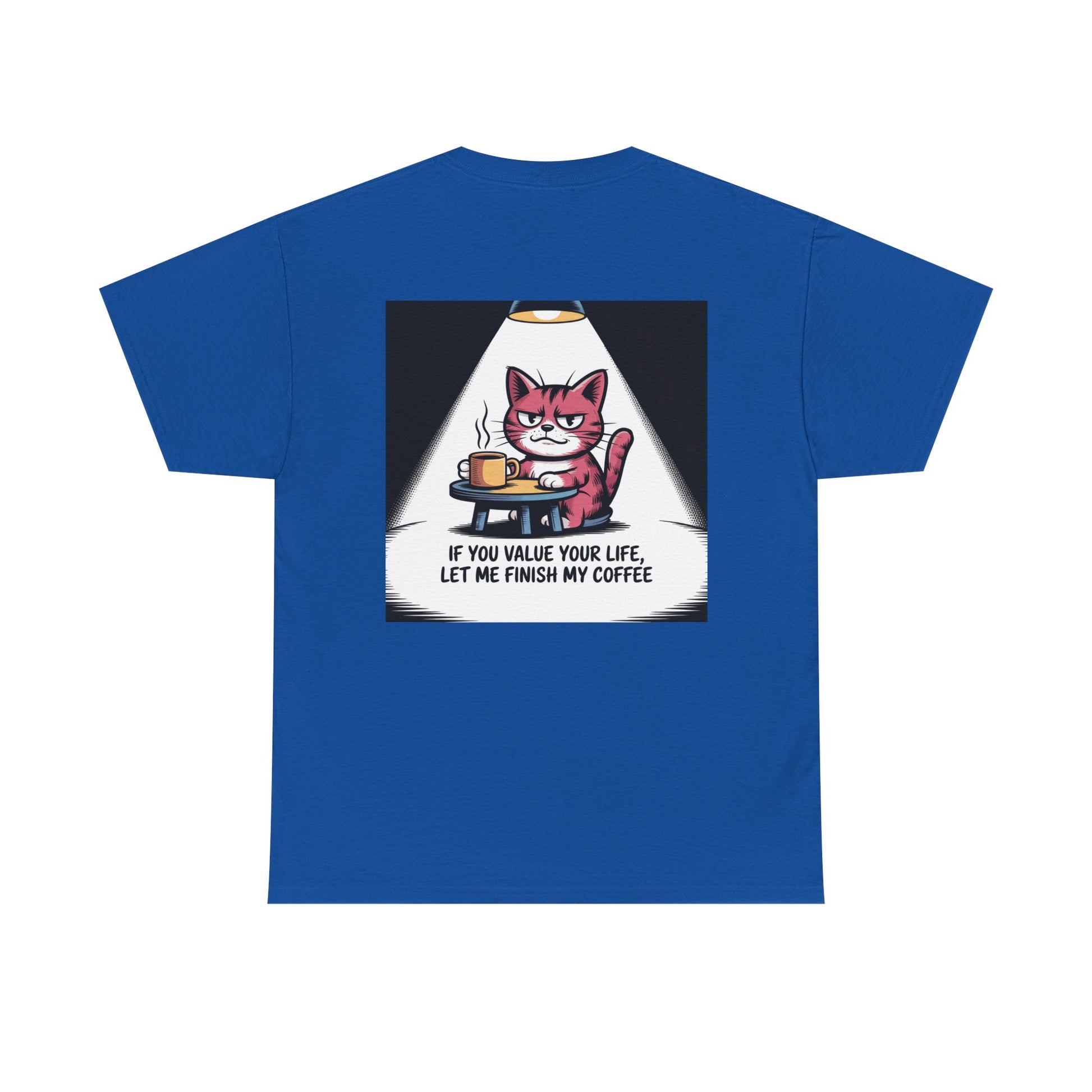 A soft, classic tee that speaks to coffee-first minds and cat-hearted people. The front-and-back print features a sly, pink cat holding a steaming mug beneath a focused spotlight, captioned with blunt humor that reads: “If you value your life, let me finish my coffee.” It’s lightweight but sturdy — breathable 100% cotton with a ribbed, shape-retaining collar and shoulder tape for long-lasting wear. This shirt settles into everyday rotation: worn with a worn-in cardigan for early morning sips, layered under a denim jacket for a quick cafe run, or paired with joggers during a slow weekend at home. The design feels like an inside joke shared between night-owl baristas, pet parents, and anyone who treats their first cup as sacred. The tear-away label and smooth knit give a comfortable, itch-free experience so the message — and the cat’s stare — can take center stage.
