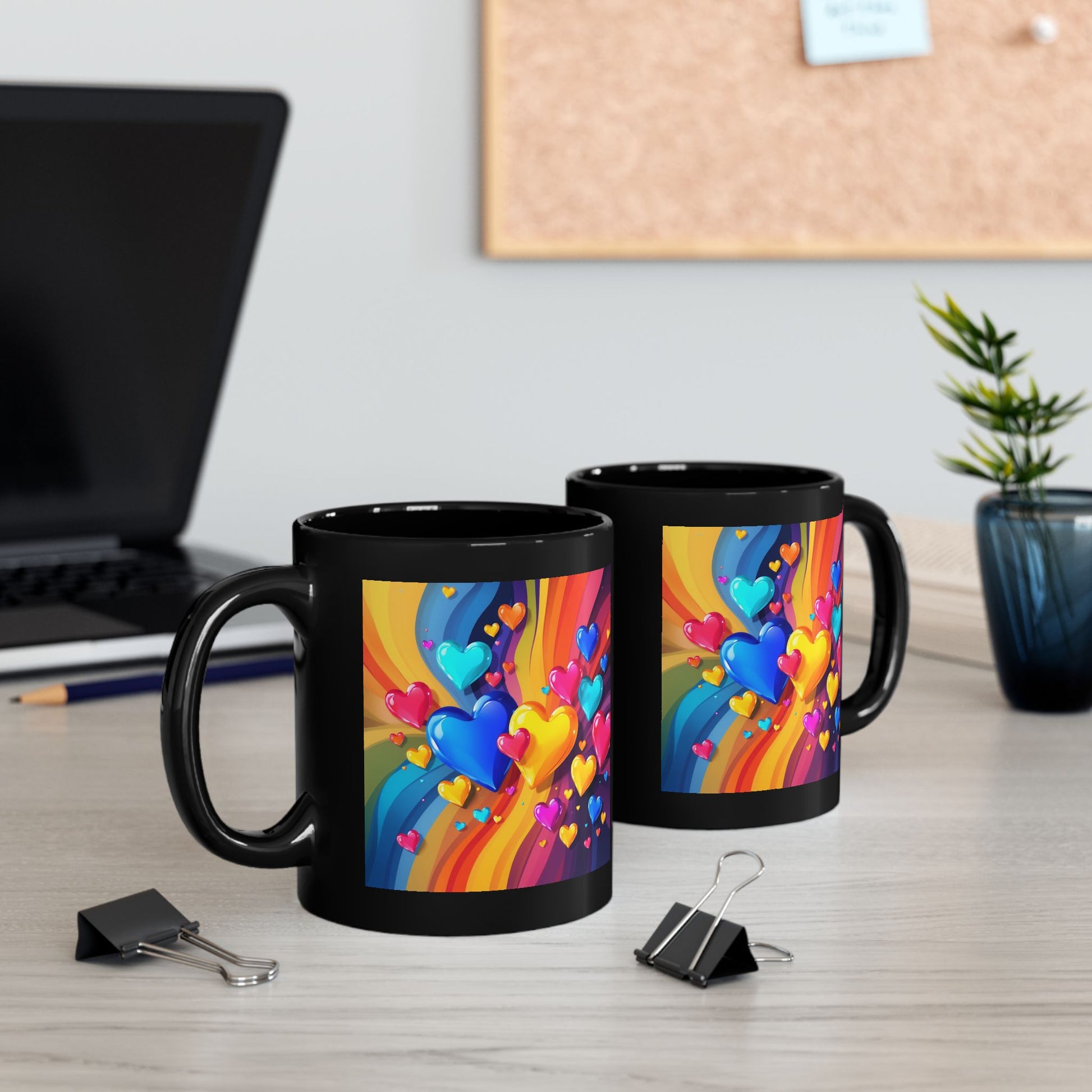 Sip color and joy every morning with this glossy black ceramic mug. A vibrant cascade of rainbow ribbons and glossy hearts wraps around the body, turning a simple coffee break into something playful and bright. The rich, high-resolution print pops against the deep black background, creating contrast that draws the eye. Comfortable C-handle, two size options, and durable glazing make this mug a lively companion for daily routines or cozy evenings. It’s built for everyday use — microwave- and dishwasher-safe and made with safe, lead- and BPA-compliant materials — so the colors stay bold without extra fuss. Bring it out for weekend slow-sips, studio sketch mornings, or anytime you want a cheerful splash on your desk.