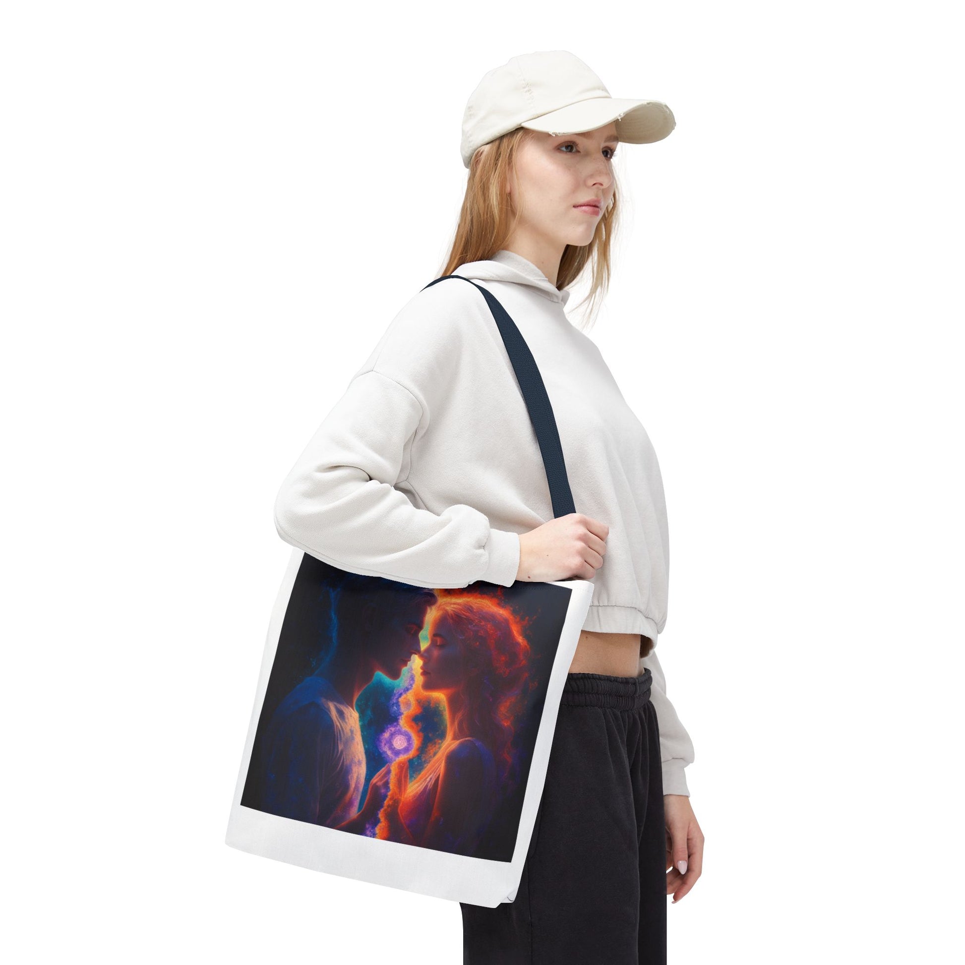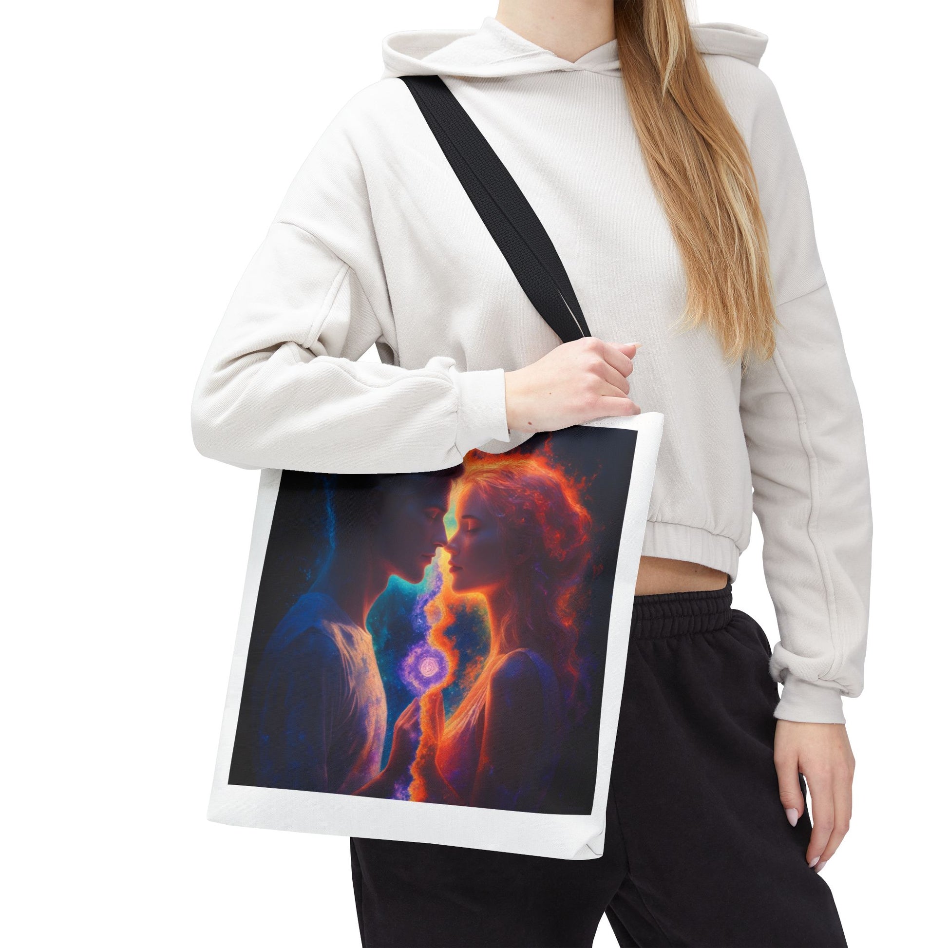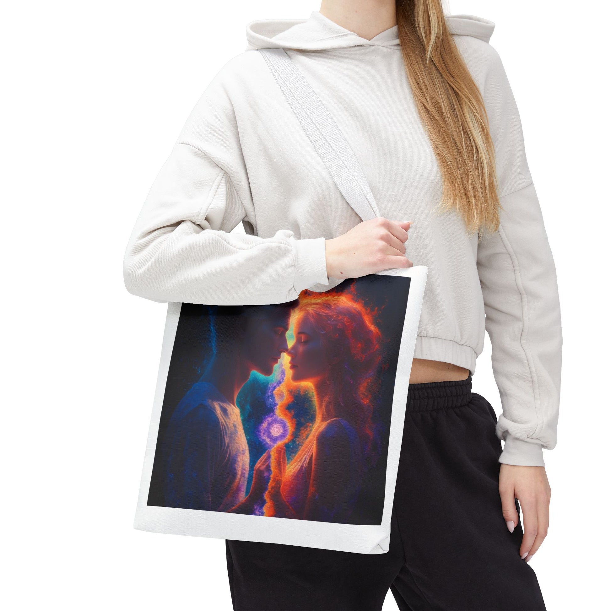 This artful tote brings a moment of electric connection into everyday life. Two figures meet at the center of the design, one glowing with cool blues and the other with warm ember tones, separated and held together by a small, luminous flower. The image feels like a private, cinematic scene — quiet intensity, shared breath, and the kind of chemistry that hums just beneath the surface. Lightweight yet sturdy, the bag carries groceries, sketchbooks, or a library haul while turning heads with its vivid, painterly colors. The cotton handles and reinforced stitching mean it moves from studio to market without losing shape. Let it be the carrier of small rituals: a spontaneous road-trip snack, a notebook for late-night ideas, or an extra layer wrapped around your shoulders on a chilly walk.
