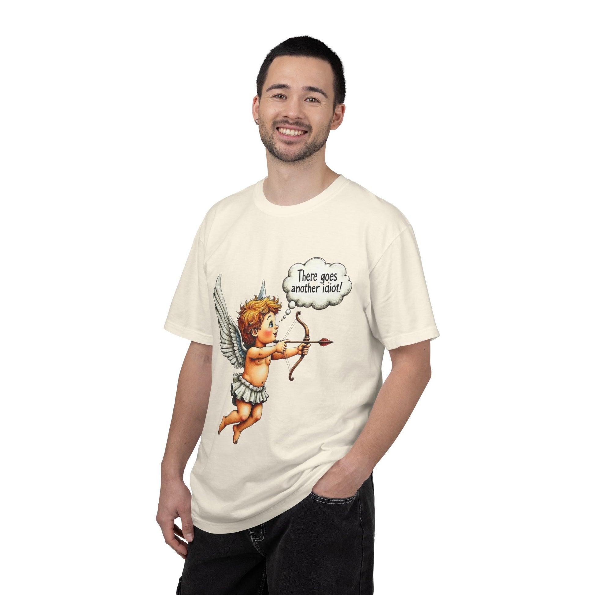 A soft, garment-dyed tee that wears in like an old favorite and carries a wink. The vintage-style cherub illustration is playful and a little cheeky — a tiny cupid drawing back his arrow with a thought bubble that reads “There goes another idiot!” — printed on a relaxed, heavyweight cotton shirt that keeps its shape. The fabric feels broken-in from day one thanks to post-construction dyeing, and reinforced double-needle seams mean this shirt stands up to regular wear. Sized up to 4XL and offered in many muted, lived-in colors, it’s the kind of casual shirt you reach for when you want to make people smile (and roll their eyes) without trying too hard.