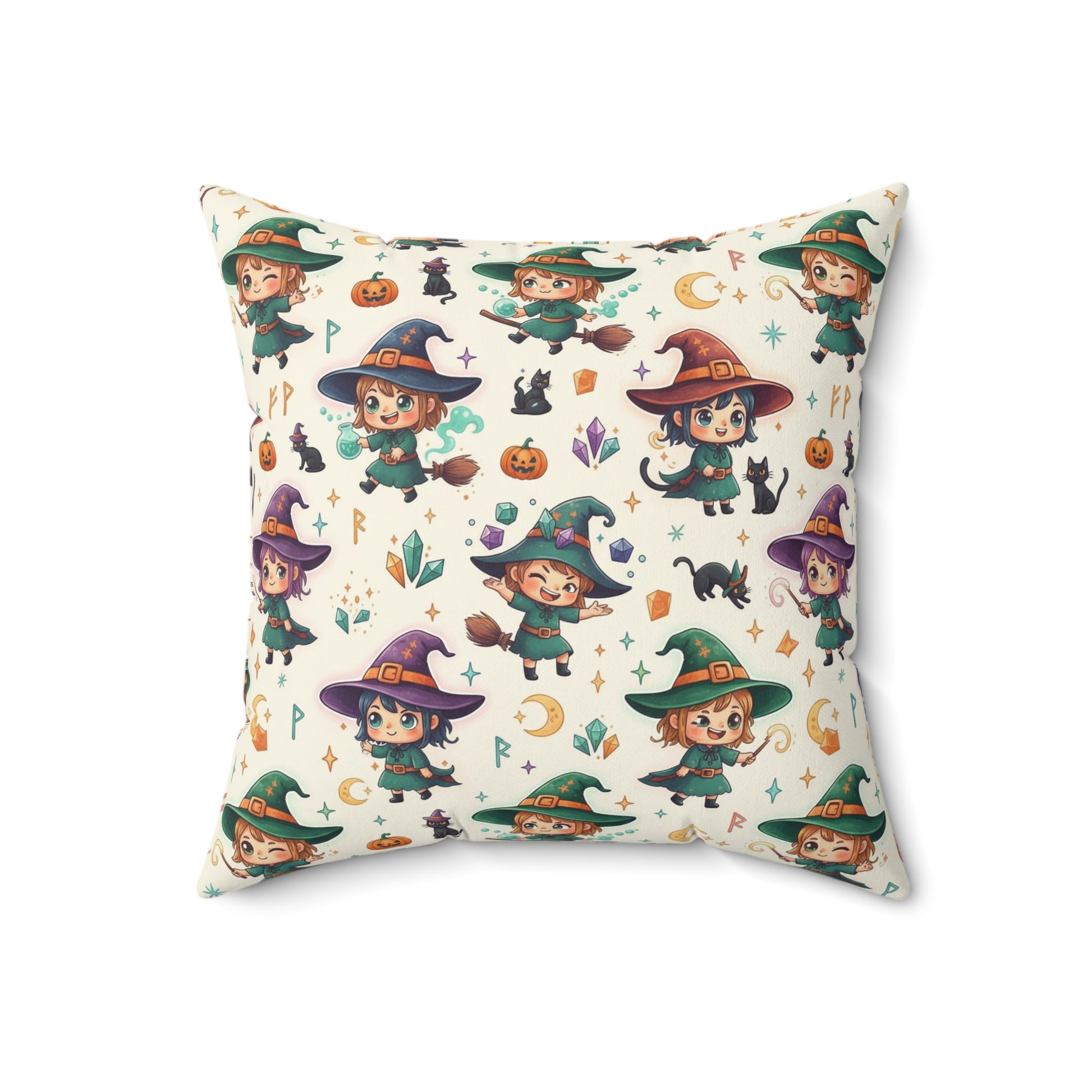 Curl up with a cozy accent that brings a touch of whimsical magic to any room. This spun polyester square pillow features double-sided, full-bleed art of cheerful little witches, moons, stars, and tiny creatures on a warm cream background. The print reads like a page from a storybook—playful, soft, and slightly vintage—so it makes beds, reading nooks, and sofas feel inviting and imaginative. The cover keeps its shape and resists wrinkles, while the recycled polyester insert arrives vacuum-packed to save space and fluffs up larger than the cover for a lush, rounded look once assembled. The concealed beige zipper with a metal head blends into the design for a clean finish. Brighten a nursery corner, accent a seasonal display, or tuck into a camper’s lounge—this pillow brings quiet, cozy charm wherever it goes.