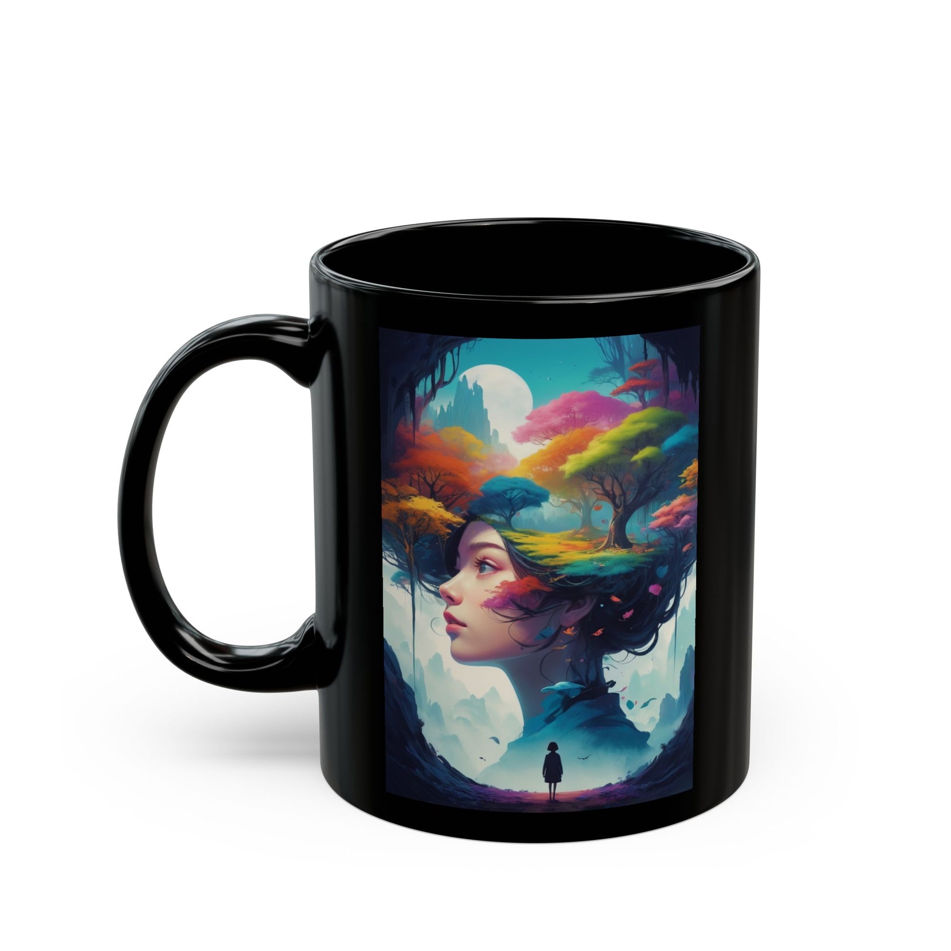 This glossy black ceramic mug turns a morning ritual into a small, private journey. A vibrant, dreamy illustration wraps the front: a lone silhouette stands beneath a moonlit sky while a giant, ethereal face blooms into colorful trees and clouds. The deep black gloss makes the colors pop, framing the artwork like a window into another world. It feels thoughtful and quiet—made for slow sips, sketchbook mornings, or late-night ideas. Robust enough for daily use, it keeps the image bright through regular dishwasher and microwave cycles so the story stays with you.