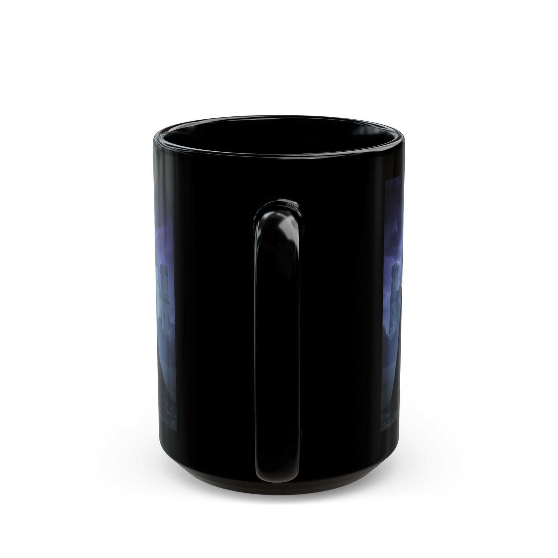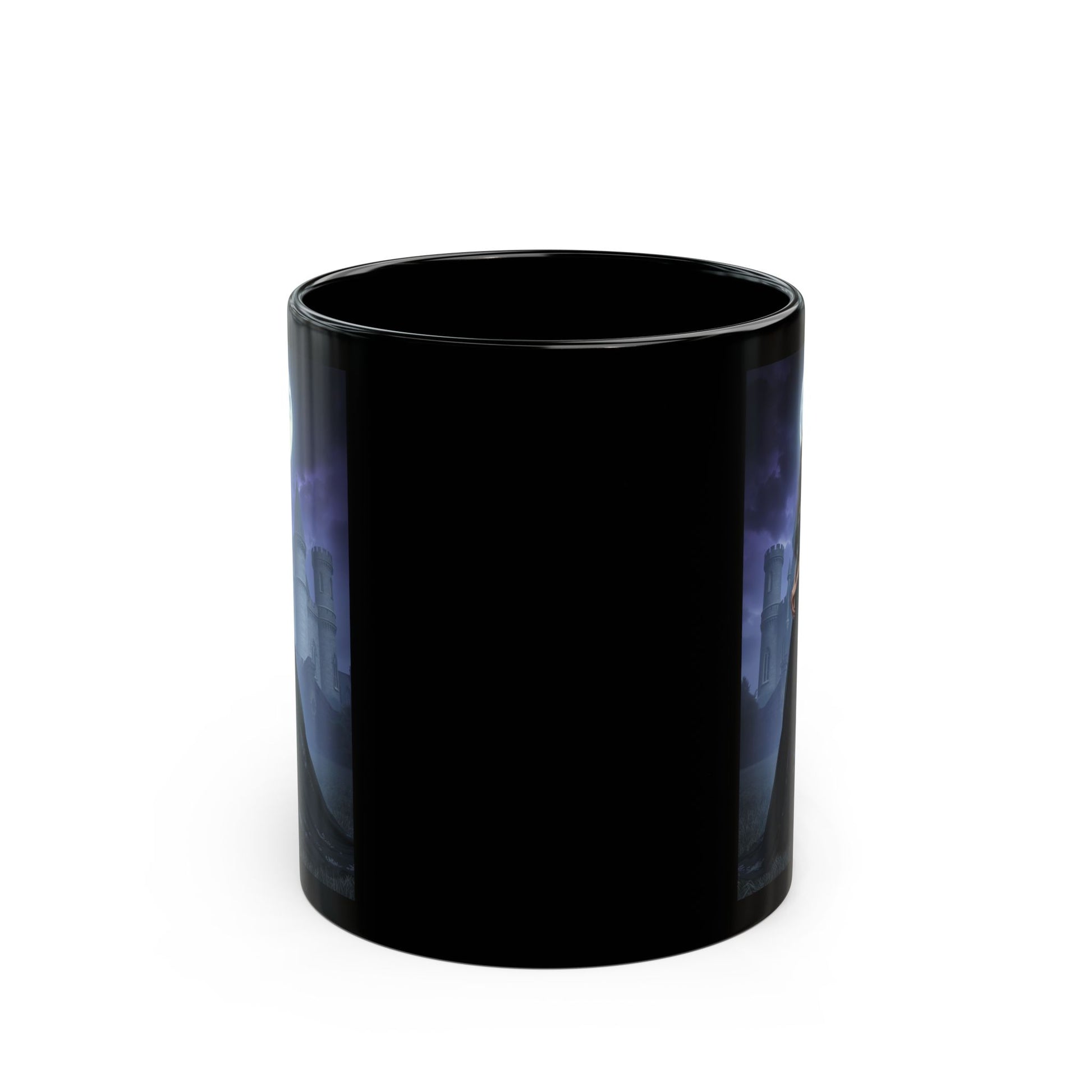 Sip something dark and atmospheric from this glossy black ceramic mug. A moonlit portrait wraps the side: a woman in a flowing black gown standing before ancient stone towers under a full, silver moon. The deep blacks and vivid night hues hold their detail on the shiny surface, making each hot drink feel like a moment stolen from a gothic story. It settles easily in the hand with a C-shaped handle and keeps the scene sharp through everyday use — from morning coffee to late-night tea while writing or reading by candlelight.