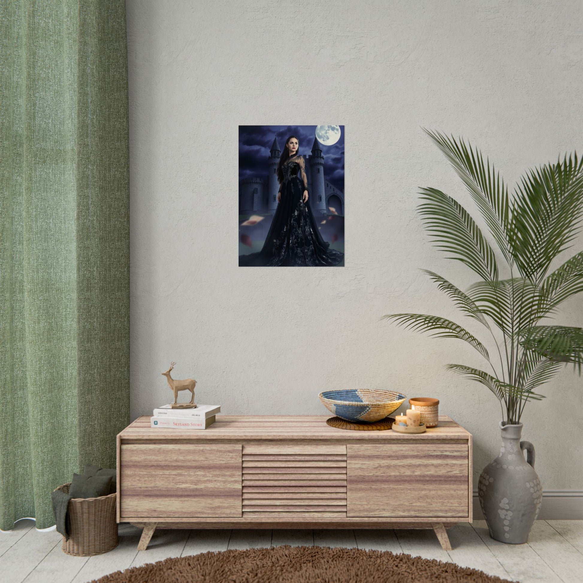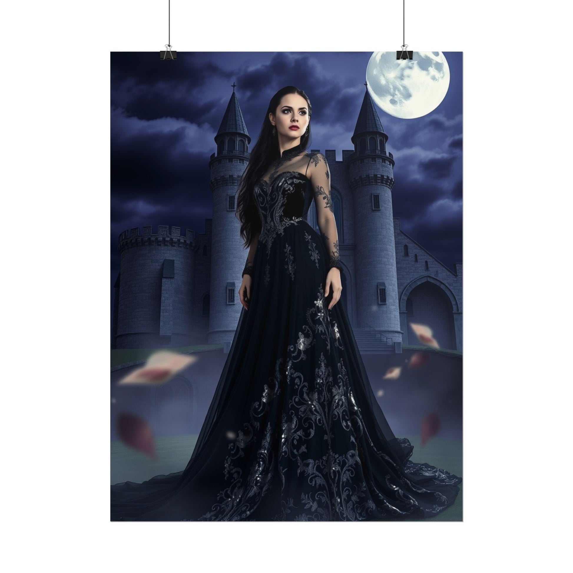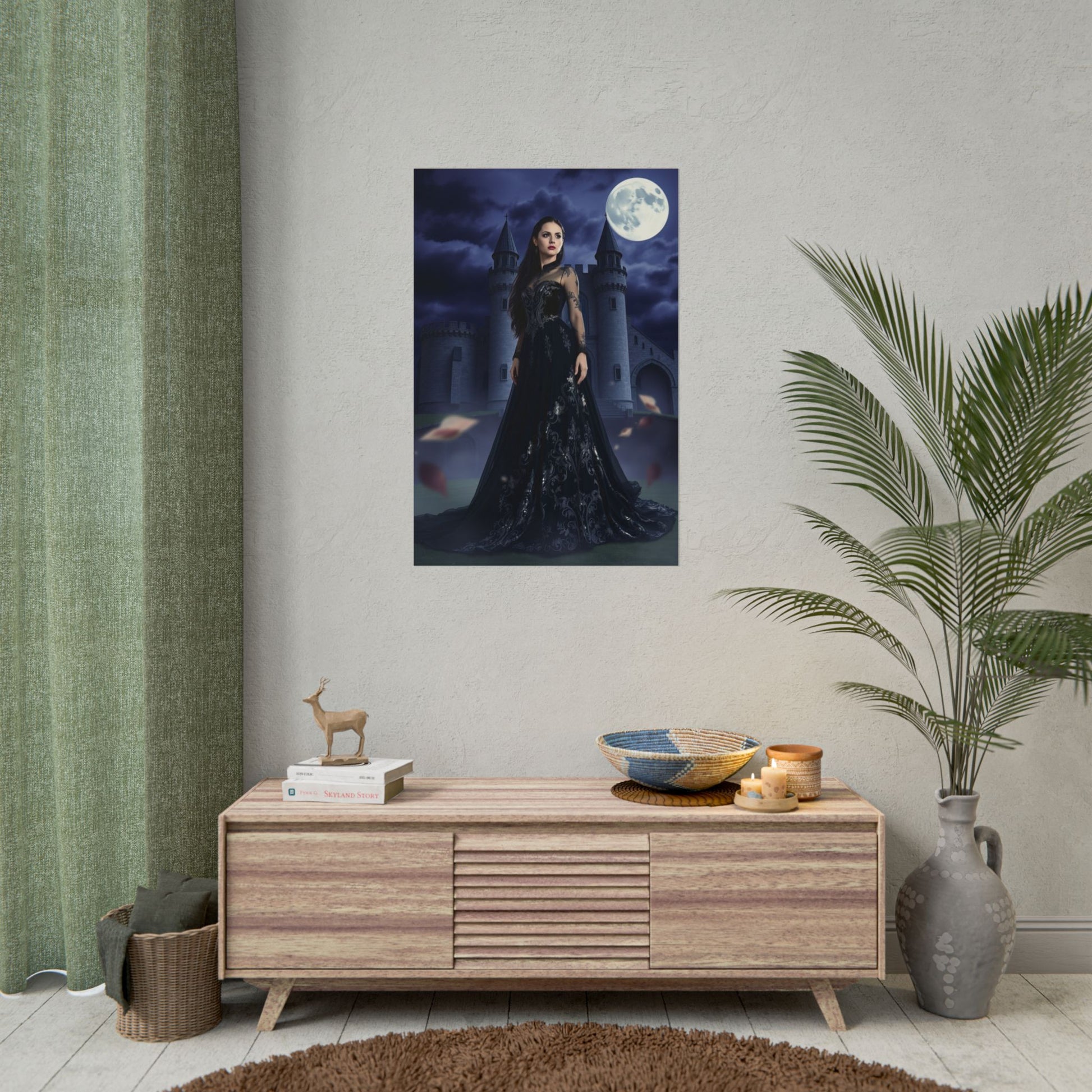 A moody, cinematic poster that brings a gothic fairytale to your walls. Moonlight spills over a lone castle while a dark-clad figure stands with quiet resolve — equal parts mystery and quiet power. The deep blues and inky blacks of the sky and gown hold detail in every fold, so the scene reads beautifully from across a room or up close. Choose fine art for textured, archival depth; semi-gloss for crisp, vivid photographic color; or matte for a softer, museum-like finish. Hung above a reading nook, in a home studio, or framed in a hallway, this piece sets a dramatic, atmospheric tone without shouting for attention.