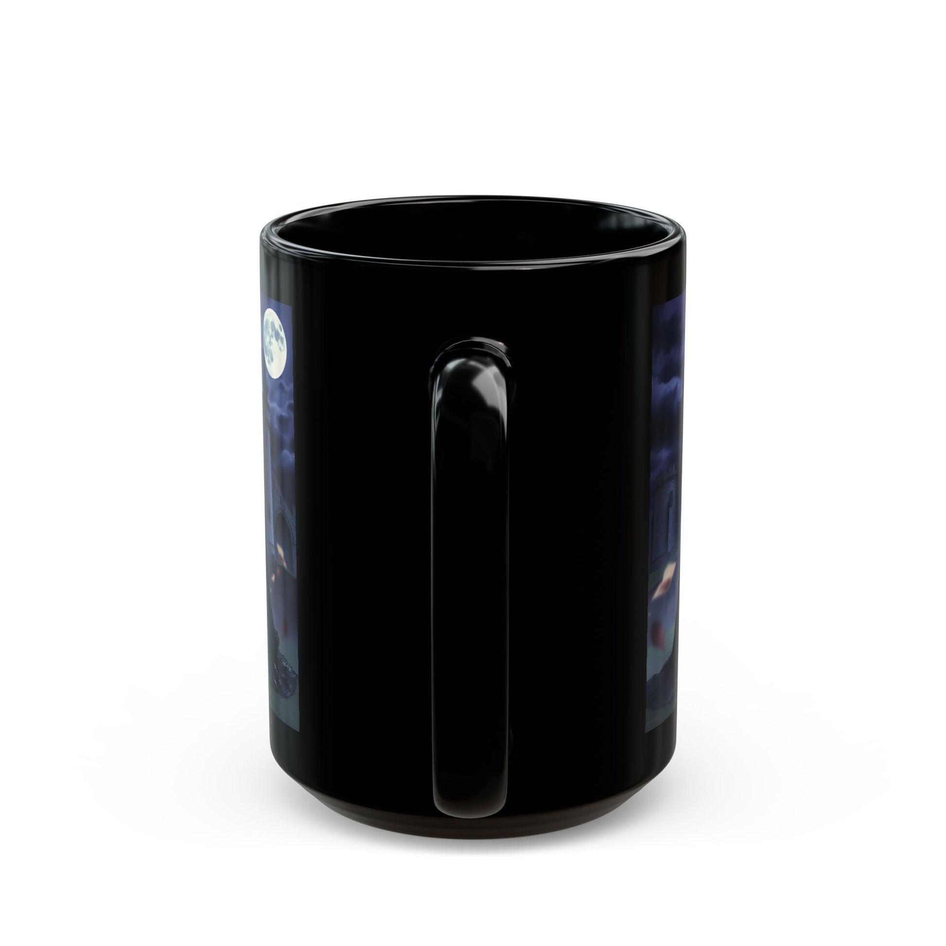 Sip slowly and let the night unfold. This glossy black ceramic mug carries a moody, moonlit scene: a lone figure in a flowing dark gown standing before a stone castle beneath a full, luminous moon. Deep indigo skies, drifting petals, and subtle fog wrap the image in quiet mystery. The black background makes the artwork feel like a window into a secret hour—coffee, tea, or cocoa becomes part of that moment. It fits nights when you’re writing by lamplight, curled with a gothic novel, or settling in after a long day to reconnect with the darker, softer side of your imagination.