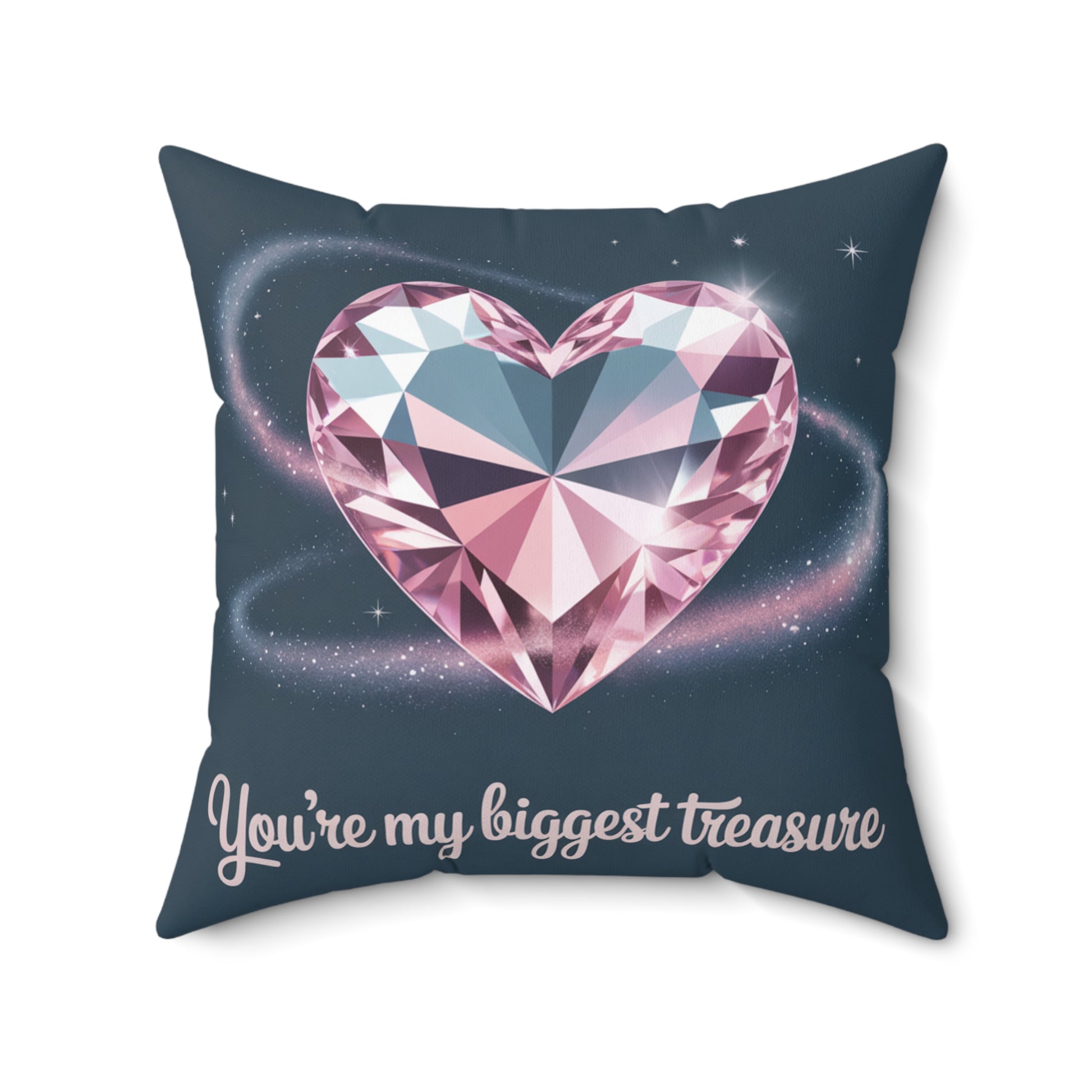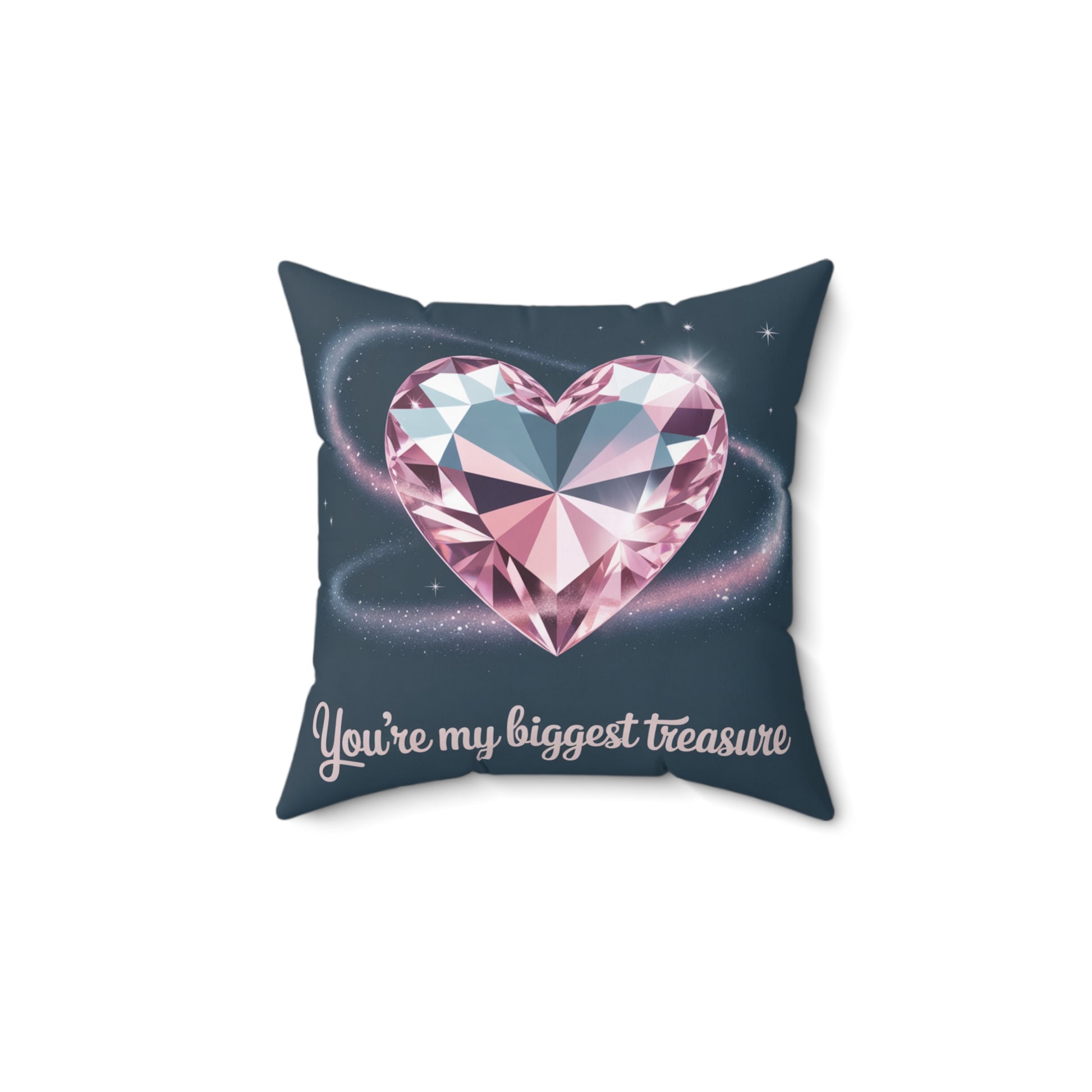A soft, square decorative pillow that brings a touch of sparkle and warmth to a bedside, couch, or reading nook. The double-sided print showcases a faceted pink heart gemstone set against a deep, star-speckled background with a swirling halo of glitter — beneath it a handwritten-style sentiment reads "You're my biggest treasure." The spun polyester cover holds color and shape without wrinkling, and the concealed beige zipper keeps the look seamless. The recycled polyester insert ships vacuum-packed so you assemble it for an extra-plush, full finish. This pillow feels like a quiet love note in fabric — sentimental, cozy, and made to be hugged while you unwind.