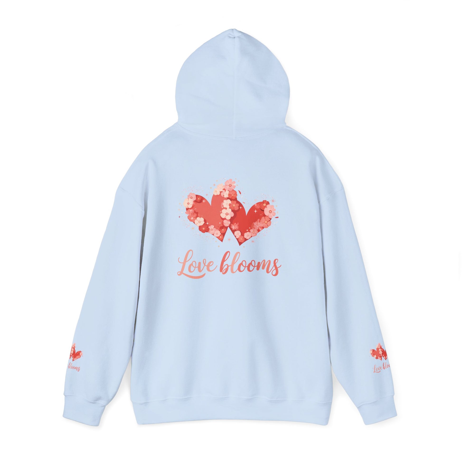 Soft, cozy hoodie with a gentle, romantic graphic that reads “Love blooms.” A watercolor-style heart made of tiny floral shapes sits on the back, while matching floral accents decorate the wrists. The roomy kangaroo pocket and double-lined hood add everyday comfort. Subtle, hand-drawn typography and blush-pink tones create a warm, intimate vibe—great for slow mornings, coffee dates, and quiet evenings with someone special.