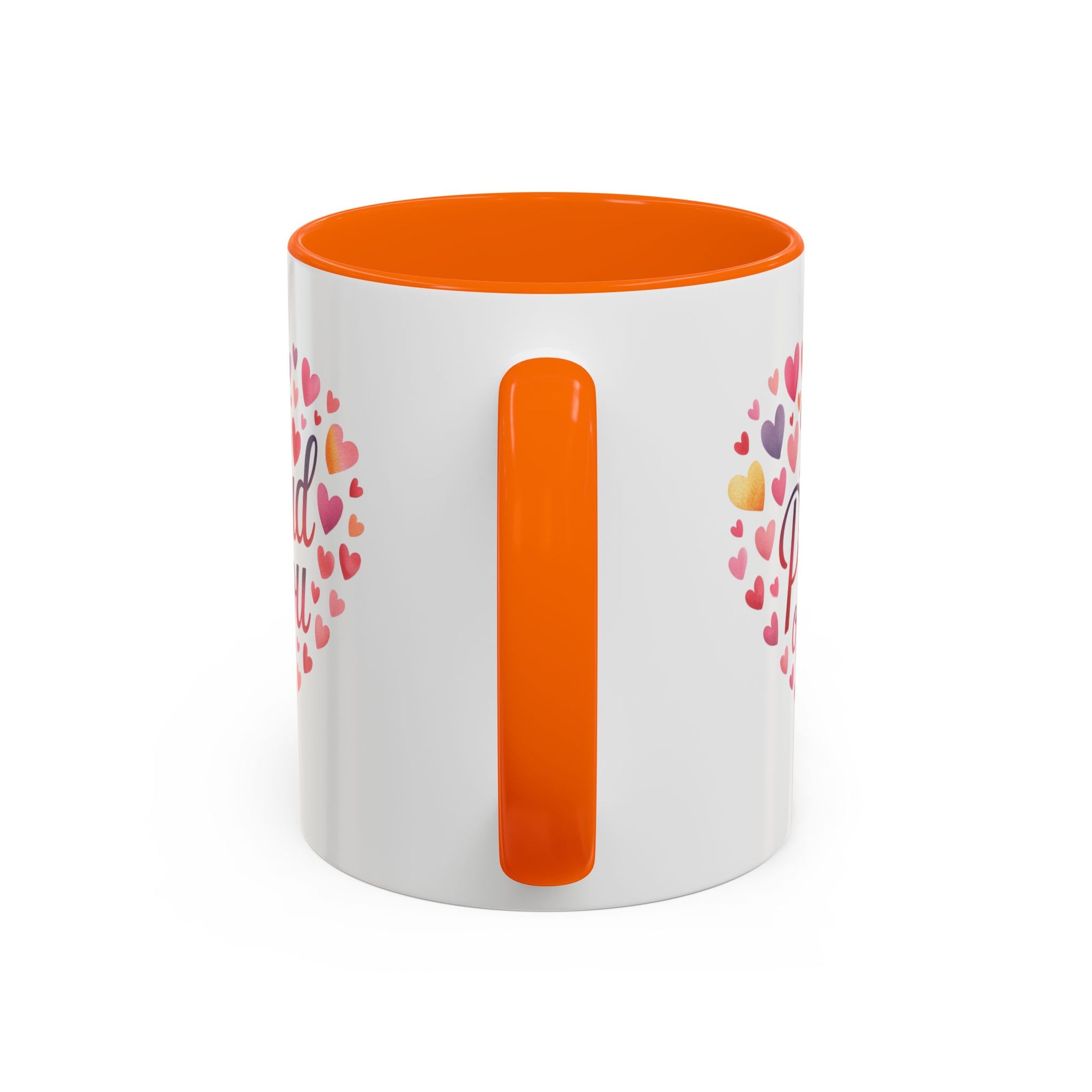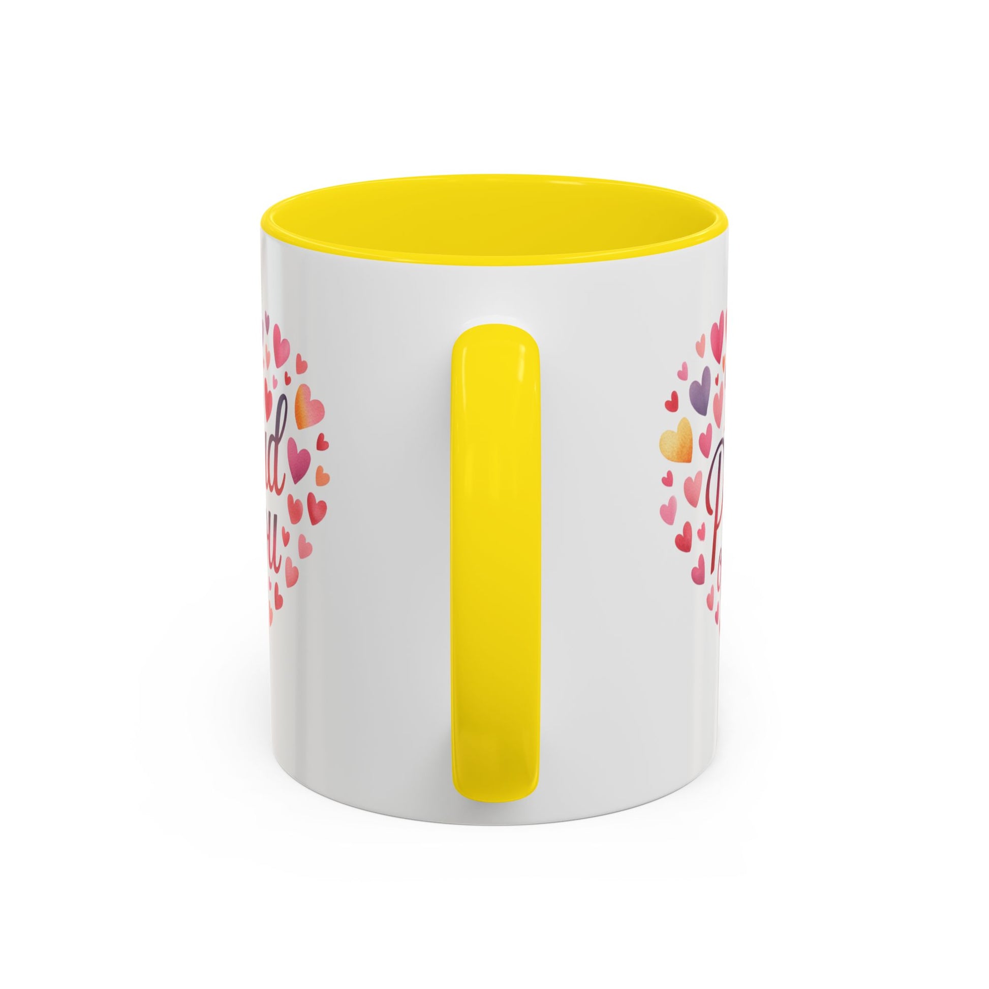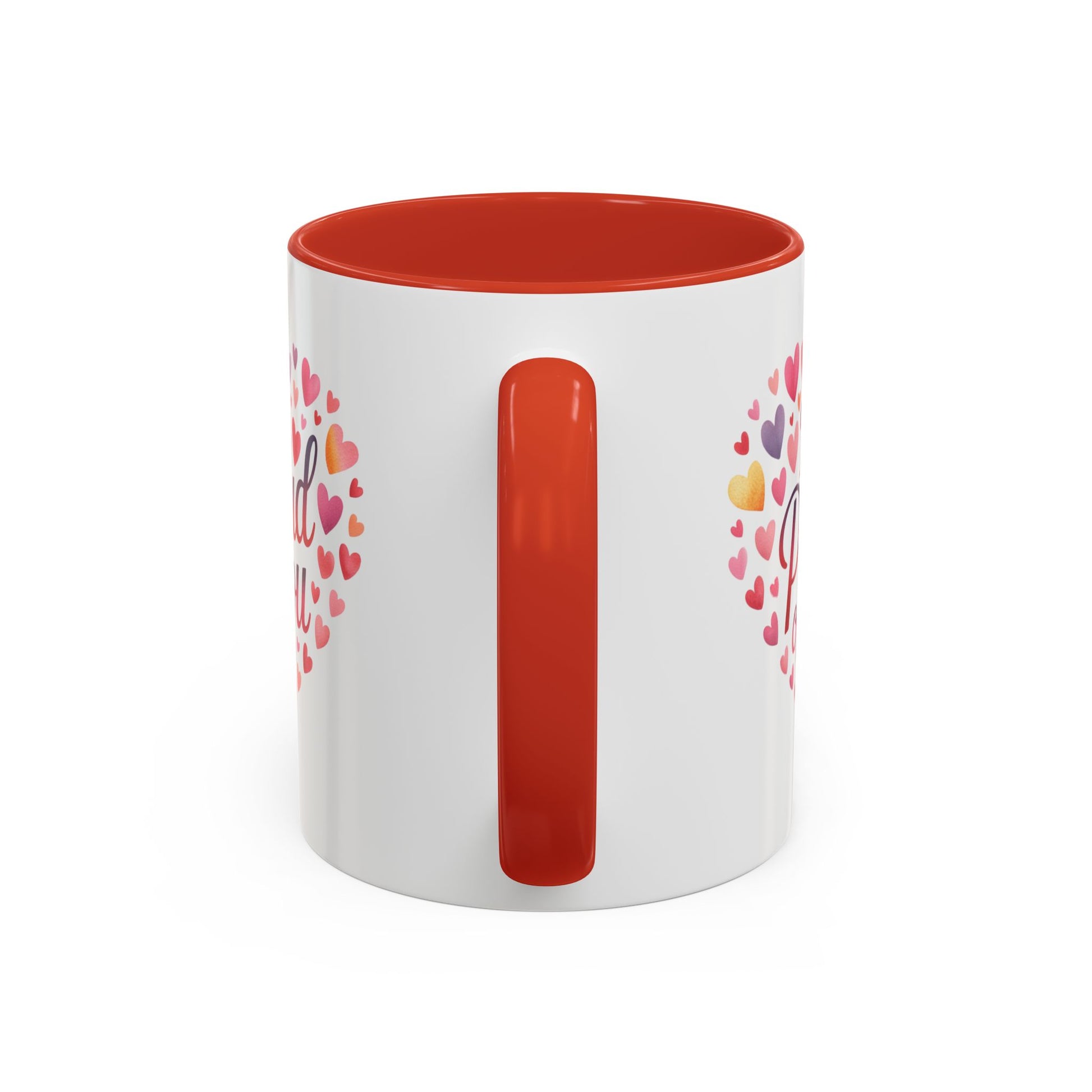 This ceramic mug carries a warm, encouraging message wrapped in a heart of watercolor hearts — a simple daily reminder of pride and support. Its glossy white exterior contrasts with a colored interior and handle, letting the colorful heart design stand out while the dark rim and handle give it a modern, cozy look. Whether morning coffee or evening tea, the sturdy C-handle and two size options make it easy to hold and enjoy. Safe for microwave reheats and dishwasher cleaning, it blends everyday practicality with a personal, heartfelt touch.