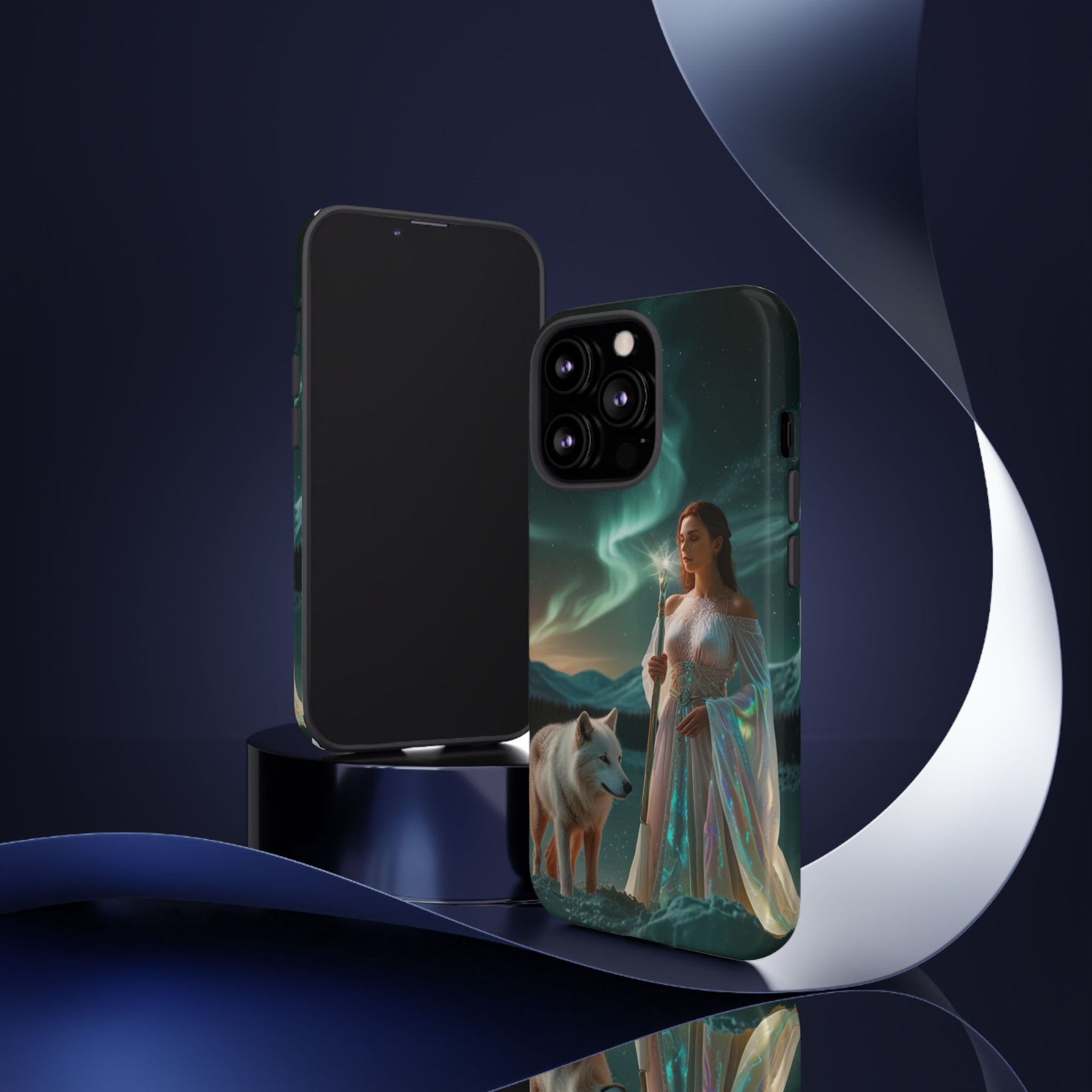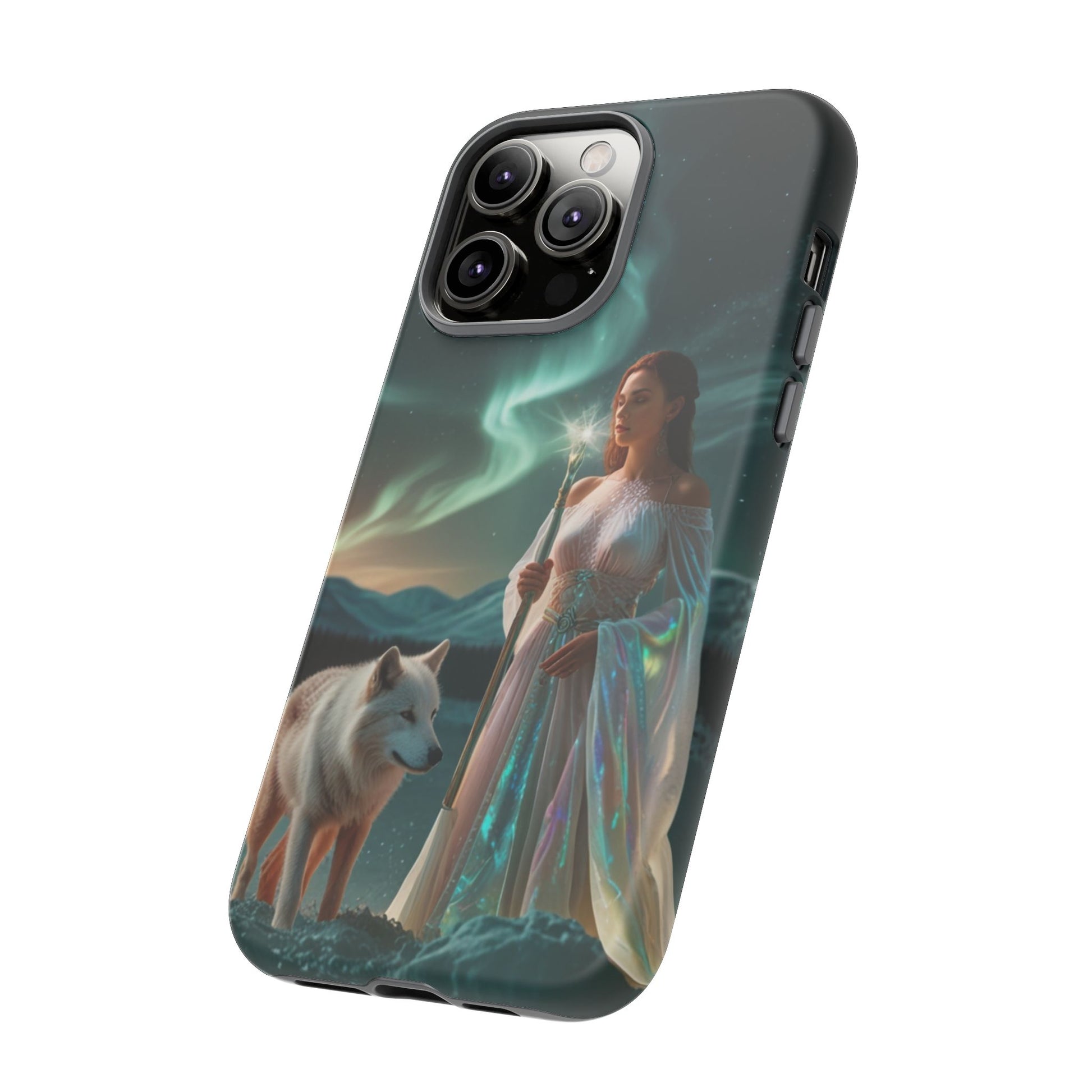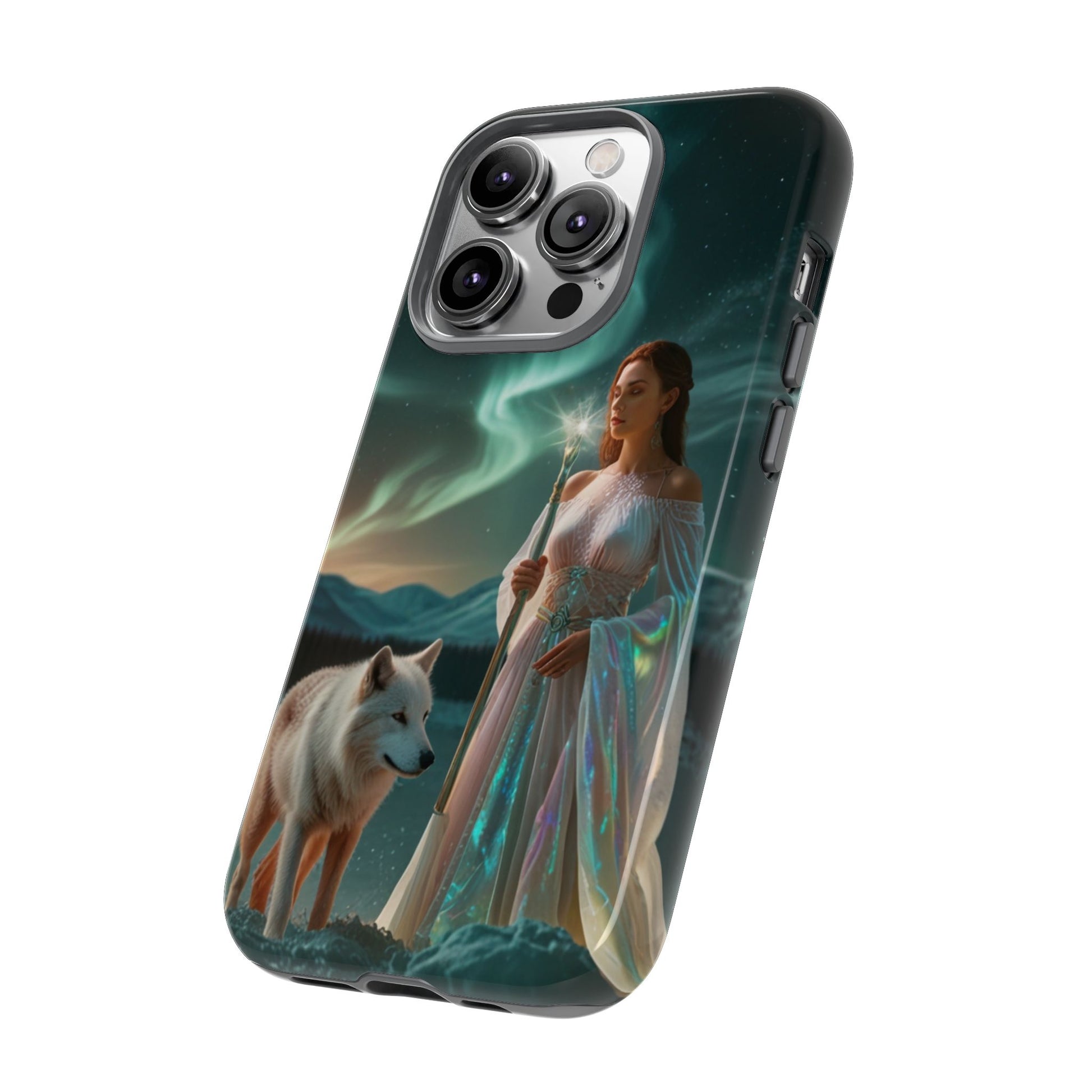 A durable, artful phone case that turns your device into a tiny window to a northern-magic scene. The image shows a serene, robed woman holding a glowing staff beside a watchful white wolf beneath shimmering aurora skies. Deep greens and teal lights wrap around rolling hills, giving the case a calm, otherworldly mood. The dual-layer construction and silicone liner protect against drops while keeping the printed artwork vivid with a full 3D wrap. This case fits into a life that values quiet adventure and visual storytelling — carried on night walks, tucked into a jacket pocket at a winter festival, or held steady while capturing long-exposure photos of the sky. It speaks to those who appreciate mythic imagery and reliable protection without sacrificing style.