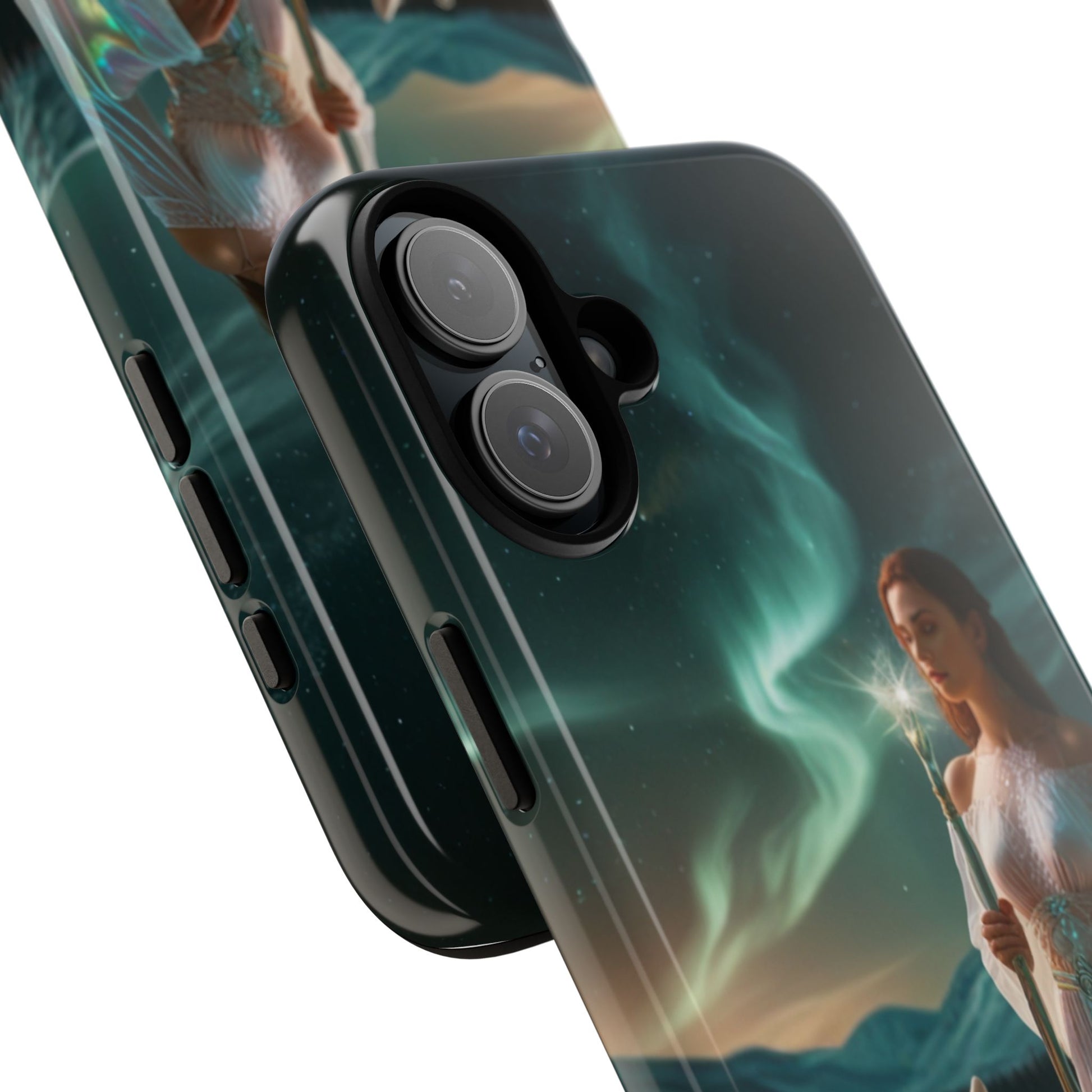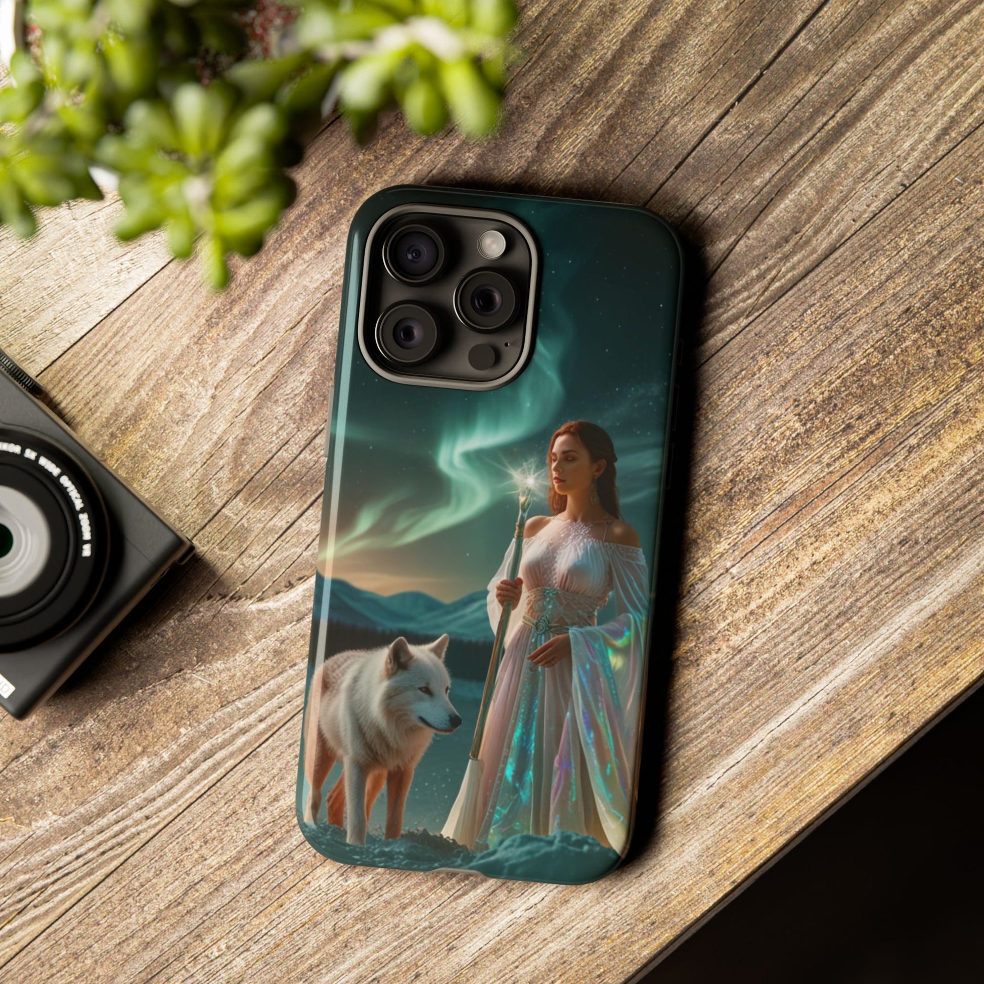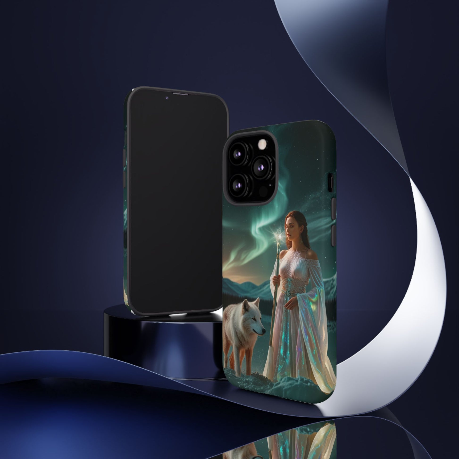 A durable, artful phone case that turns your device into a tiny window to a northern-magic scene. The image shows a serene, robed woman holding a glowing staff beside a watchful white wolf beneath shimmering aurora skies. Deep greens and teal lights wrap around rolling hills, giving the case a calm, otherworldly mood. The dual-layer construction and silicone liner protect against drops while keeping the printed artwork vivid with a full 3D wrap. This case fits into a life that values quiet adventure and visual storytelling — carried on night walks, tucked into a jacket pocket at a winter festival, or held steady while capturing long-exposure photos of the sky. It speaks to those who appreciate mythic imagery and reliable protection without sacrificing style.