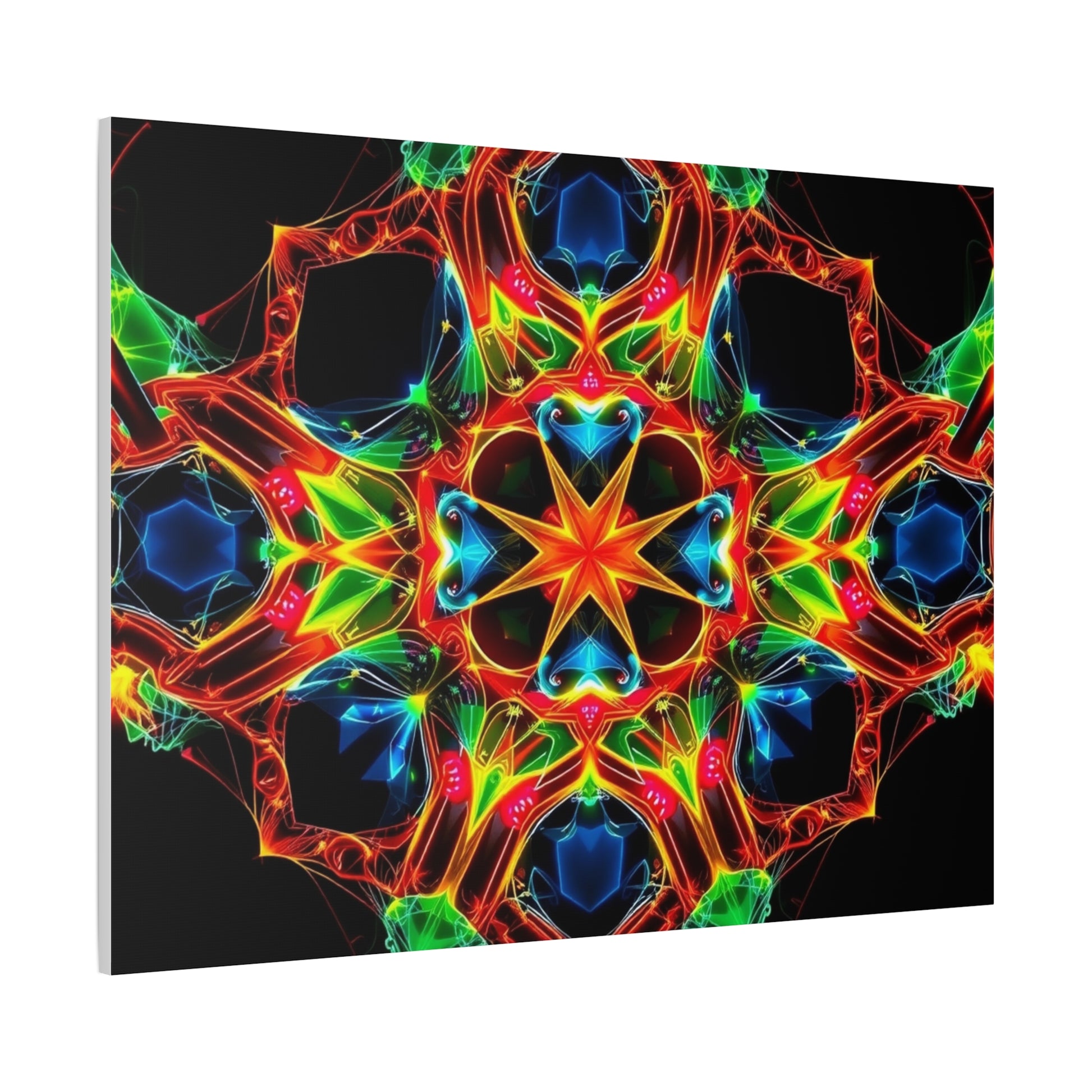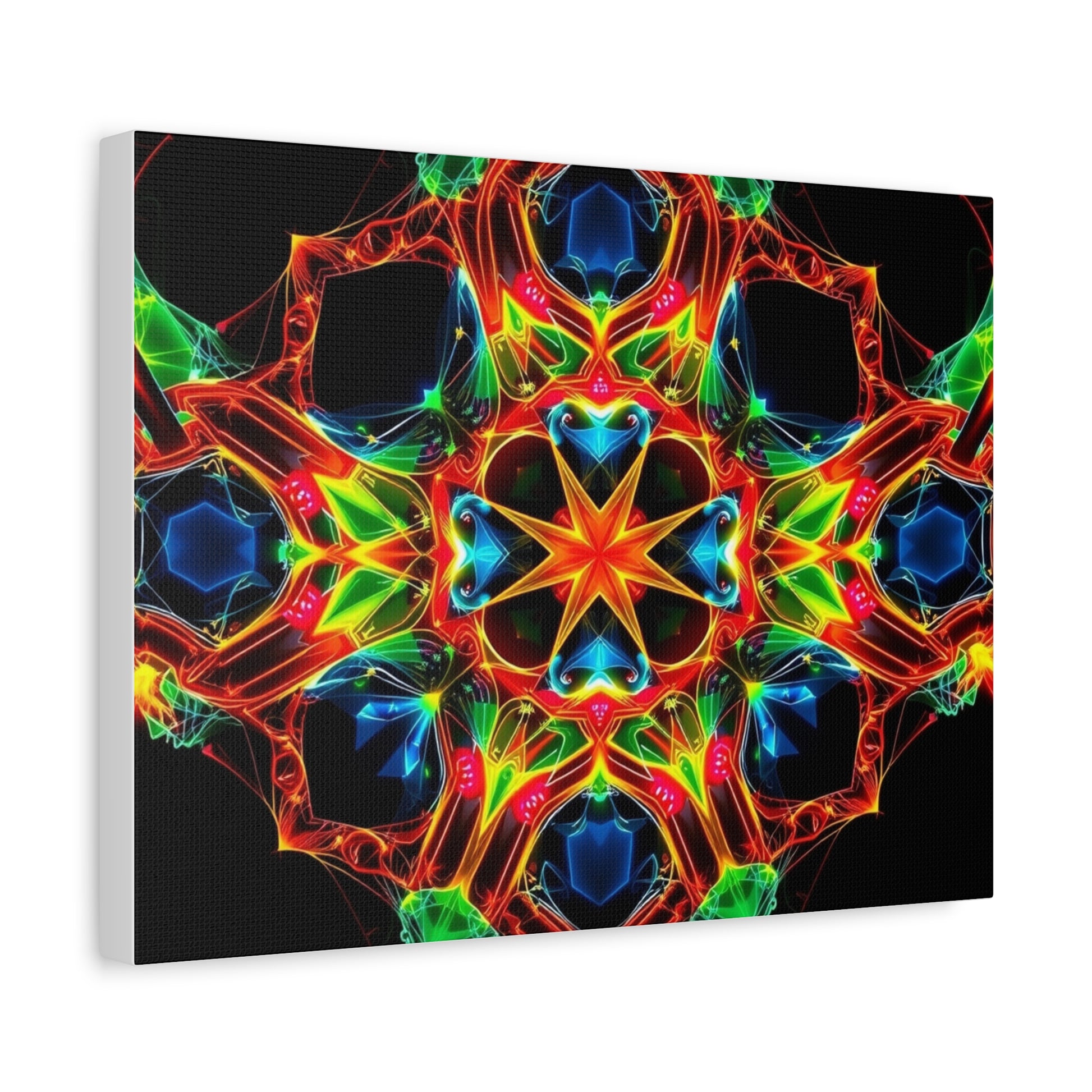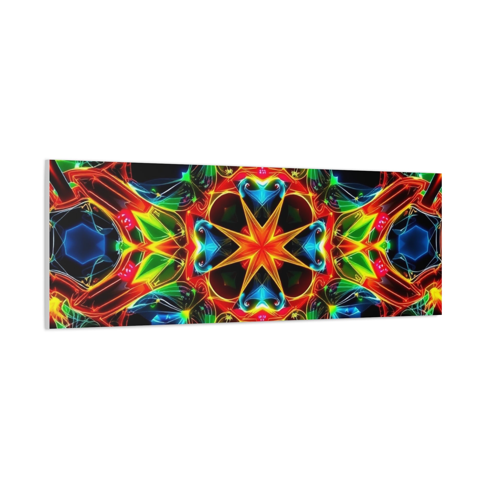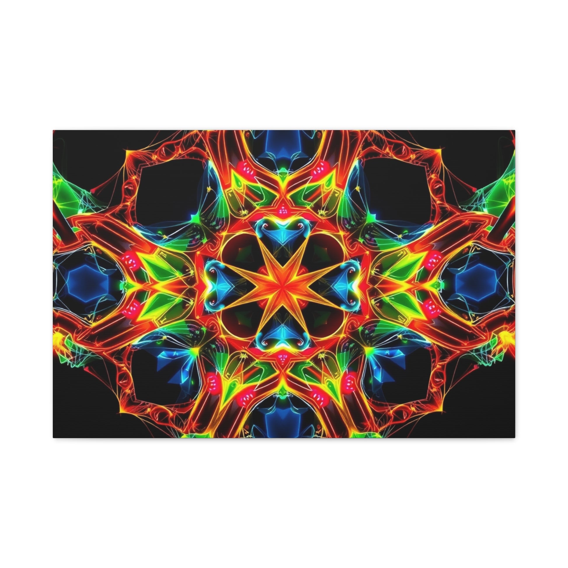 Bright, kaleidoscopic energy printed on a matte stretched canvas that brings color and motion to a room. The vivid mandala-like pattern sits on a deep black field, letting each neon hue—emerald, cobalt, flame, and gold—pop with luminous clarity. Lightweight yet sturdy, the canvas arrives stretched over a slim 1.25" pine frame with a finished back hanger and soft rubber dots to keep it steady on the wall. It reads like a moment of handcrafted light: meditative, electric, and quietly bold. Hang it in a studio, over a media console, or in a cozy reading nook to pull the space together and start conversations.