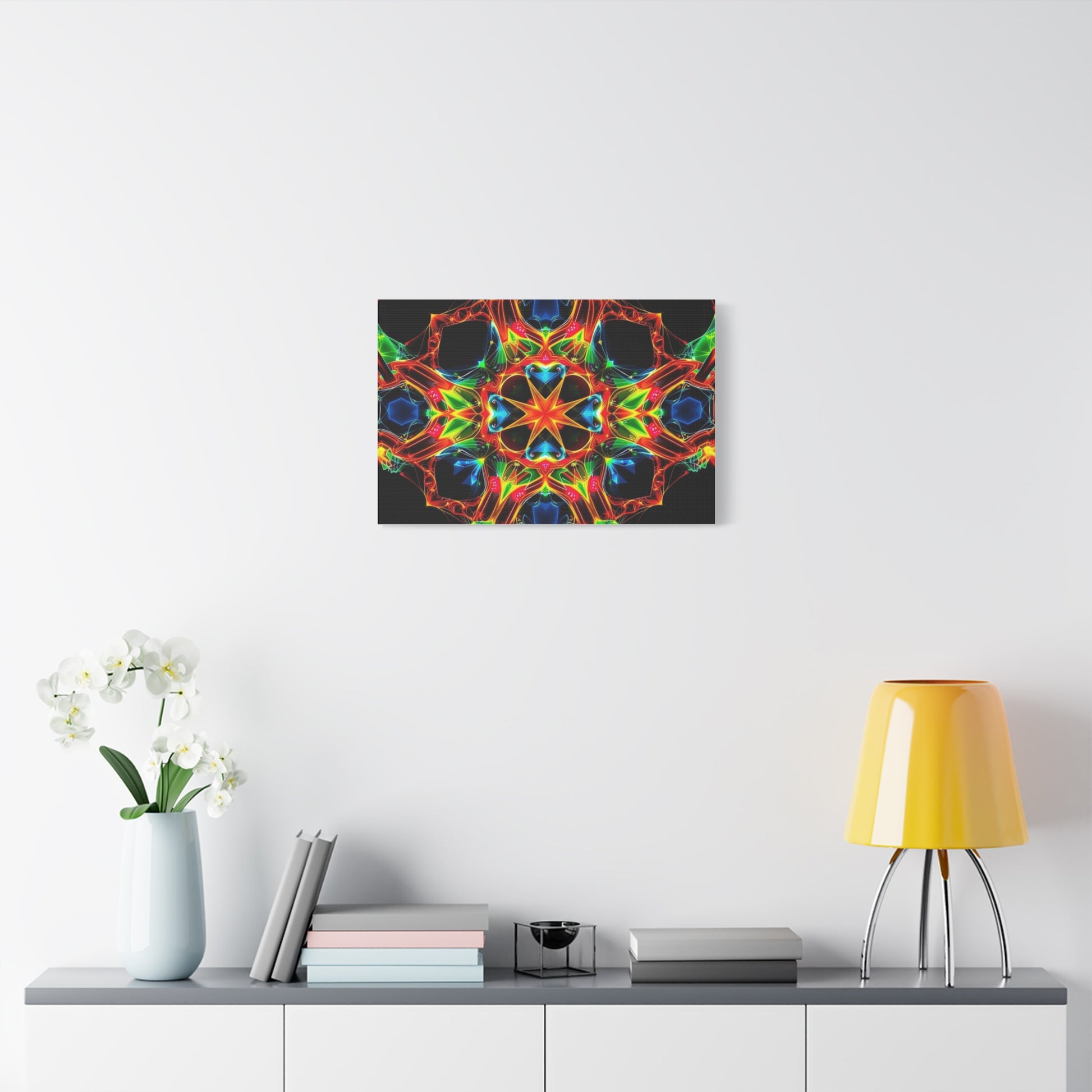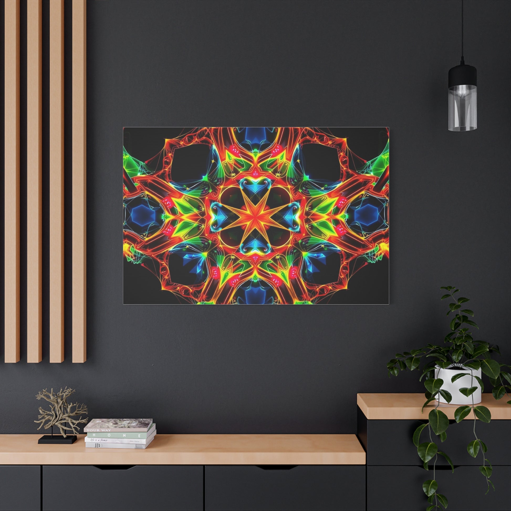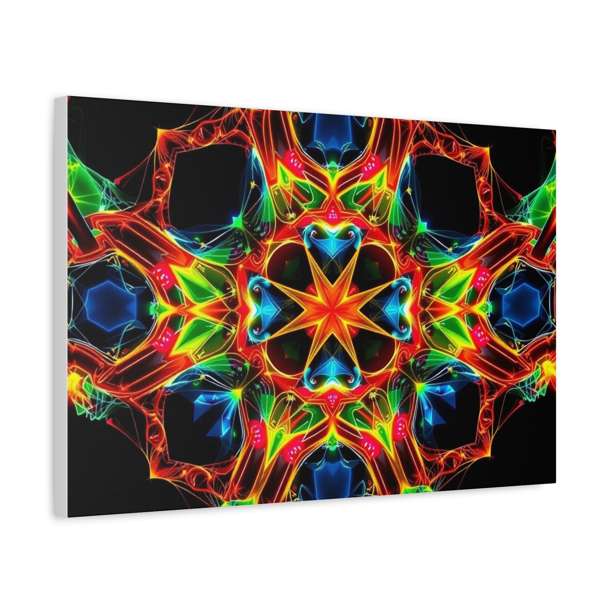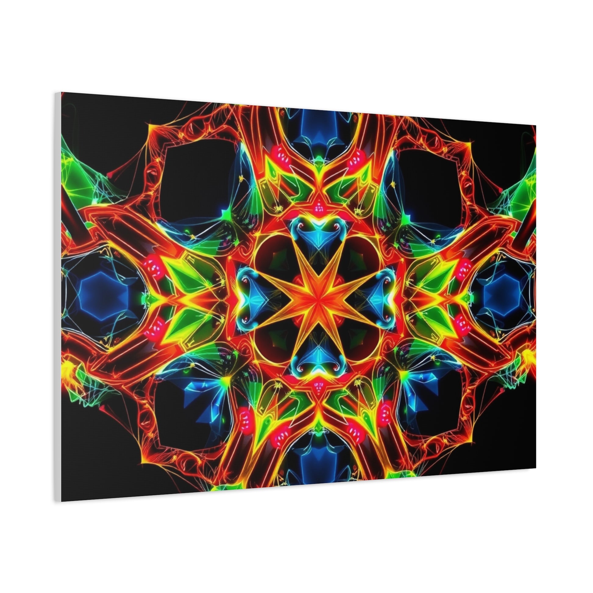 Bright, kaleidoscopic energy printed on a matte stretched canvas that brings color and motion to a room. The vivid mandala-like pattern sits on a deep black field, letting each neon hue—emerald, cobalt, flame, and gold—pop with luminous clarity. Lightweight yet sturdy, the canvas arrives stretched over a slim 1.25" pine frame with a finished back hanger and soft rubber dots to keep it steady on the wall. It reads like a moment of handcrafted light: meditative, electric, and quietly bold. Hang it in a studio, over a media console, or in a cozy reading nook to pull the space together and start conversations.