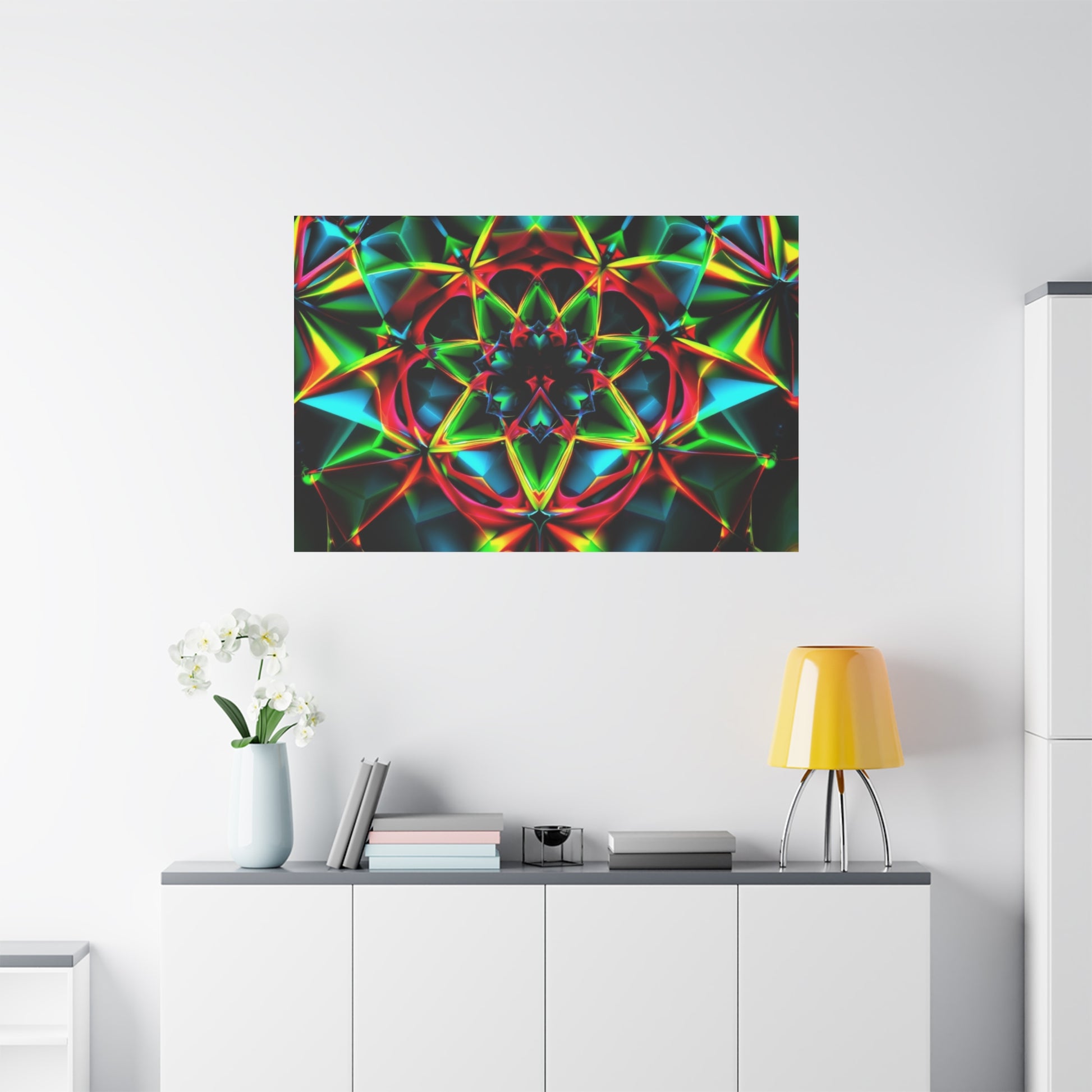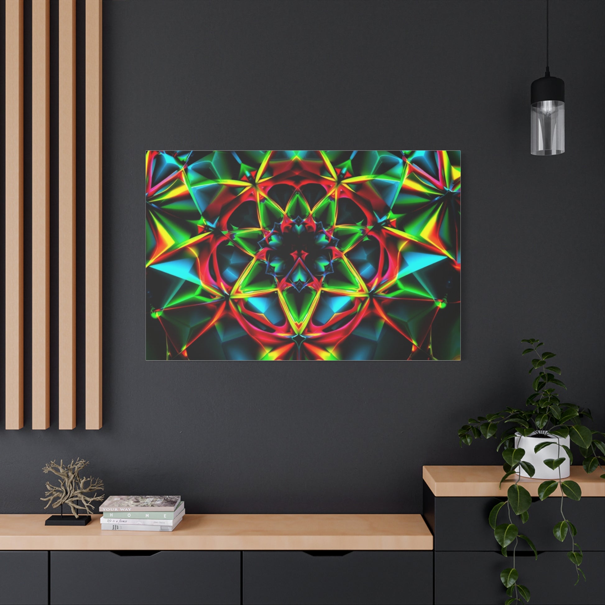 This stretched matte canvas brings a vibrant, kaleidoscopic energy into any room. Rich, jewel-toned colors and mirrored geometric patterns feel alive—like a glowing mandala suspended on the wall. The low-reflective matte surface keeps every color deep and velvety, while the 1.25" pine profile gives a clean, modern presence that floats slightly off the wall. Hang it over a sofa, above a console, or in a cozy reading nook to spark conversations and lift the room’s mood. It pairs especially well with eclectic, bohemian, and contemporary interiors and suits moments when you want a bold, meditative focal point—late-night gatherings, creative sessions, or quiet evenings of reflection.