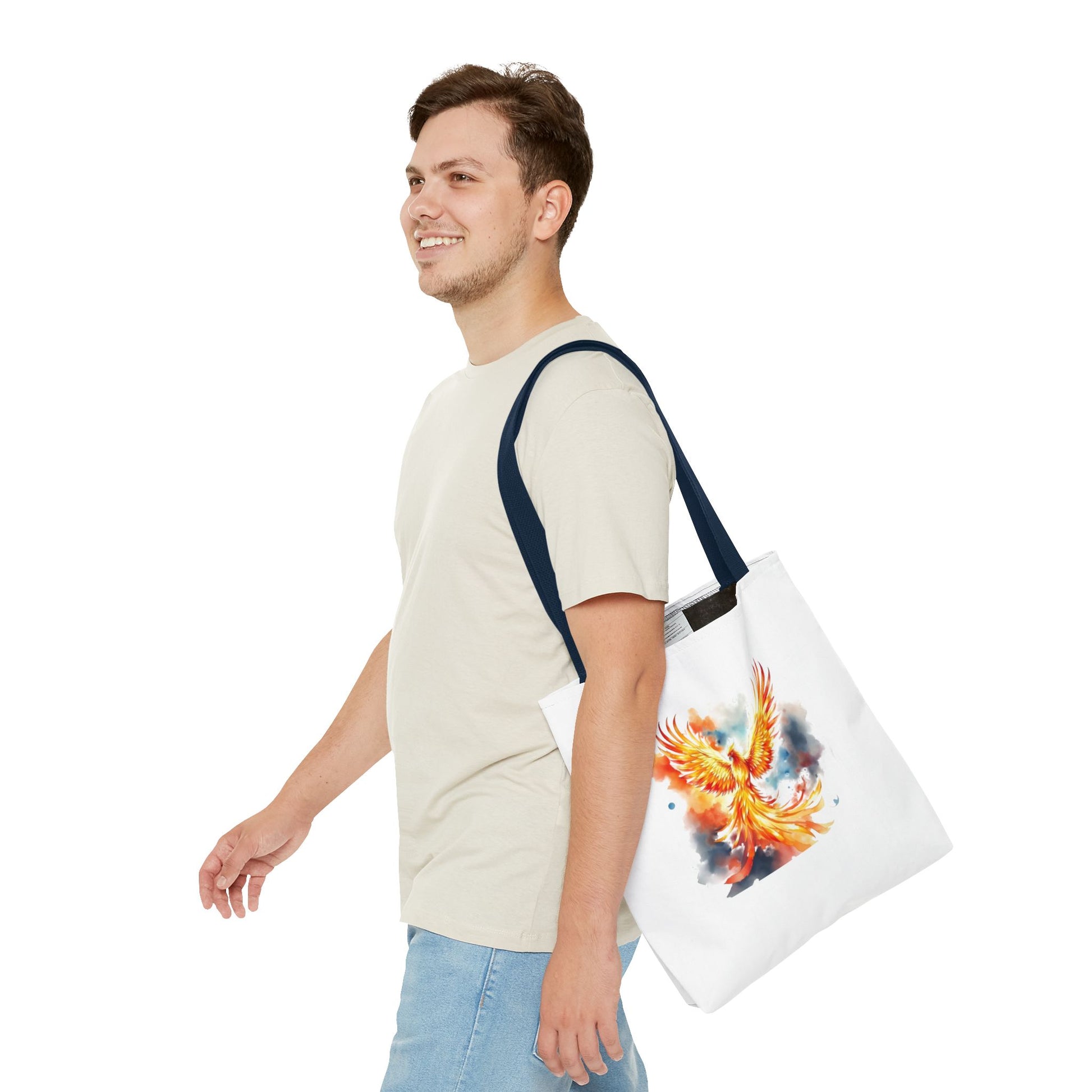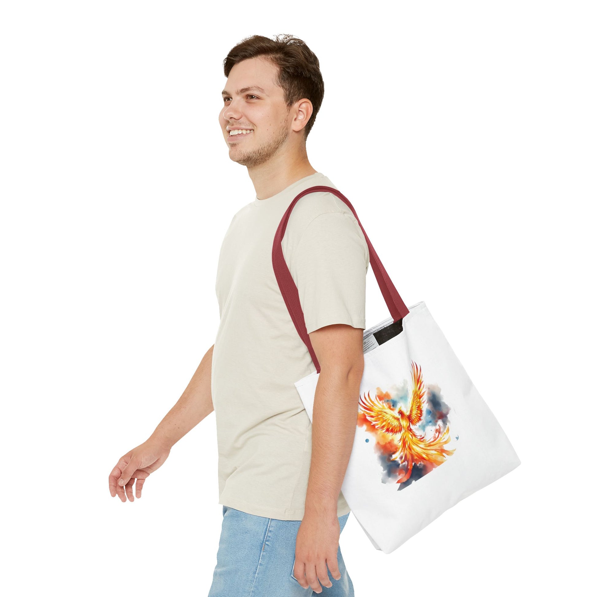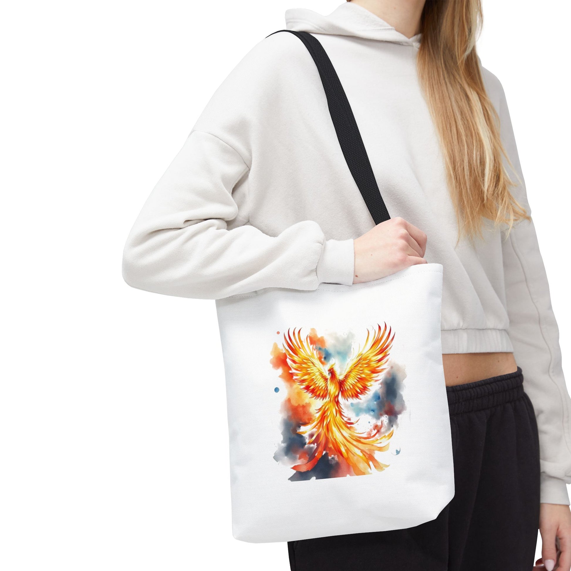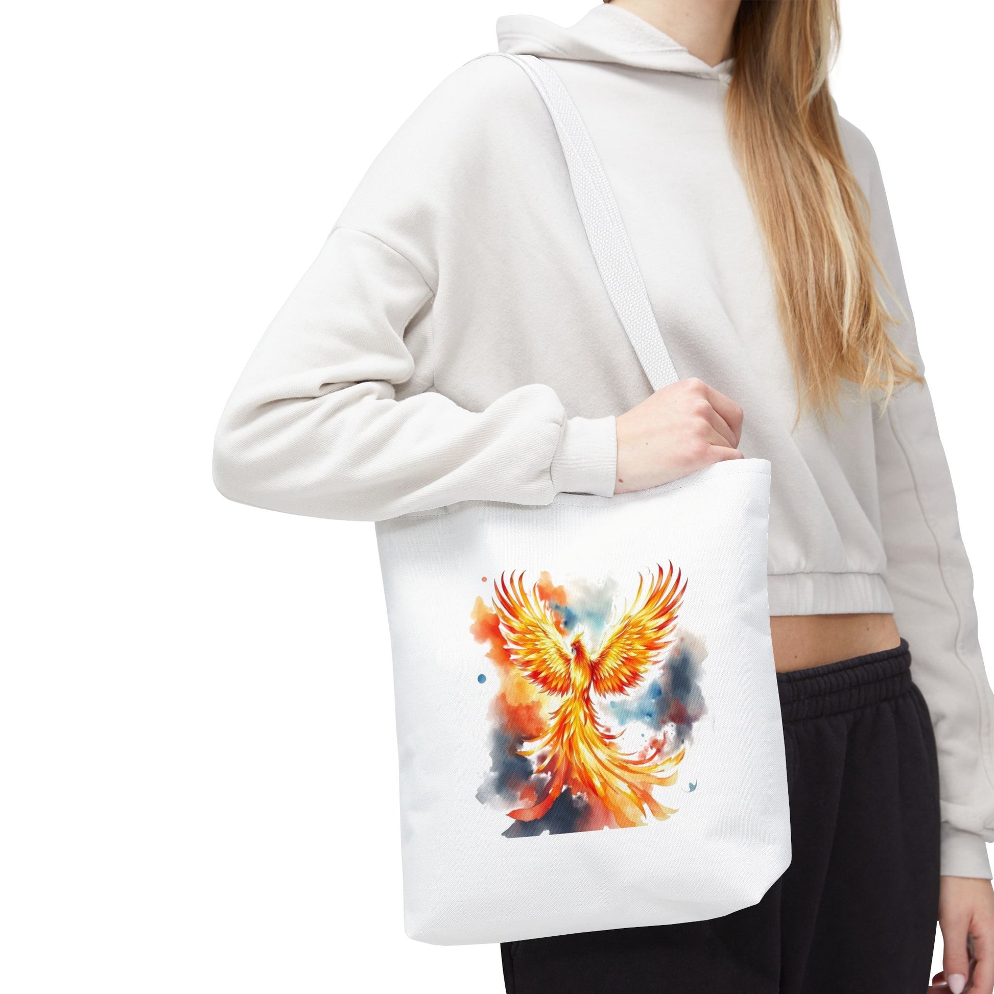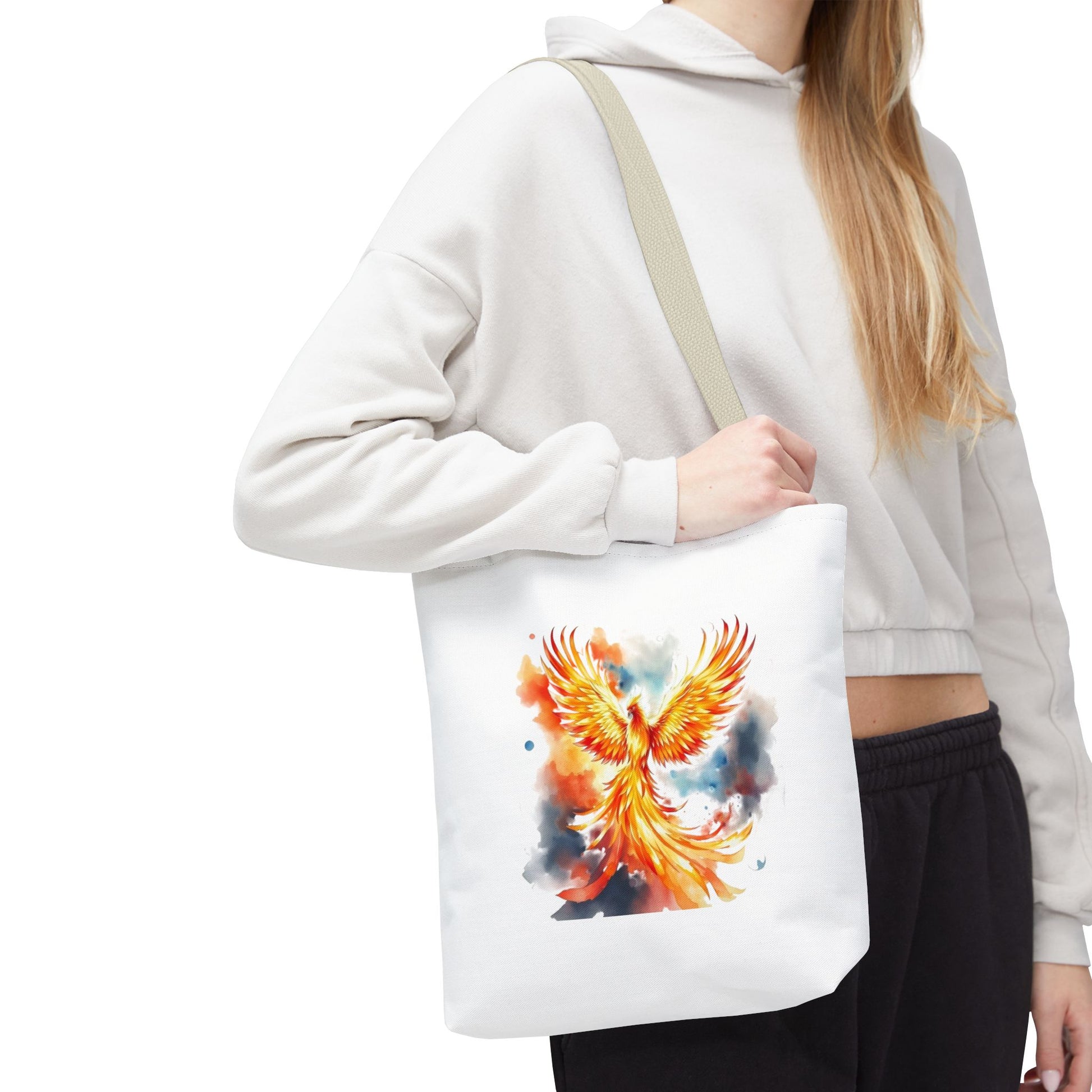 Bright, uplifting, and made to go everywhere with you — this polyester tote carries a watercolor phoenix design that feels like a burst of sunrise. The painting’s flames and soft sky washes give the bag a lively, artistic energy that suits commuters who love color, art students hauling supplies, and anyone who wants a statement piece that’s also practical. The roomy boxed corners create extra carrying space for sketchbooks, market finds, or a laptop sleeve, while reinforced handle stitching and a laminated interior mean this tote stands up to daily use and unexpected weather. It reads like wearable art: bold, hopeful, and ready for the day.