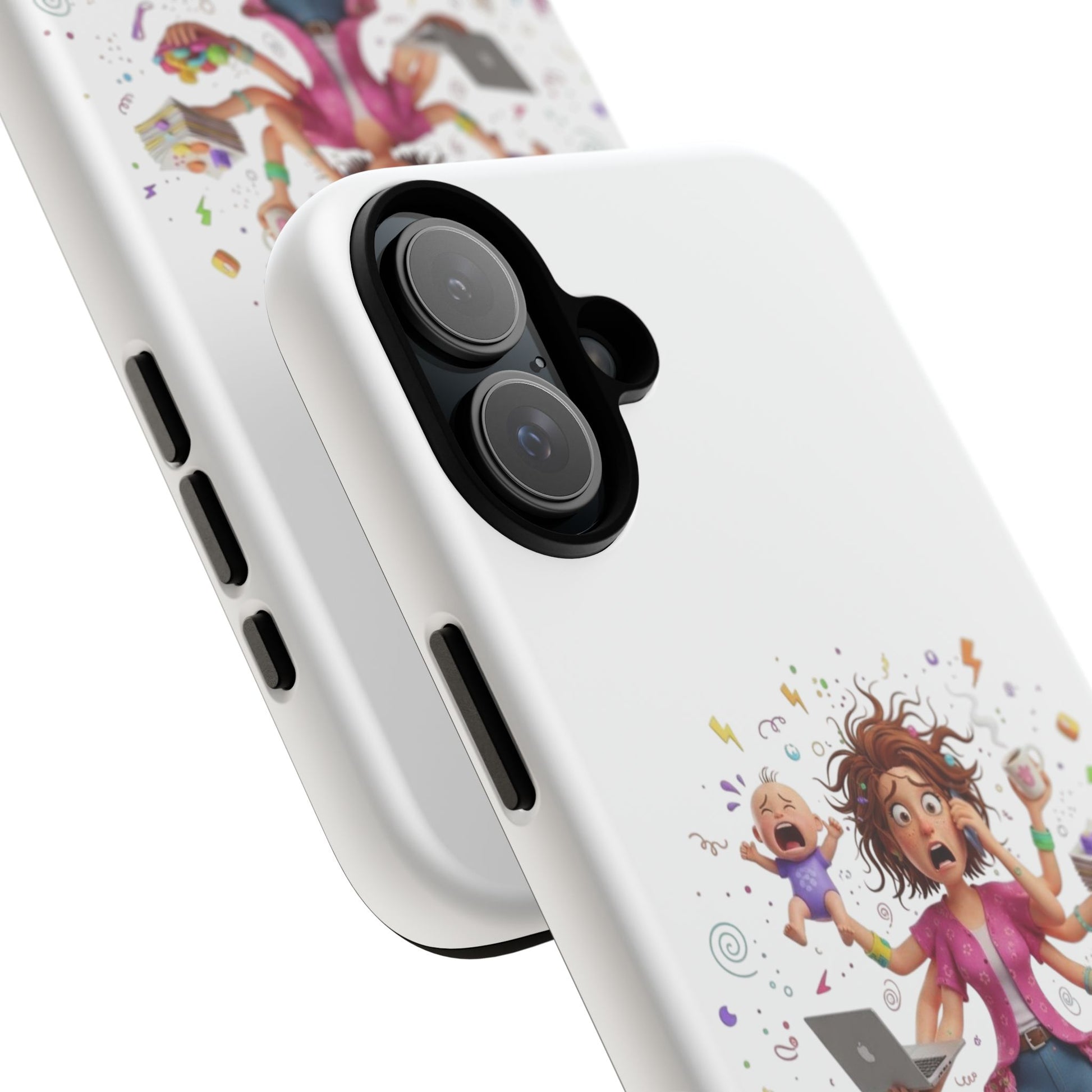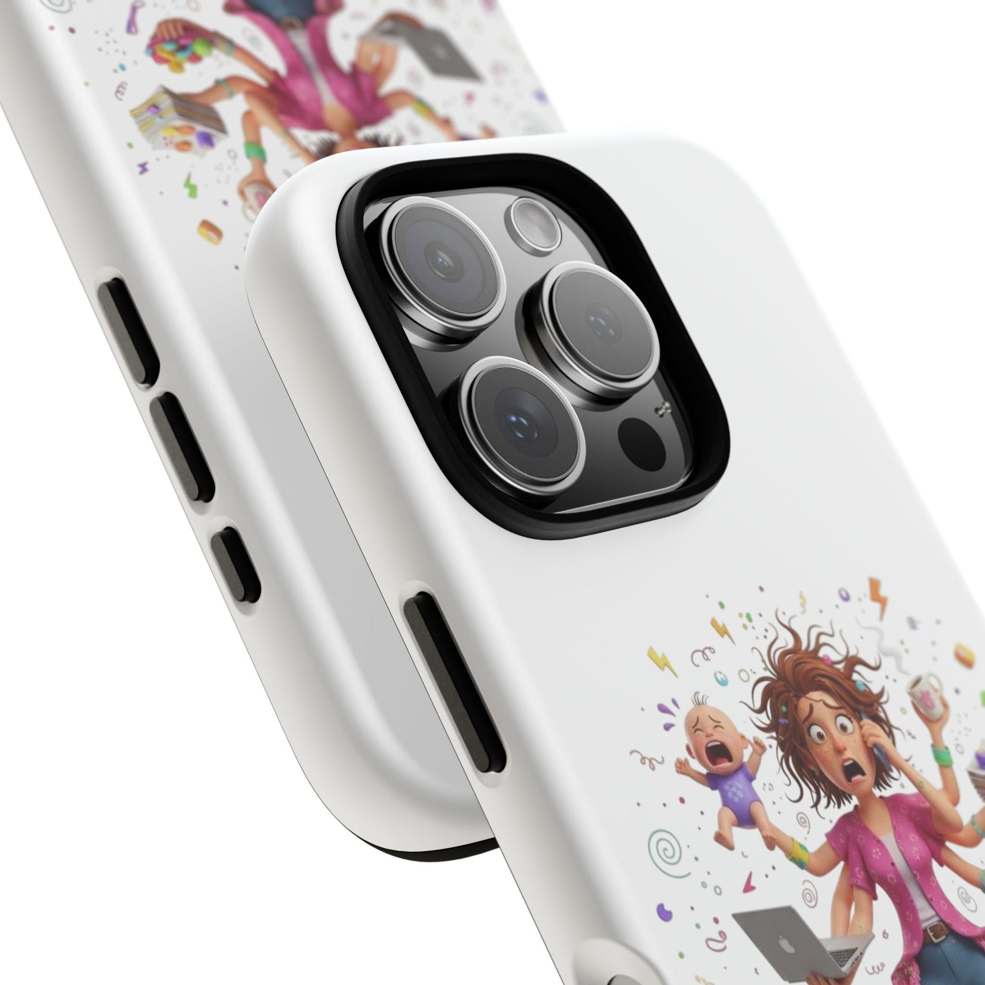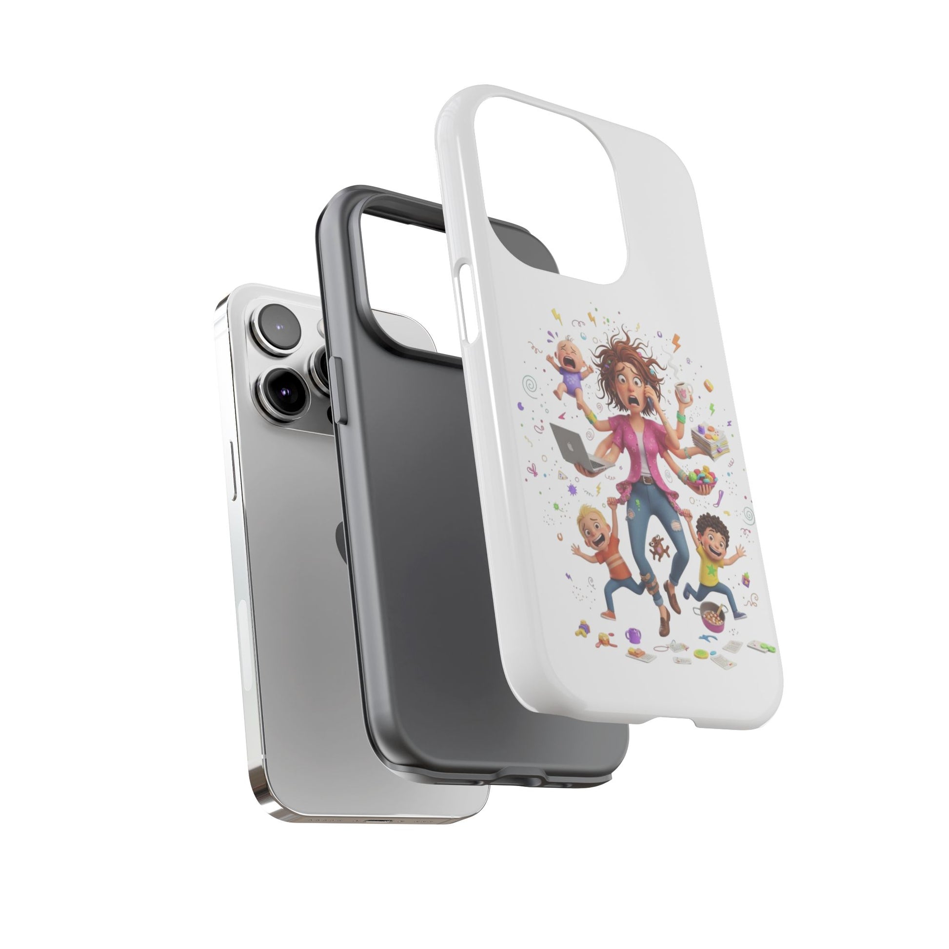 This tough phone case brings calm to chaos. The artwork shows a frazzled parent juggling kids, snacks, and devices — a reminder of everyday bravery. The dual-layer shell cushions against drops while the silicone liner soaks up impact. A 3D wrap print keeps the lively illustration vivid, and UV protection preserves color when you're out and about. Slim enough to slip into a bag, yet rugged enough for playground scrambles, it slips on with open ports for easy access and supports wireless charging. Small handling notes keep the print looking fresh: avoid strong alcohol, prolonged sun, and greasy creams.