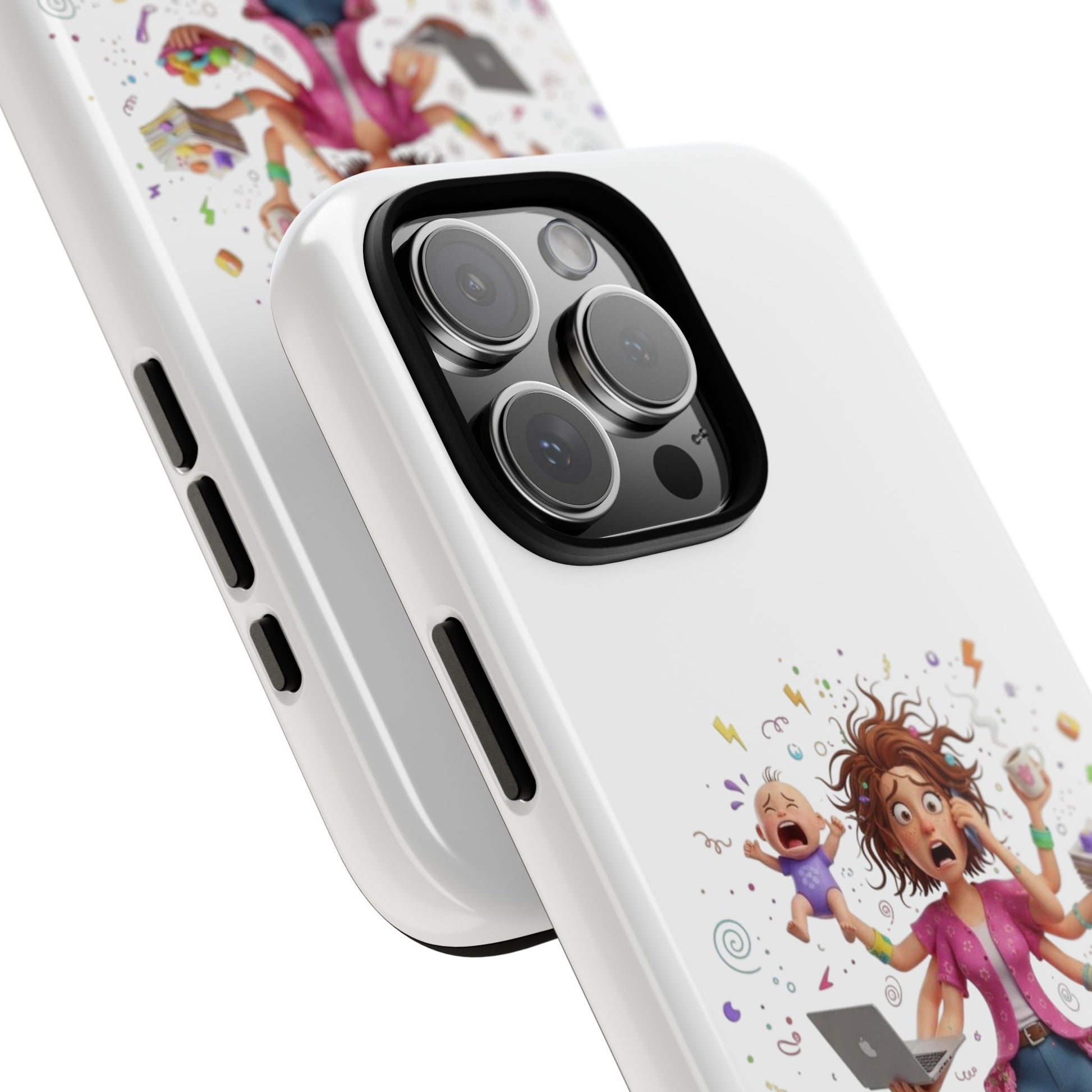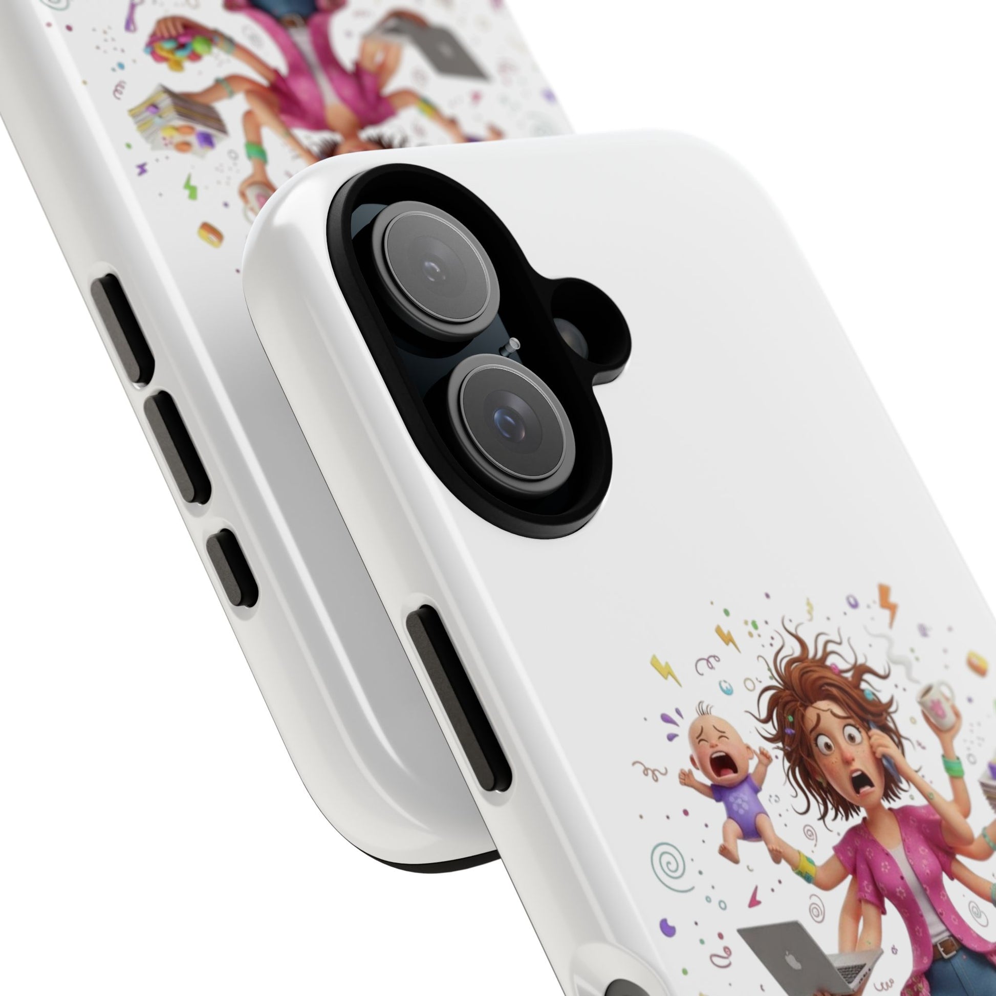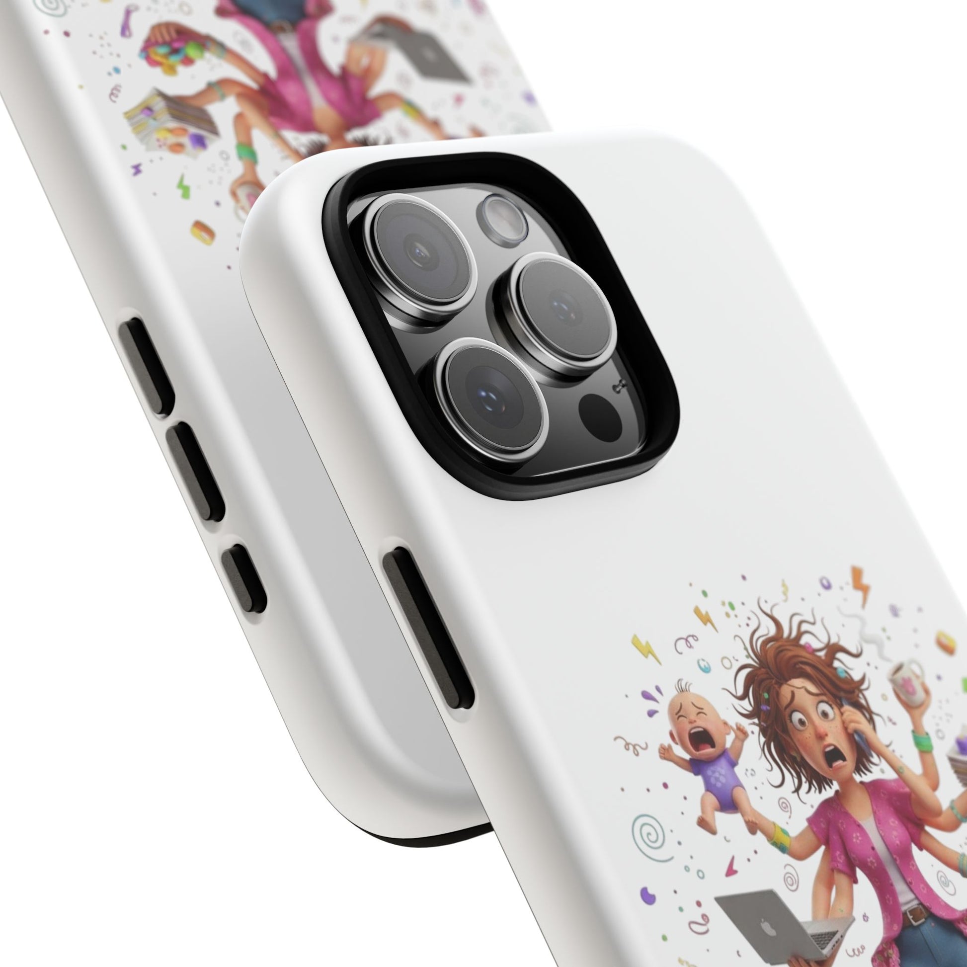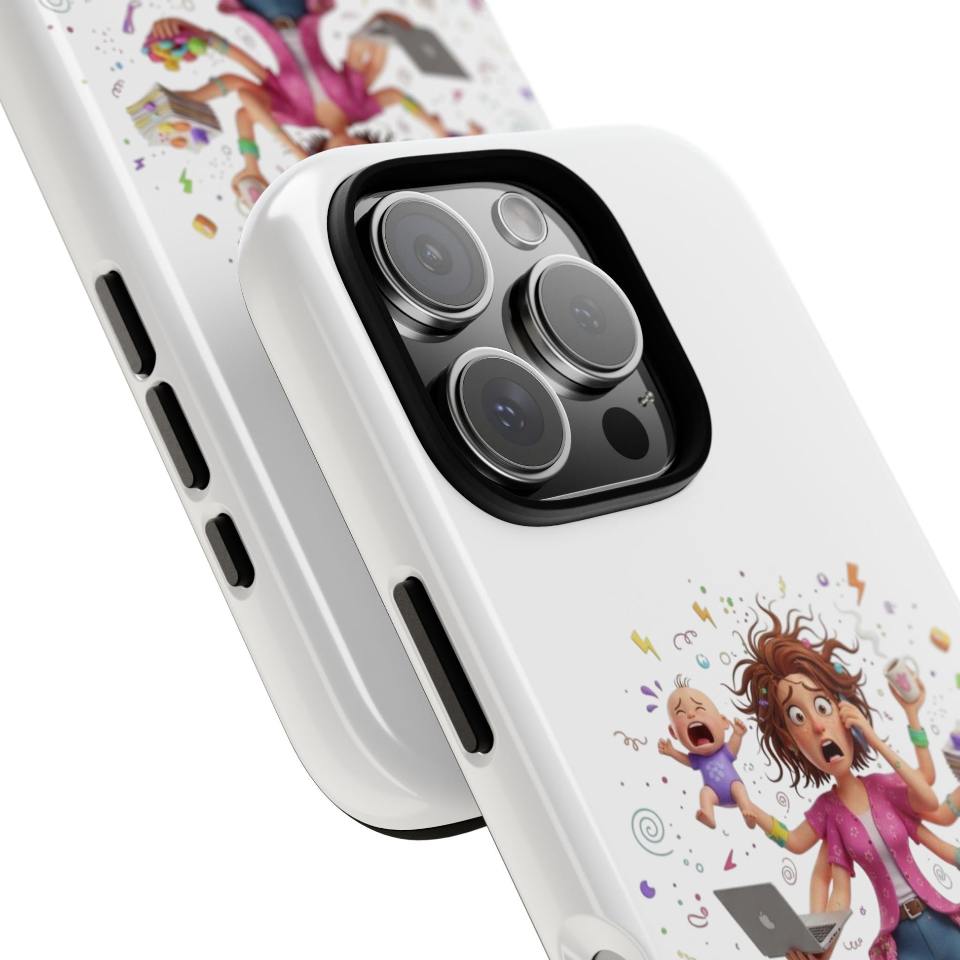 This tough phone case brings calm to chaos. The artwork shows a frazzled parent juggling kids, snacks, and devices — a reminder of everyday bravery. The dual-layer shell cushions against drops while the silicone liner soaks up impact. A 3D wrap print keeps the lively illustration vivid, and UV protection preserves color when you're out and about. Slim enough to slip into a bag, yet rugged enough for playground scrambles, it slips on with open ports for easy access and supports wireless charging. Small handling notes keep the print looking fresh: avoid strong alcohol, prolonged sun, and greasy creams.