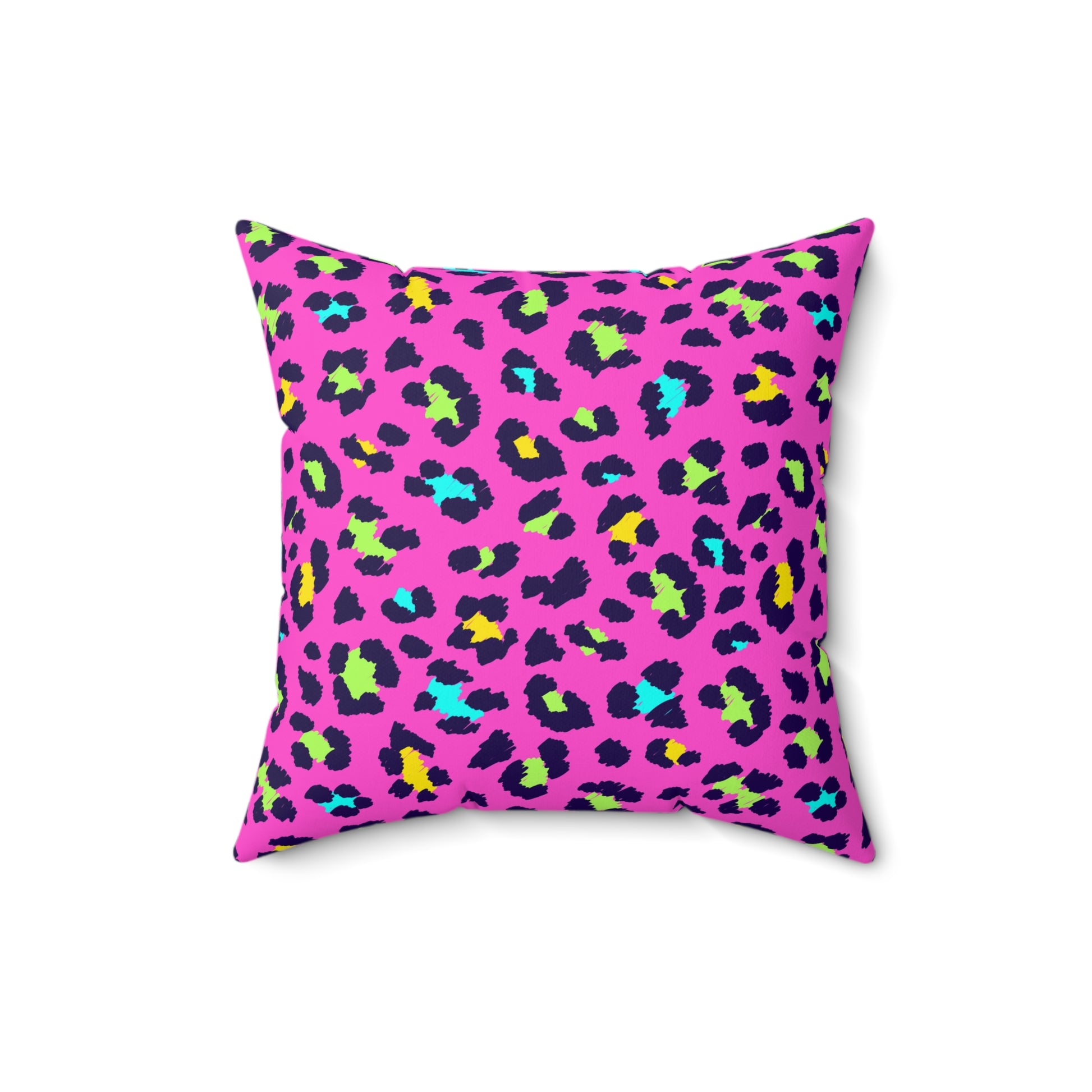A vibrant square pillow that brings bold energy and playful flair to any room. The double-sided print shows a neon-inspired leopard pattern in hot pink, electric cyan, lime, and sunny yellow—colors that pop against a bright magenta background. The spun polyester cover keeps the print crisp and wrinkle-free, while the recycled polyester insert ships vacuum-packed and fills out the cover for a plush, voluminous look once assembled. Tuck it on a sofa, lean it against a headboard, or layer it in a reading nook to inject fun, retro-modern color into everyday spaces.