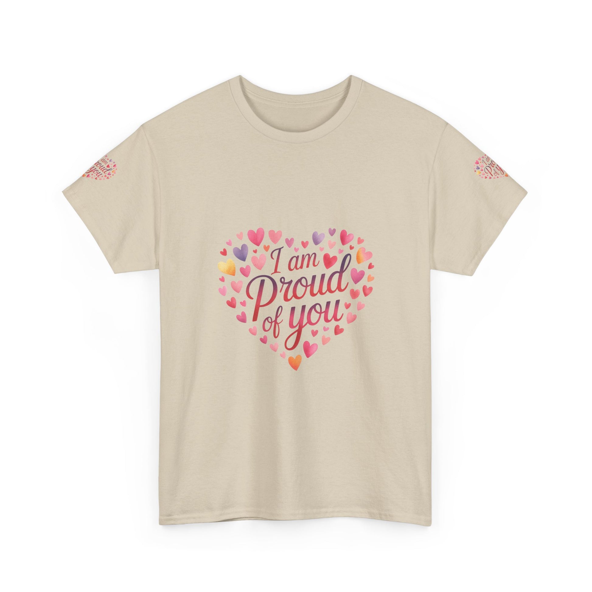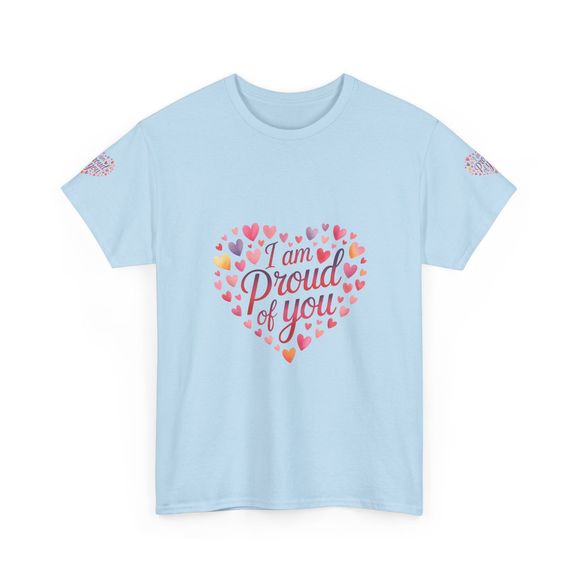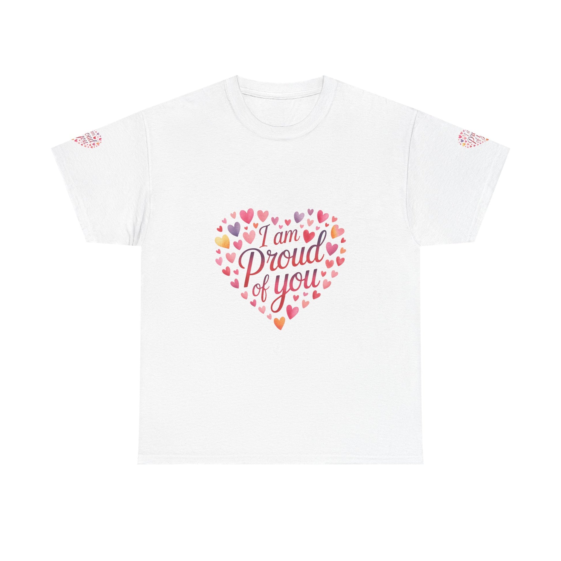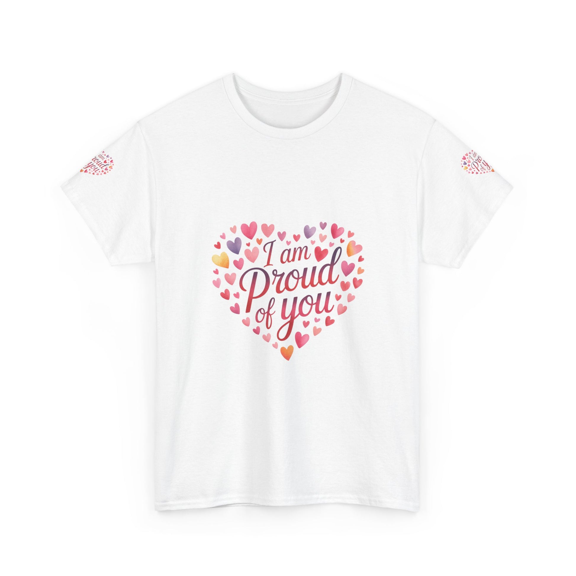 A soft, everyday tee that quietly celebrates someone you care about. On a clean white canvas a cluster of tiny pink and coral hearts forms a warm heart shape around the hand-lettered message “I am proud of you.” The gentle colors and simple layout make this shirt feel like a supportive hug — wearable encouragement for school pickups, therapy appointments, graduations, or slow mornings at home. Lightweight but sturdy, the fabric holds prints well and keeps its shape wash after wash. Wear it to show steady support without shouting, or gift it to someone who could use a little cheering-on in their day.