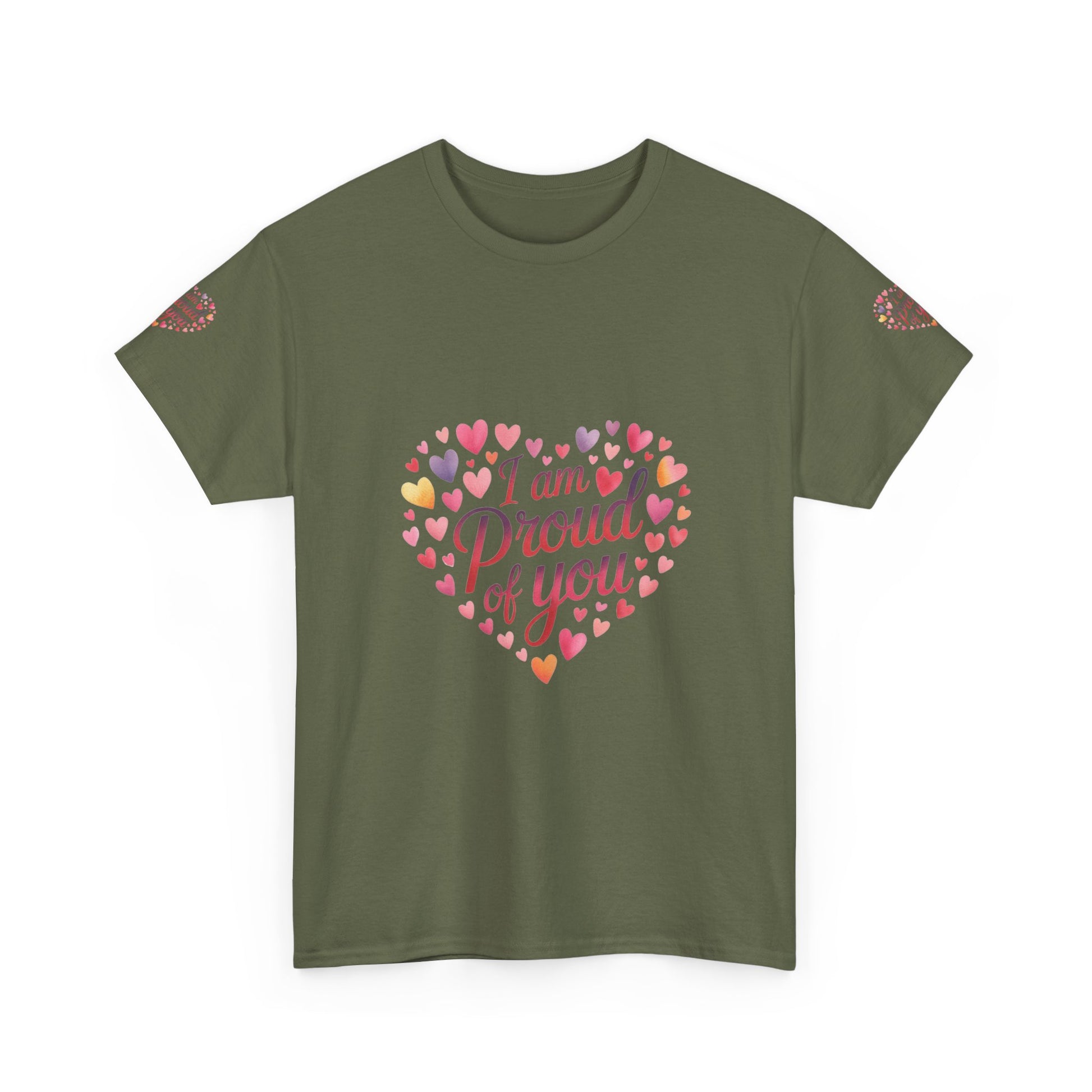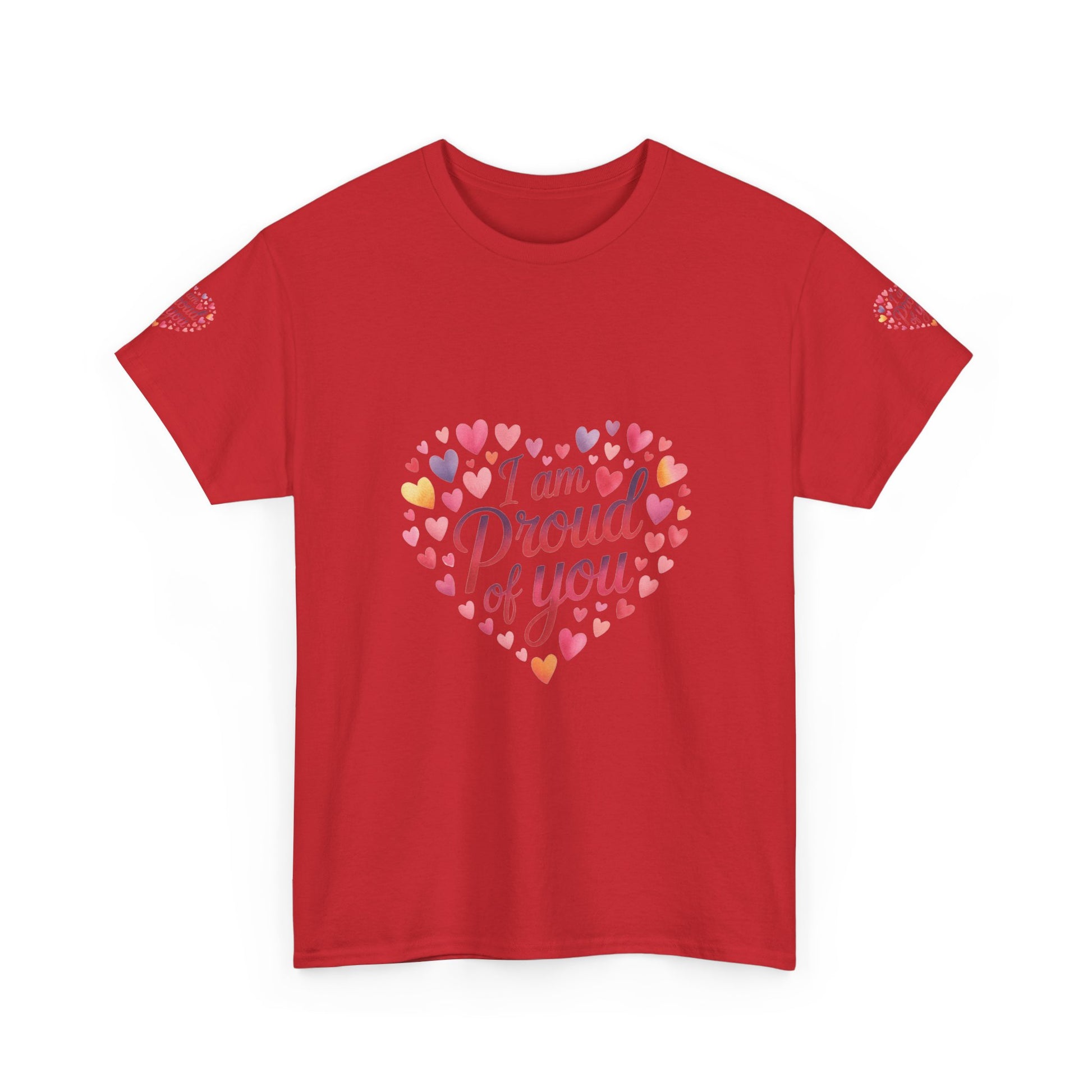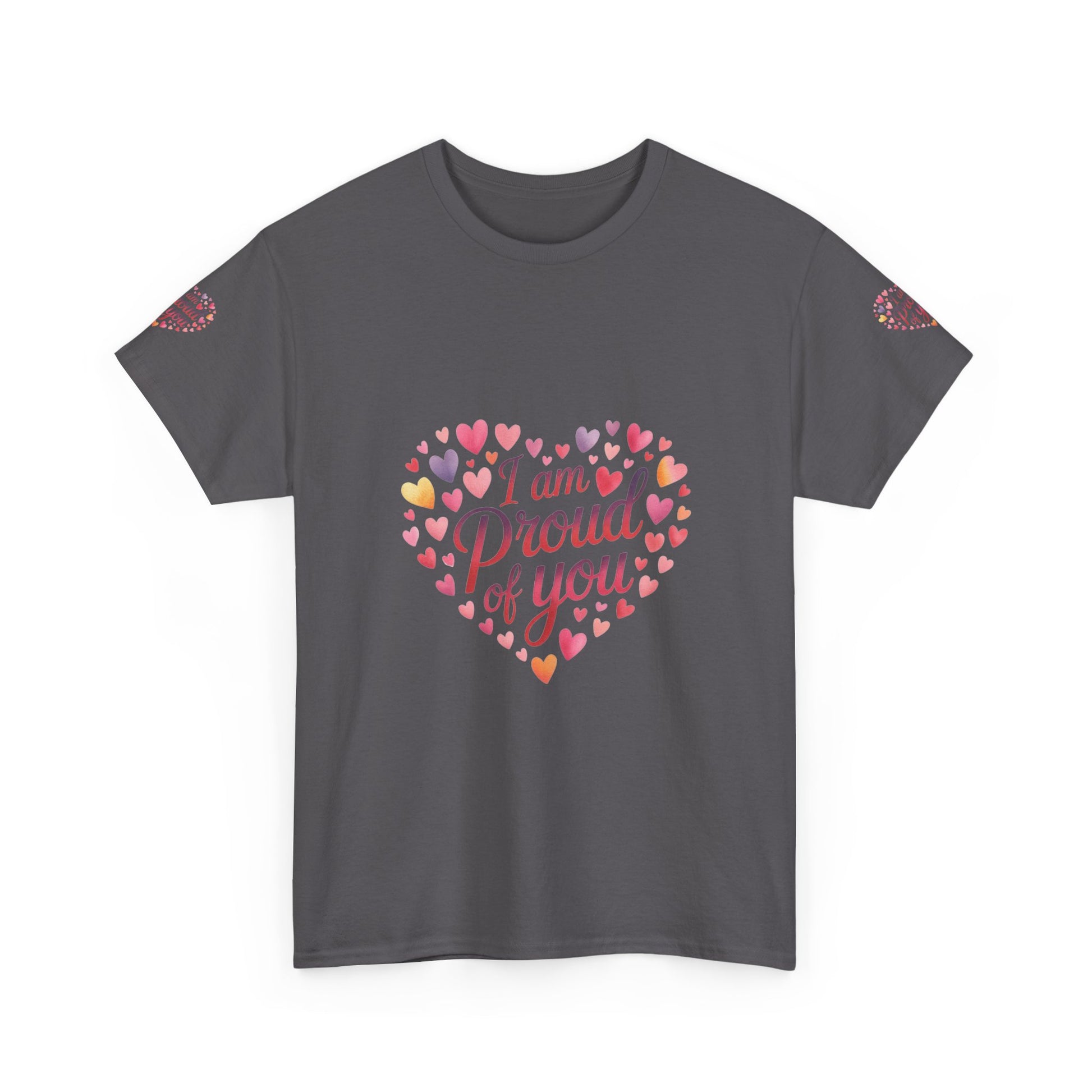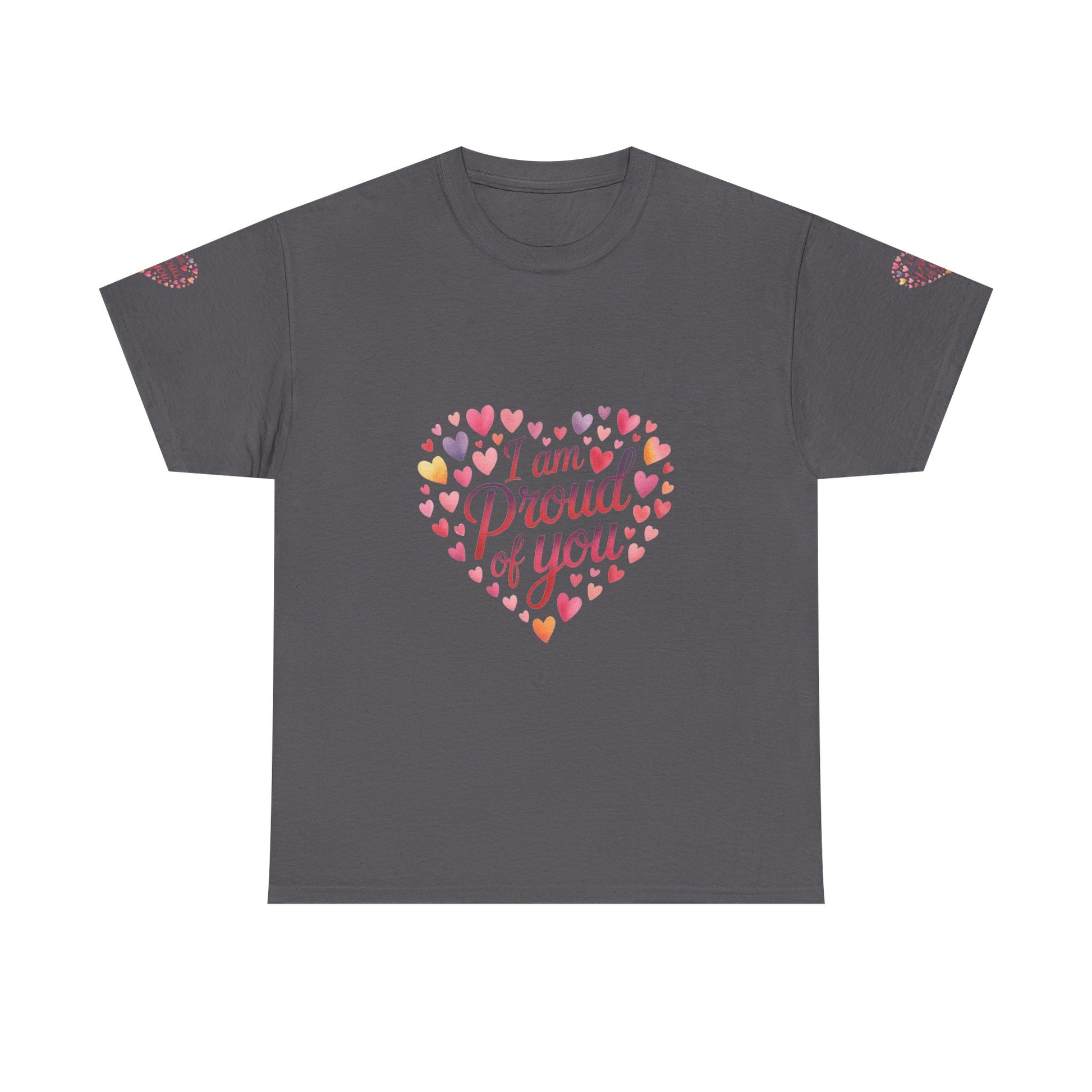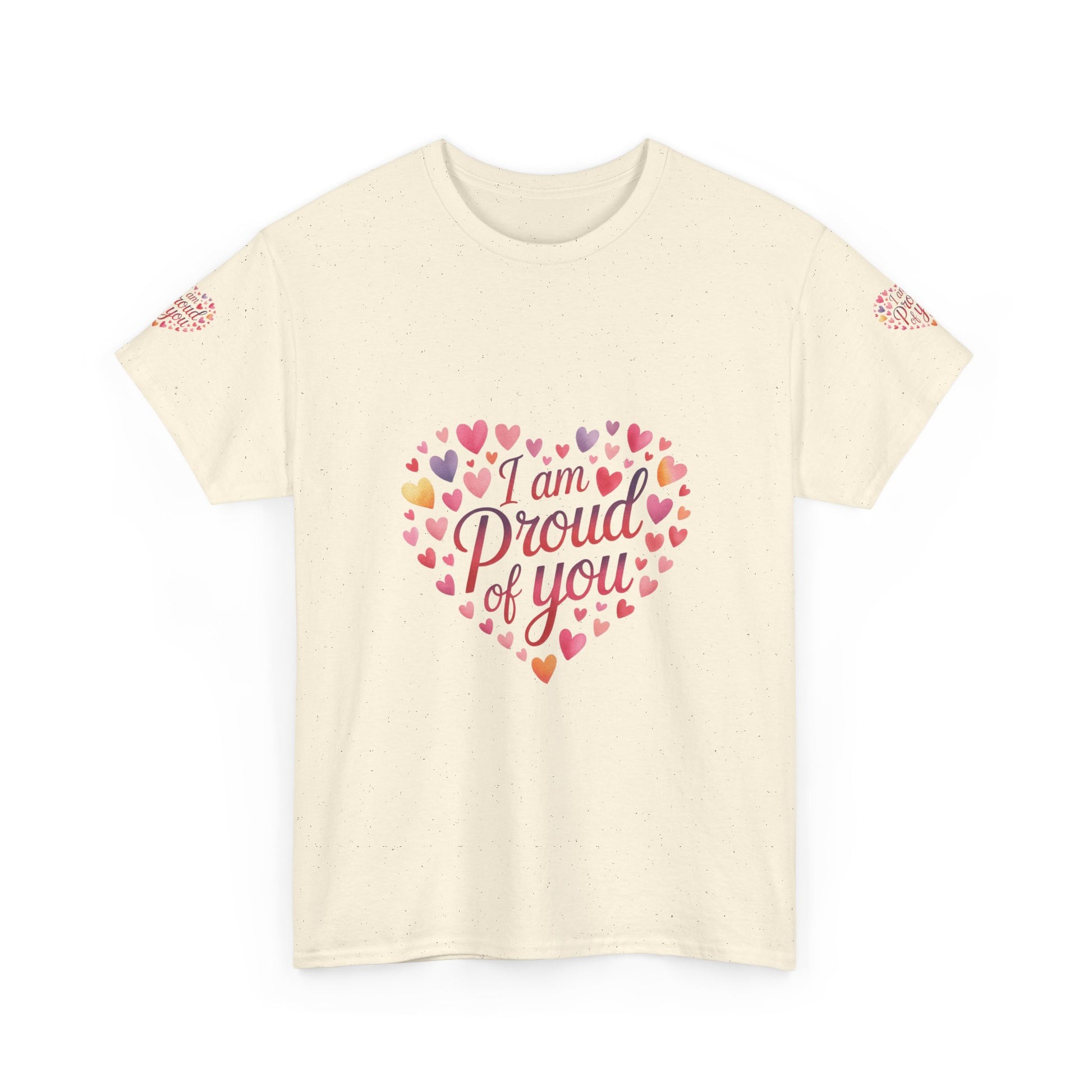 A soft, everyday tee that quietly celebrates someone you care about. On a clean white canvas a cluster of tiny pink and coral hearts forms a warm heart shape around the hand-lettered message “I am proud of you.” The gentle colors and simple layout make this shirt feel like a supportive hug — wearable encouragement for school pickups, therapy appointments, graduations, or slow mornings at home. Lightweight but sturdy, the fabric holds prints well and keeps its shape wash after wash. Wear it to show steady support without shouting, or gift it to someone who could use a little cheering-on in their day.
