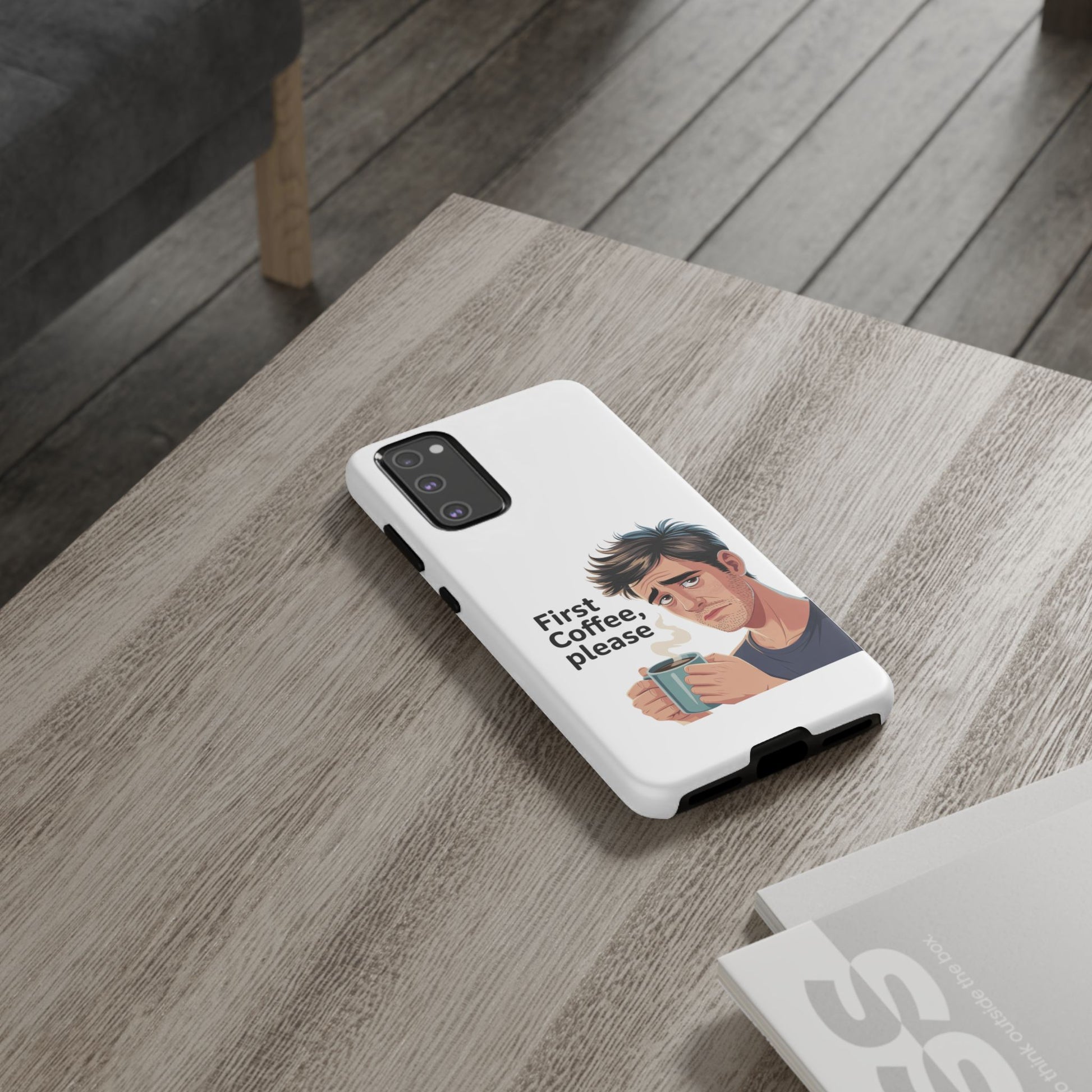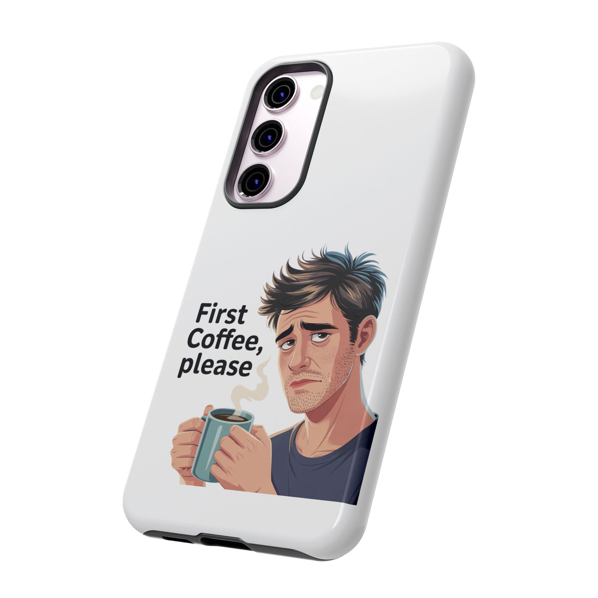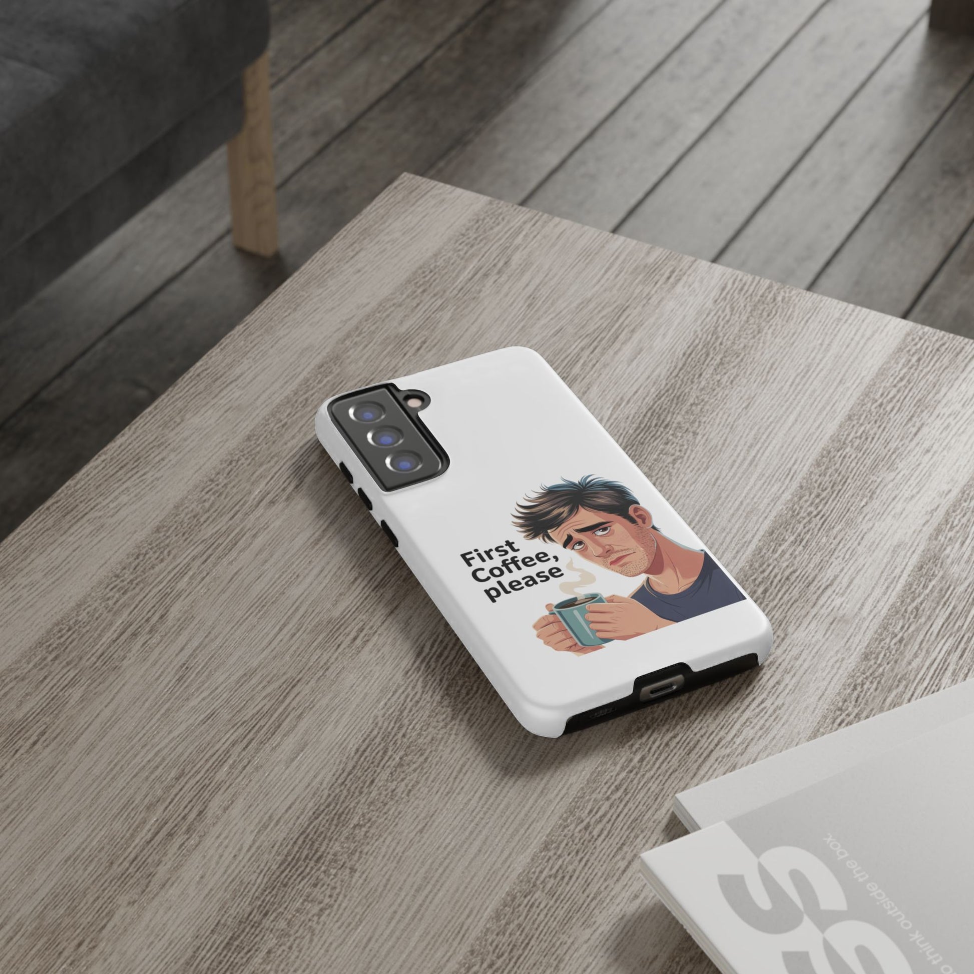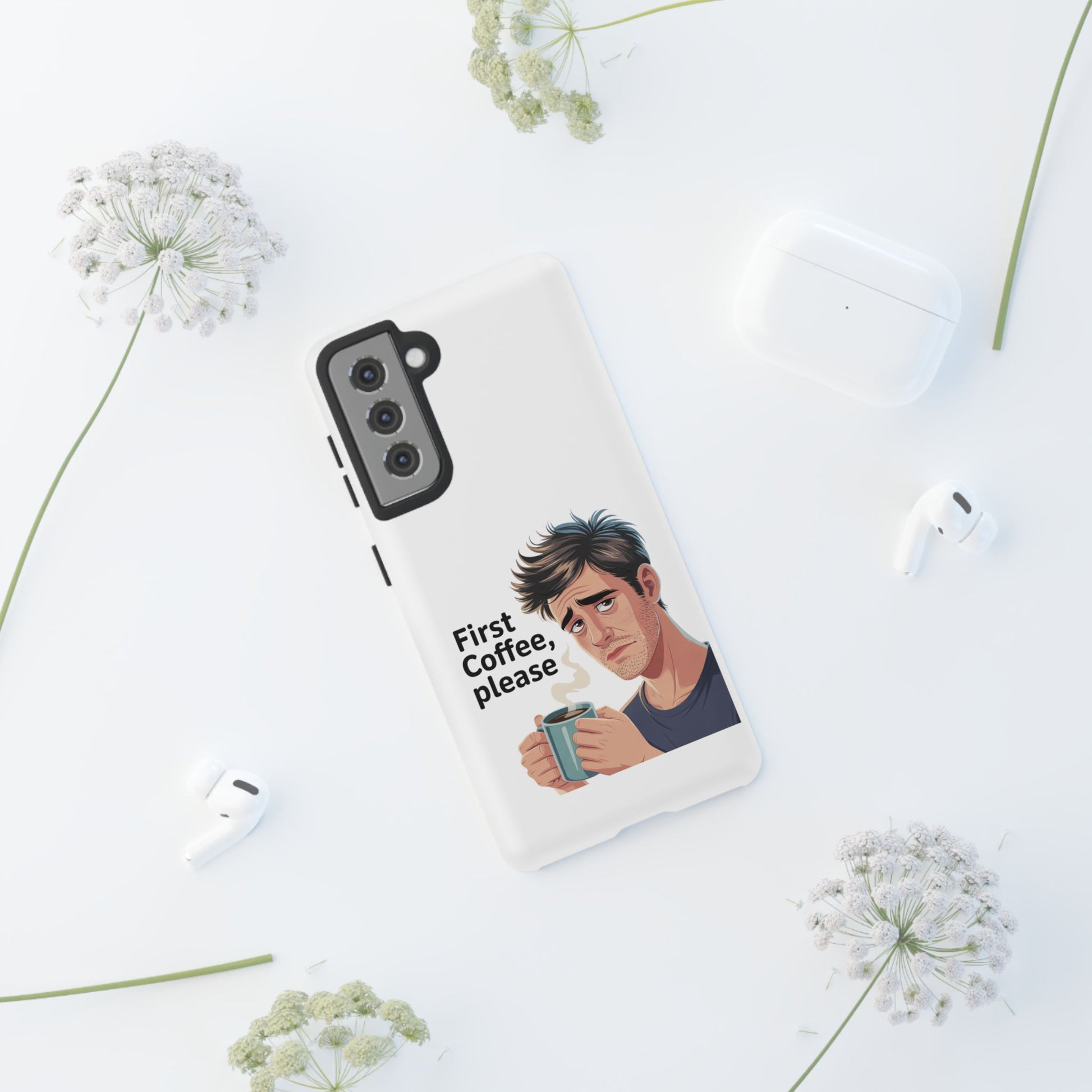 Samsung Phone Case – “First Coffee, Please” Funny Coffee Lover Protective Case