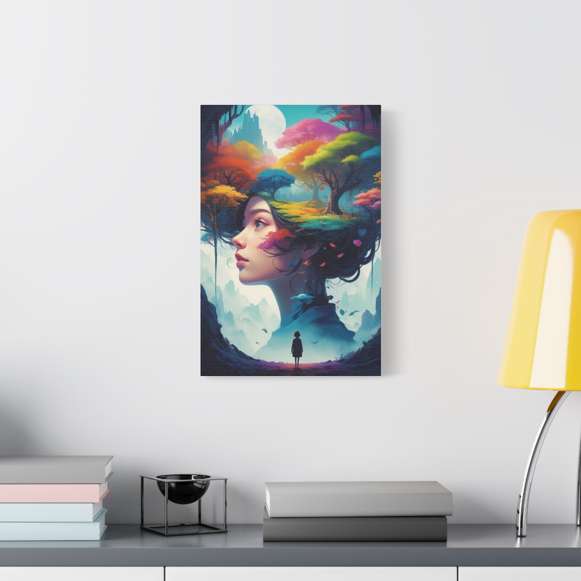 This stretched matte canvas brings a dreamlike scene into your space — a serene profile of a woman whose hair blooms into vivid, cloudlike trees and floating petals. The ultra-fine matte finish softens glare and deepens color, letting the layered blues, pinks and golds feel almost luminous while preserving delicate brush-like details. Lightweight yet sturdy, the canvas arrives gallery-stretched over a slim 1.25" pine frame with soft rubber dots and a ready-to-hang back, so it slips onto a wall with clean, confident presence. It anchors quiet corners, reading nooks, or creative studios with a gentle, poetic energy — like a window into a small, personal world where nature and imagination meet.