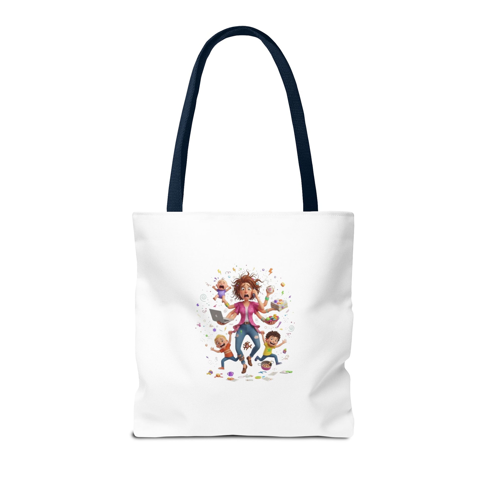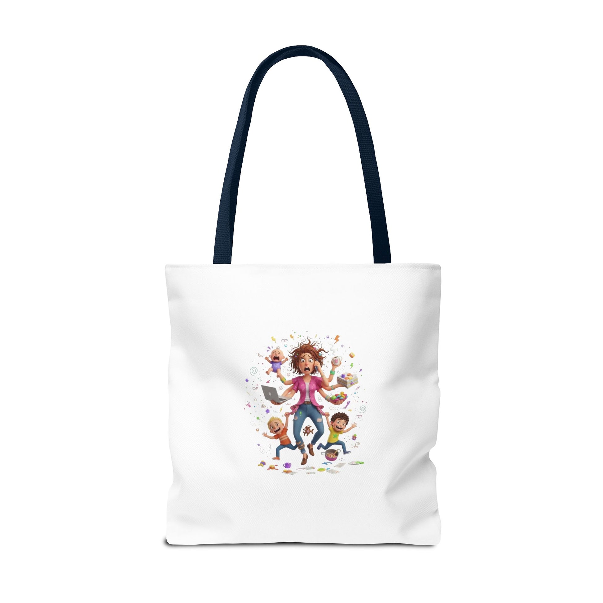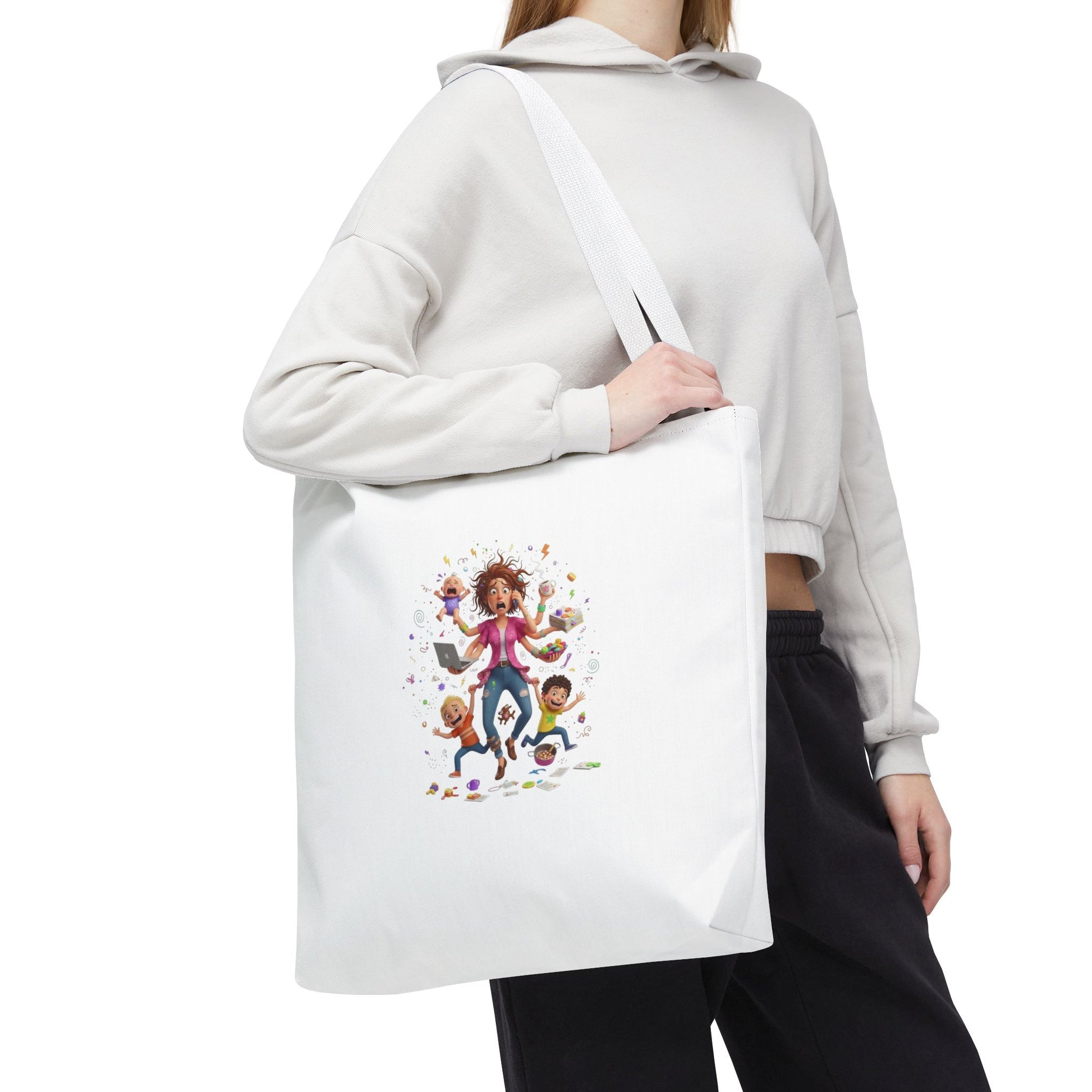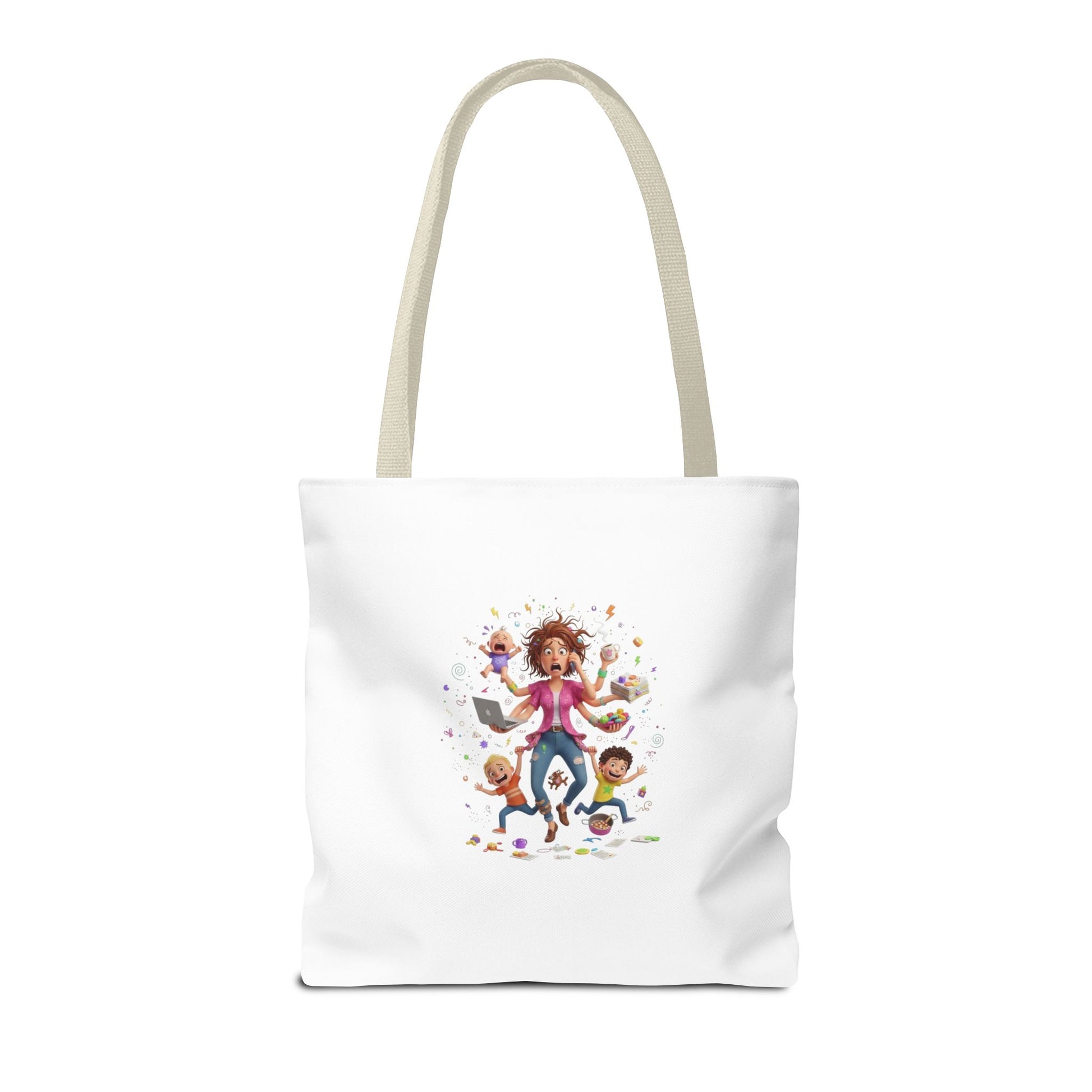 This roomy tote brings playful chaos into everyday life with a bright, illustrated scene of energetic kids and a frazzled-but-loving parent mid-adventure. Lightweight yet durable polyester holds its shape and shrug off spills, while boxed corners and reinforced handle stitching give the bag real carrying confidence. Choose a handle color to match your style and carry it to school drop-offs, library runs, or neighborhood errands — it reads like a little story about life with littles and makes the daily hustle feel a touch more joyful.